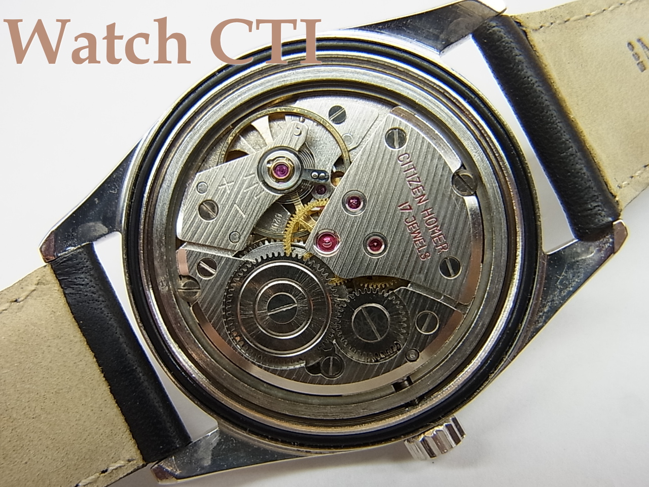 入荷しました現品に関しましては、スクリューバックケースを採用した後年の輸出仕様となり、ホーマーの中期ムーブメントがそのまま搭載された仕様ですが、最初のニューマスターのデビューは1960年11月のことでした。21石手巻モデルあり、当時は「ホーマー」の銘はどこにもつかわれていませんでした。ニューマスターは対米輸出を念頭に開発されたモデルであるといわれており、実際この現品も、文字板に表示される防水表記がWATER PROOFであったり、耐震表記もSHOCK PROOFとなるなどシチズンが国内で使っていたあのPARA WATERやPARA SHOCKでない点から輸出仕様で間違いないと思います。