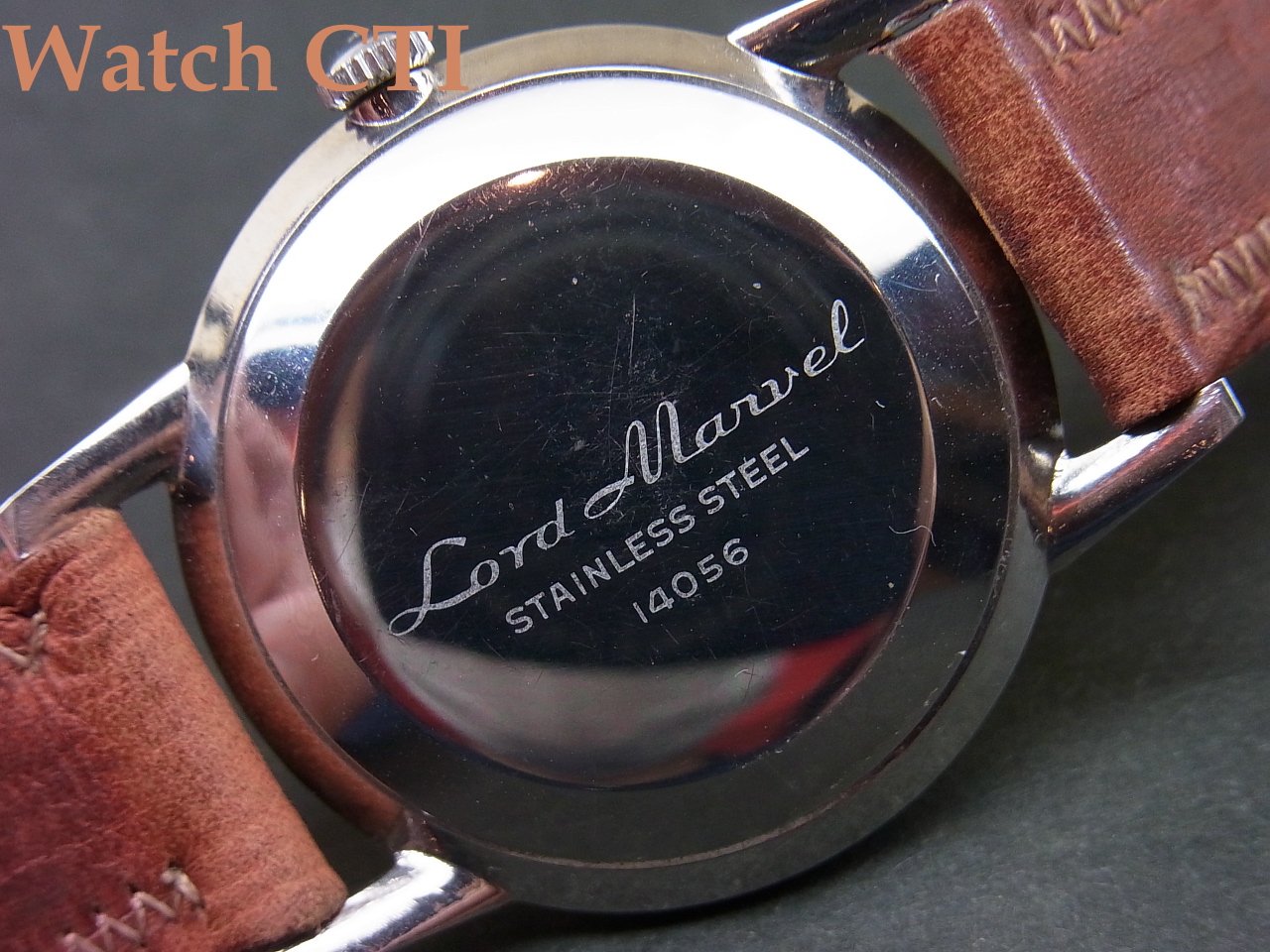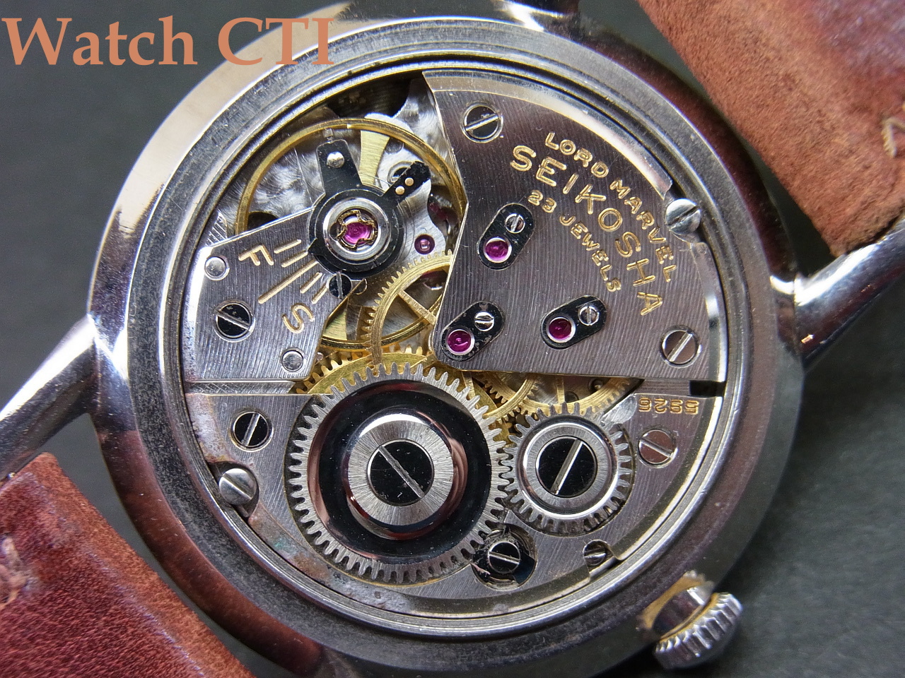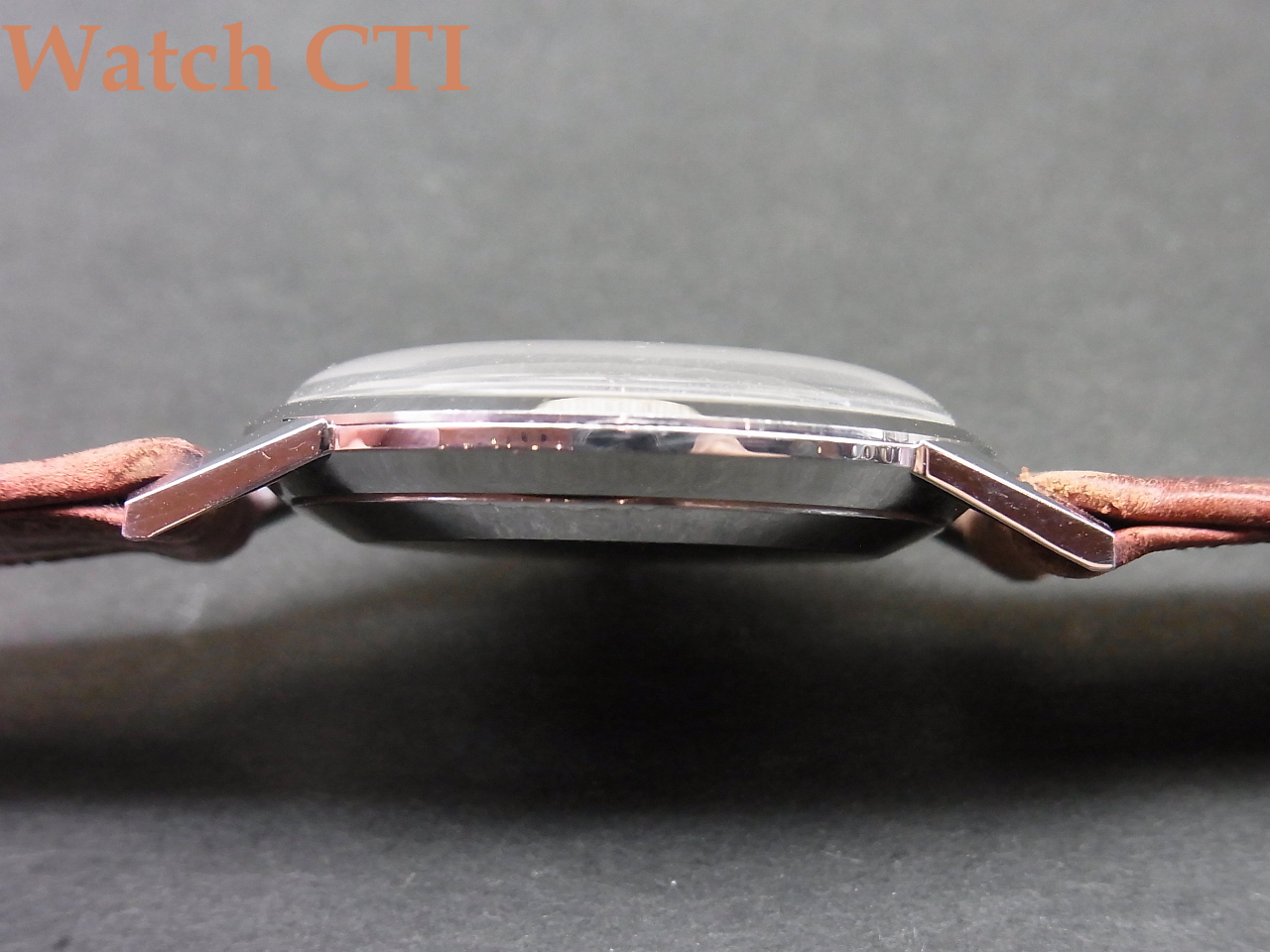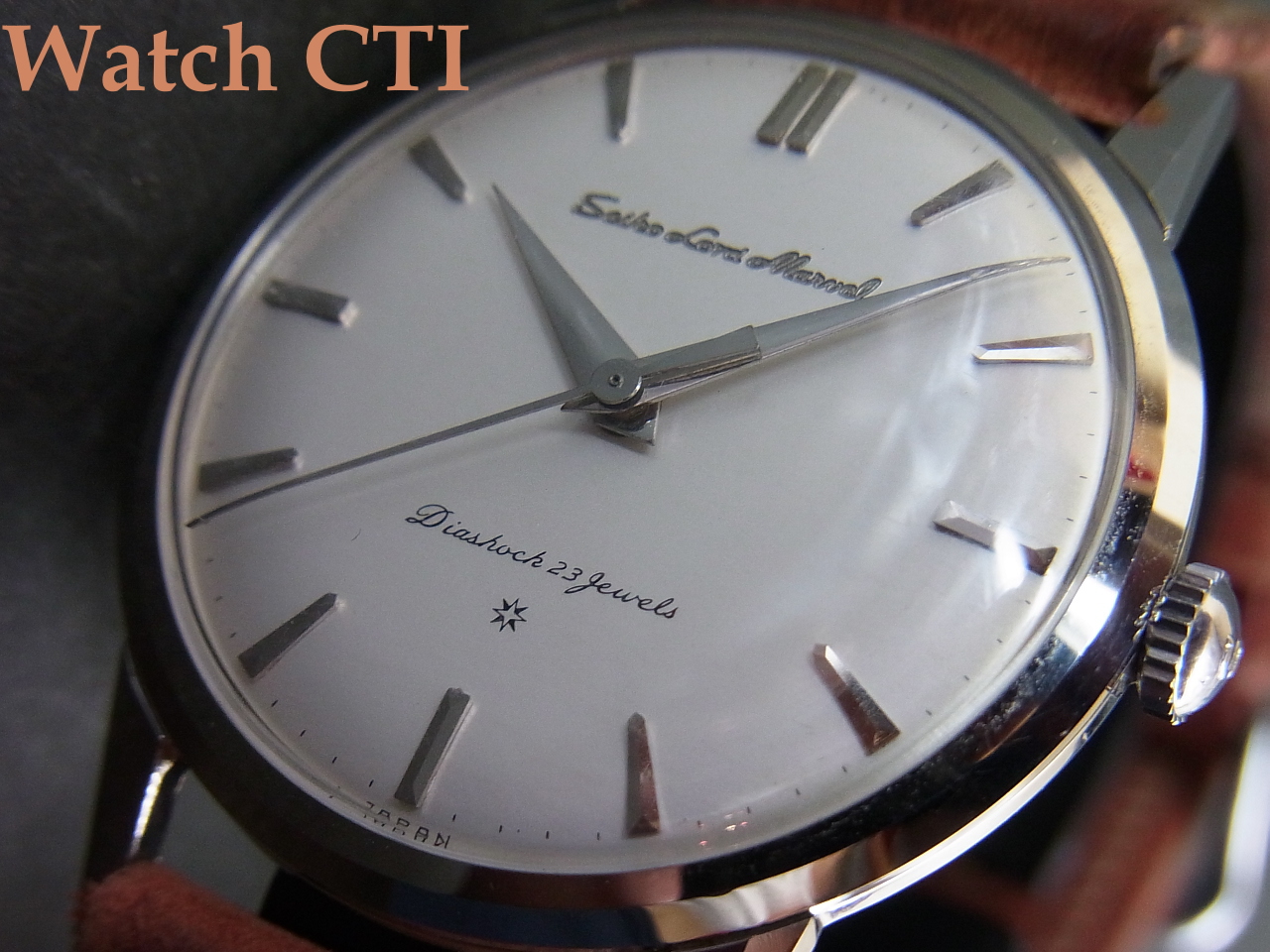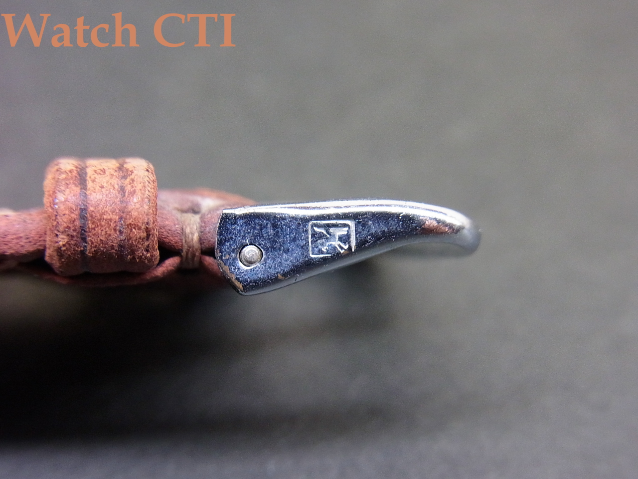 *それから…..付属のベルト/バックルについてですが、通常ですと、販売に当たり現行の新品ベルトに付け替えるのですが、この現品が発売された当時の品の可能性が考えられるのです!やれておりますが当時の高級仕様に付いていたと思われる網目状のステッチ仕上げで、SEIKOの銘が当時の独特な書体で綺麗に裏側にエンボスされています….そ・し・て・付属のバックル。銘無しの汎用品?かと思えますが、その狭いサイド面に、なんと、あの「鶴マーク」が刻印されております!!!嬉し~~~(マニア)