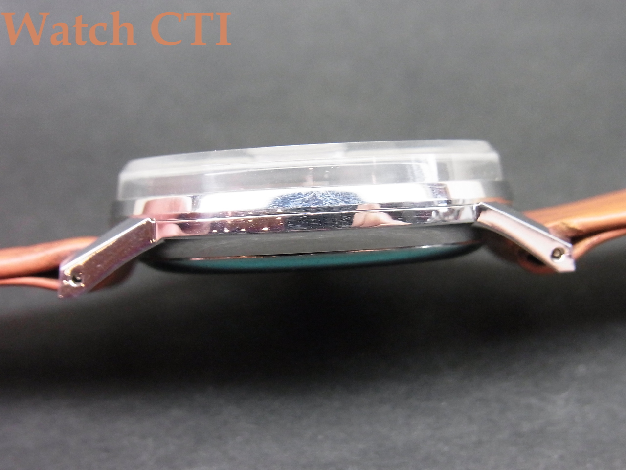 ☆ケースサイズに目いっぱい入れた文字板に対応するために、、とっても細幅なベゼルに喰いつく純正風防はシリンダーのごとく屹立してますね!!