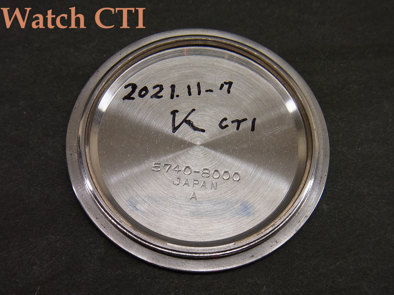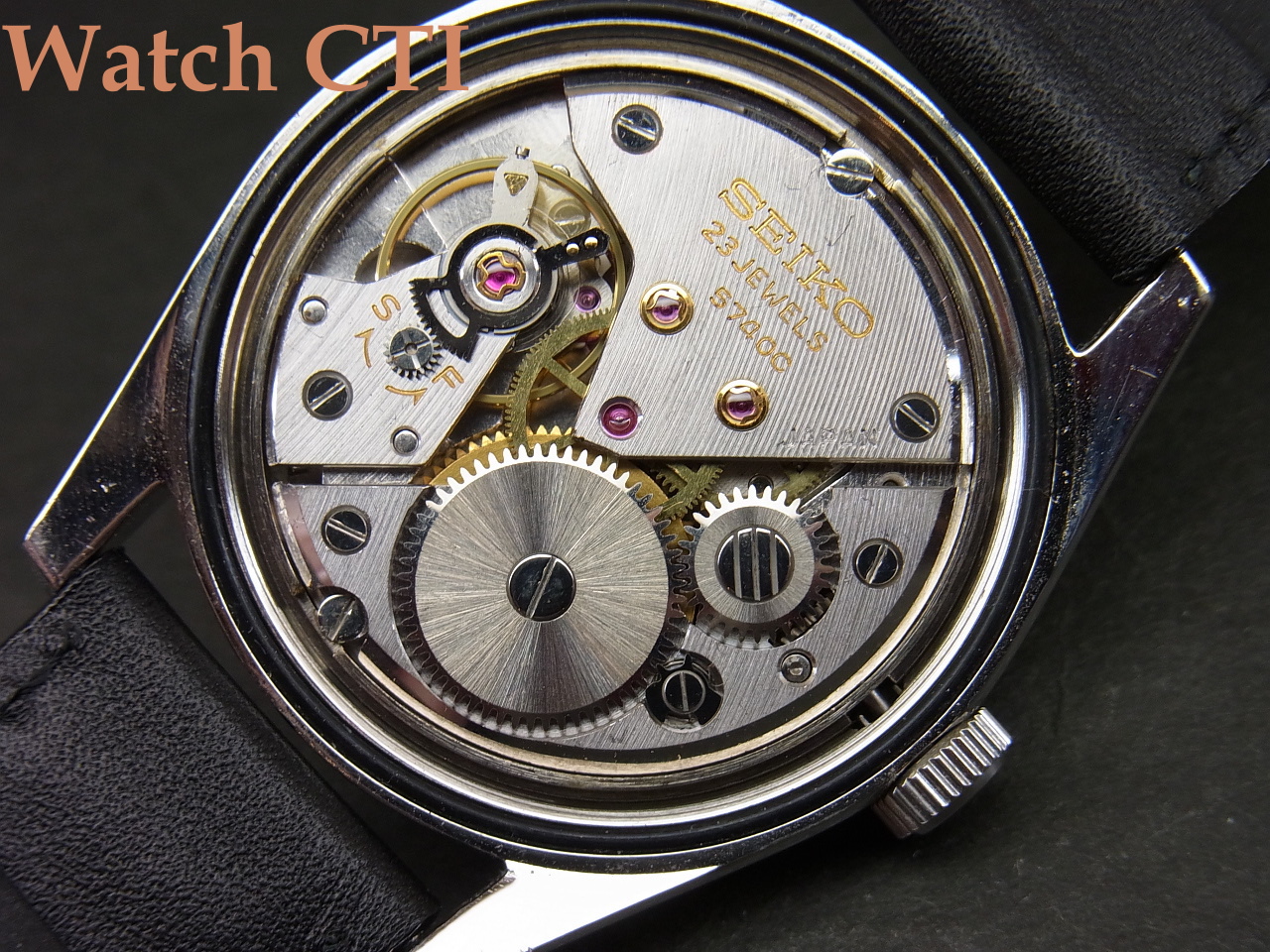 この、キャリバー5740Cですが、当方で過去に確認している一番古いケースシリアルは1966年10月製造でして、そこに搭載されていた5740Cは本来必要のない秒針規制バネの調整”穴”が3番受に開けられたままで(5740Bまで搭載されていた秒針規制は5740Cではついてません)した。かつ、地板に彫られた銘に入れられた色は「金色」で地板表面の仕上げ模様は極細目で入っていました。