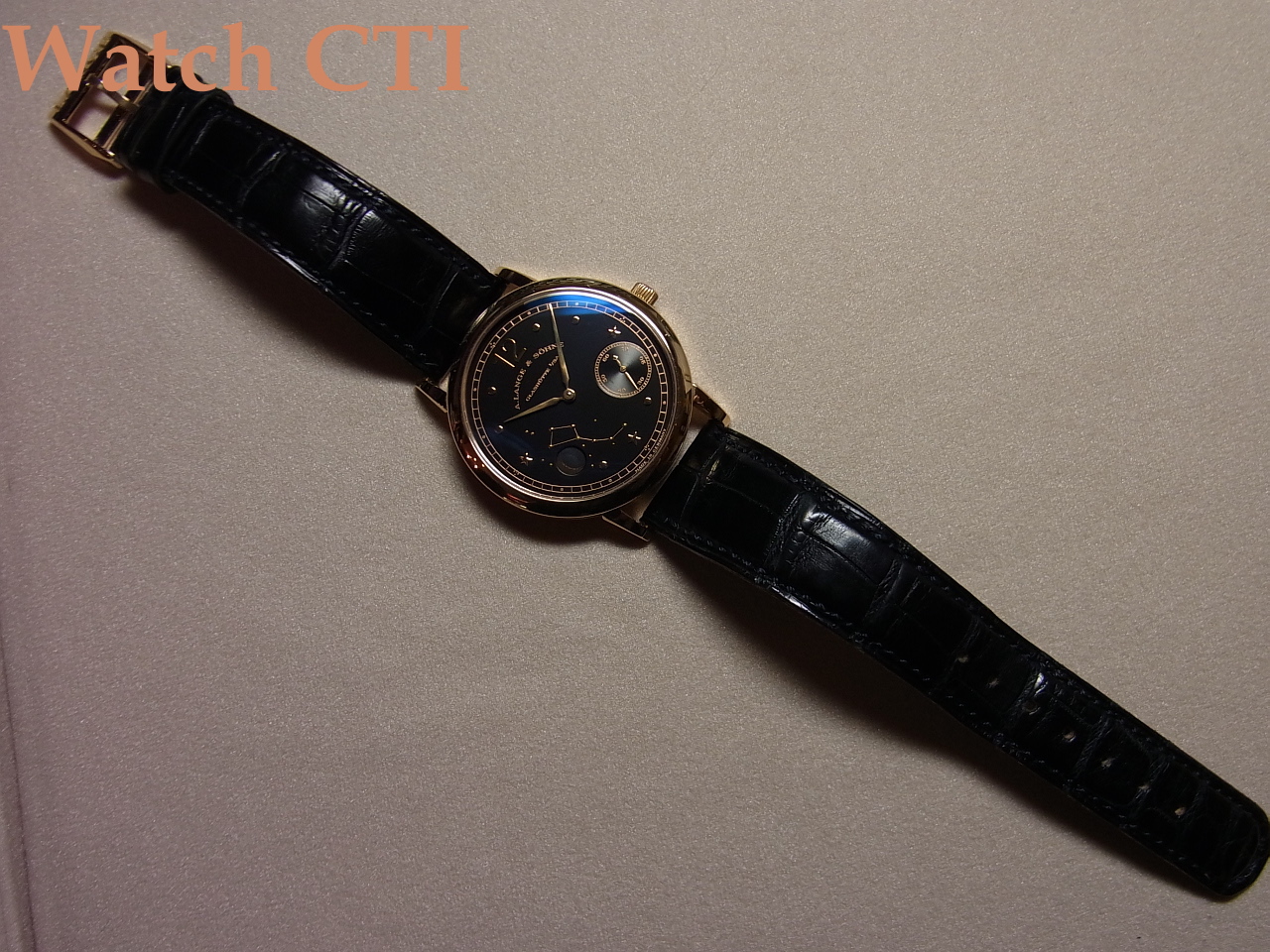 ピンクゴールドとマットブラックのダイヤルコントラストが非常に美しく、ダイヤル上に描写されるアプライドの星空とその間に浮かぶムーンフェイズとのバランスが、正に溜息が出るくらいに「美しい」です。