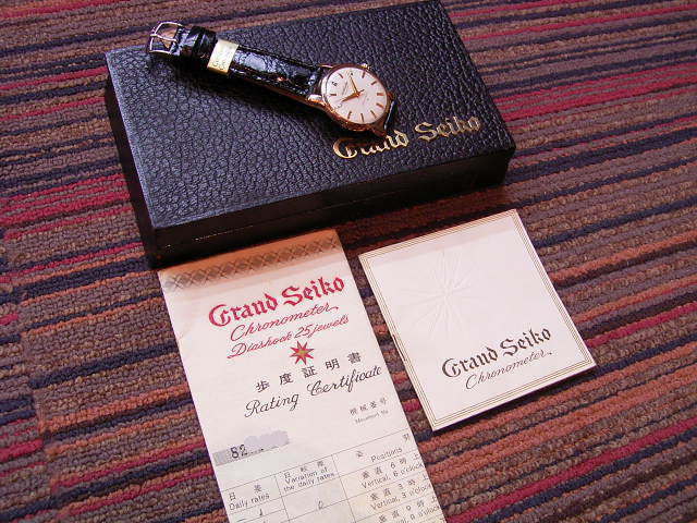 初代グランドセイコーの後期アップライトロゴのモデルです。大変希少なオリジナルで添付されていた歩度証明書が付属しており、もちろん機械番号もマッチしております!また、やはり純正で添付されていた取扱説明書と純正の化粧箱(内箱のみ)付属しており、資料的な価値も素晴らしいものがあります。