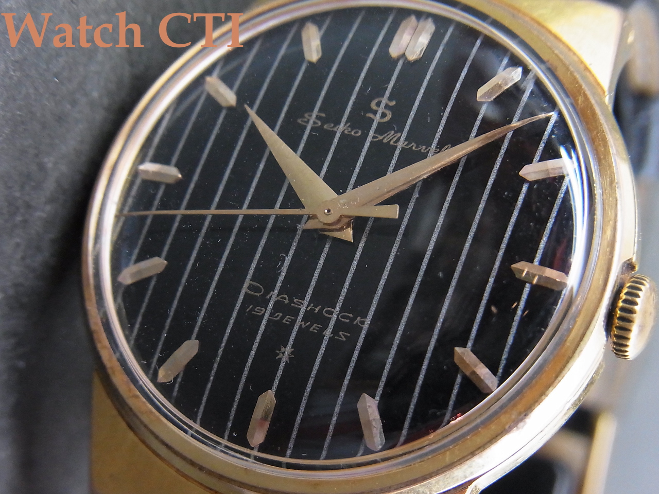 *GPケースの常で使用に伴う経年変化でケースエッジ部分に金メッキの剥離が出てきますが、当個体も非常に僅かではございますが、ベゼルやラグのエッジにございます。かなりの軽度なもので、あからさまにベースメタルの真鍮が露見している感はございません!リューズ下4時位置くらいの側面/ベゼルの箇所にちょっと目に付く当たりが見られる箇所以外に大きな瑕疵は無いようです。