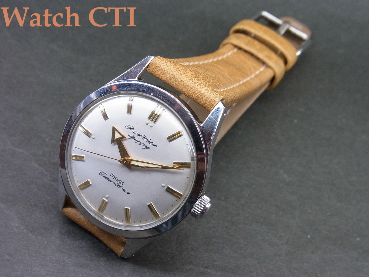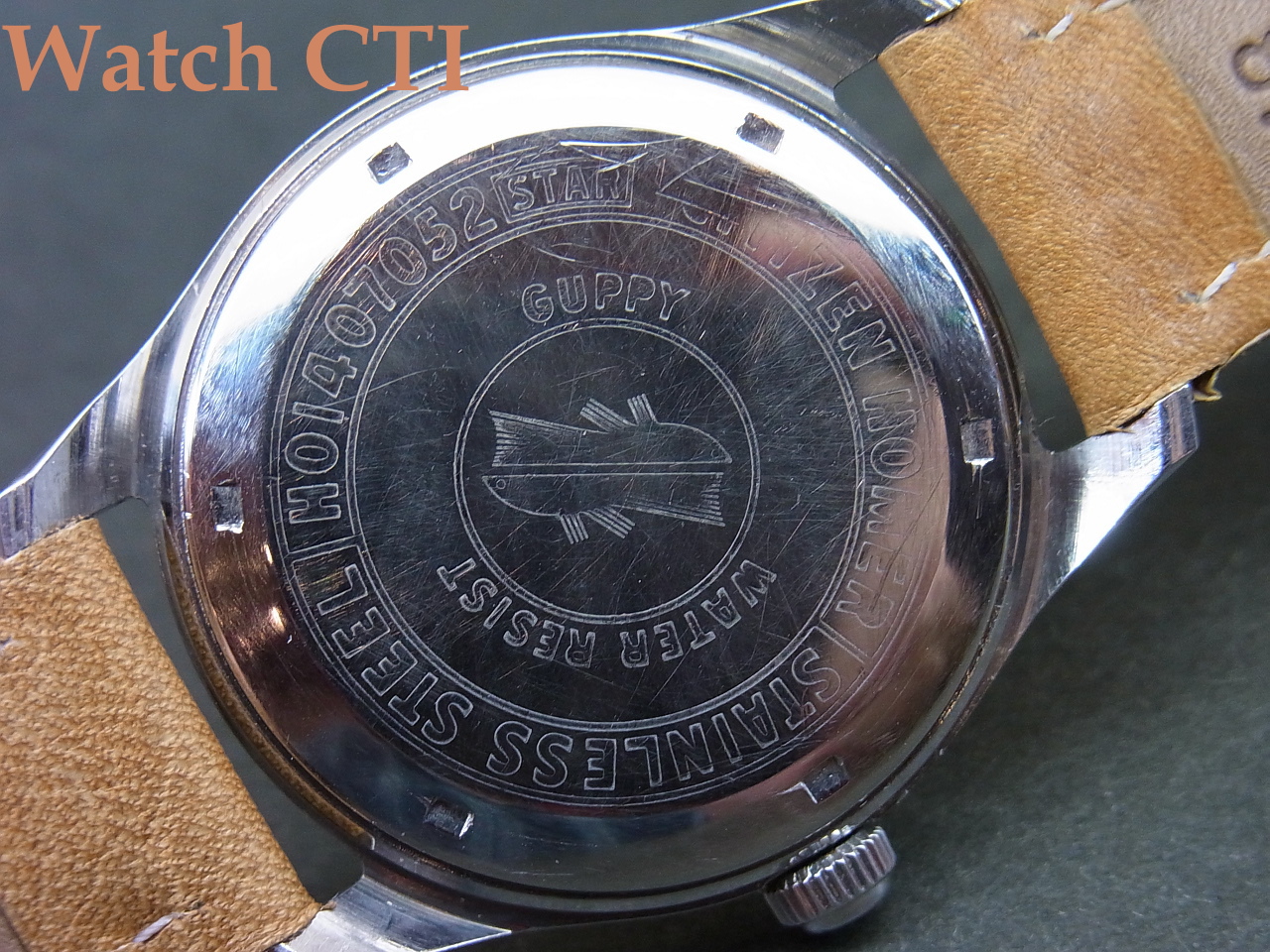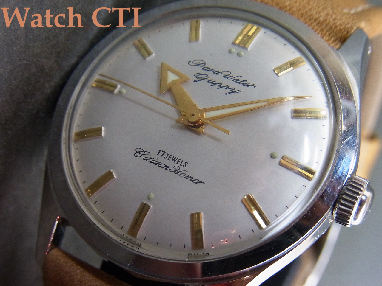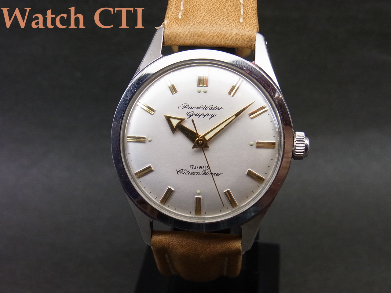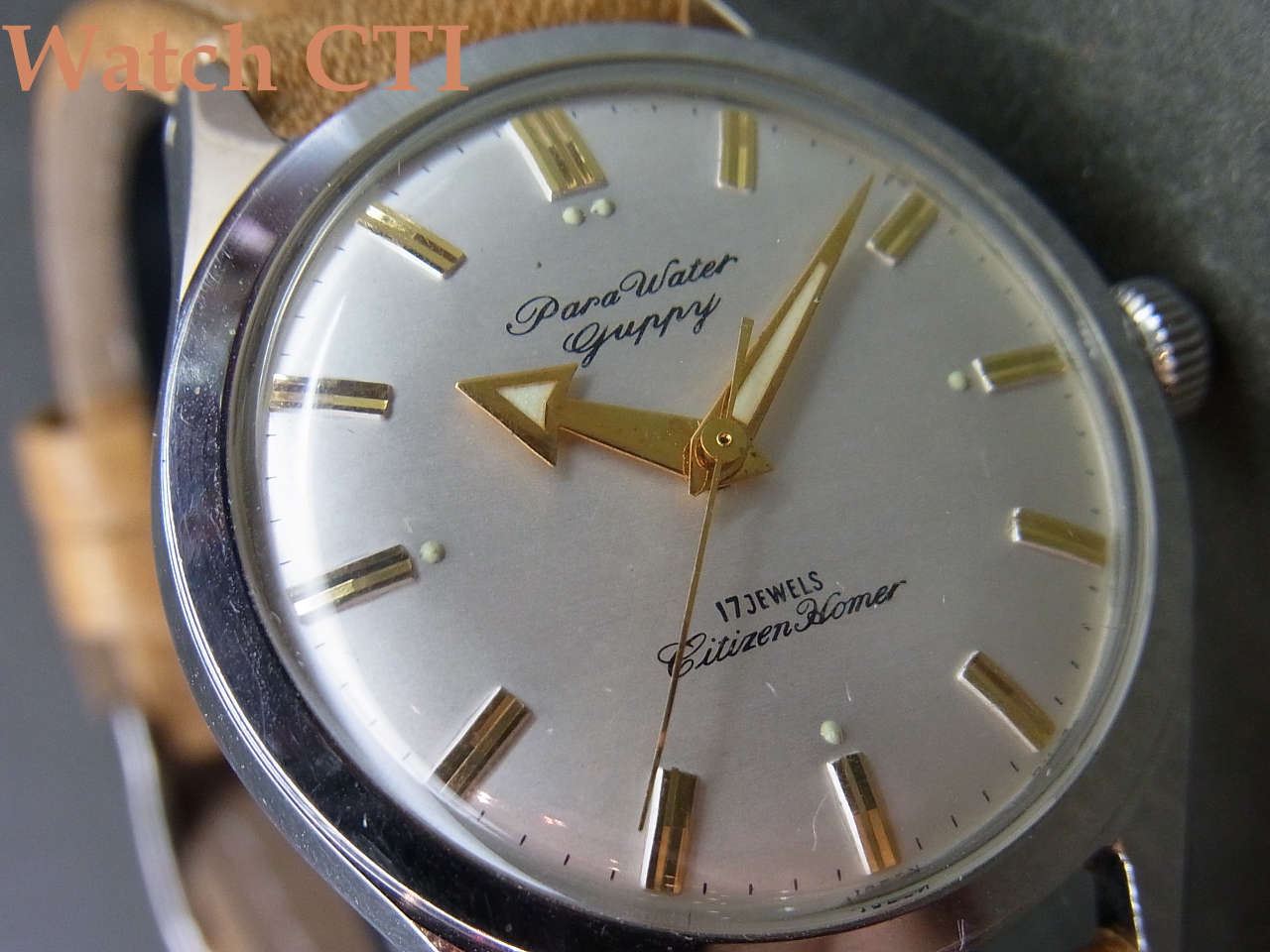 *という訳で、機械は名機ホーマーなので須賀、防水を「売り」にするためにHomerの銘はなんと6時上にかなり控え目にプリントされておりまして…12時下には、まずPara Waterbぽうすいで防水ケースを謳い、次いでGuppy銘と言う熱帯魚の銘で防水イメージを更に高めるという戦略的製品と言えましょう!