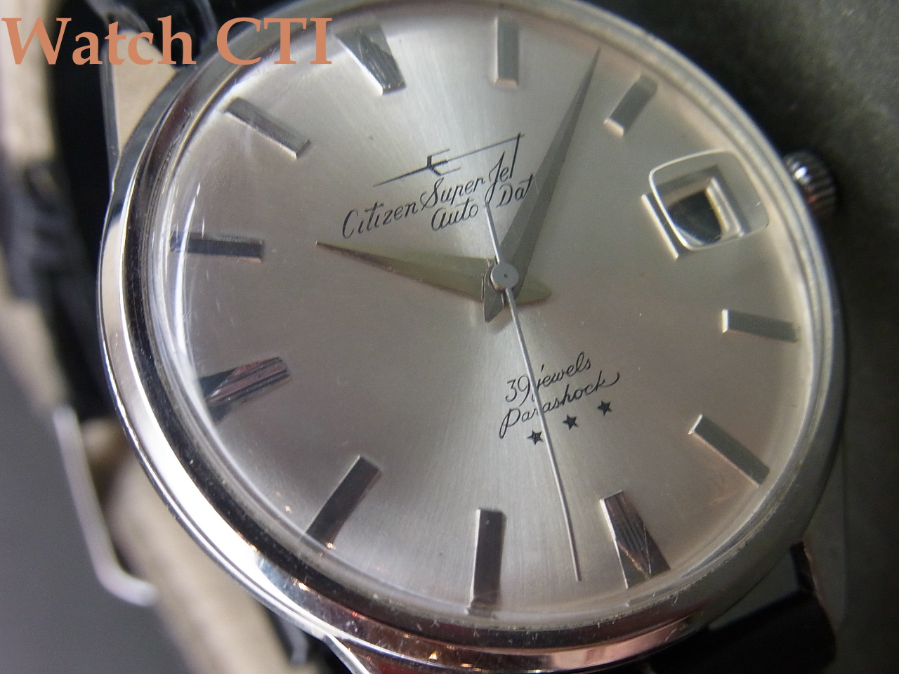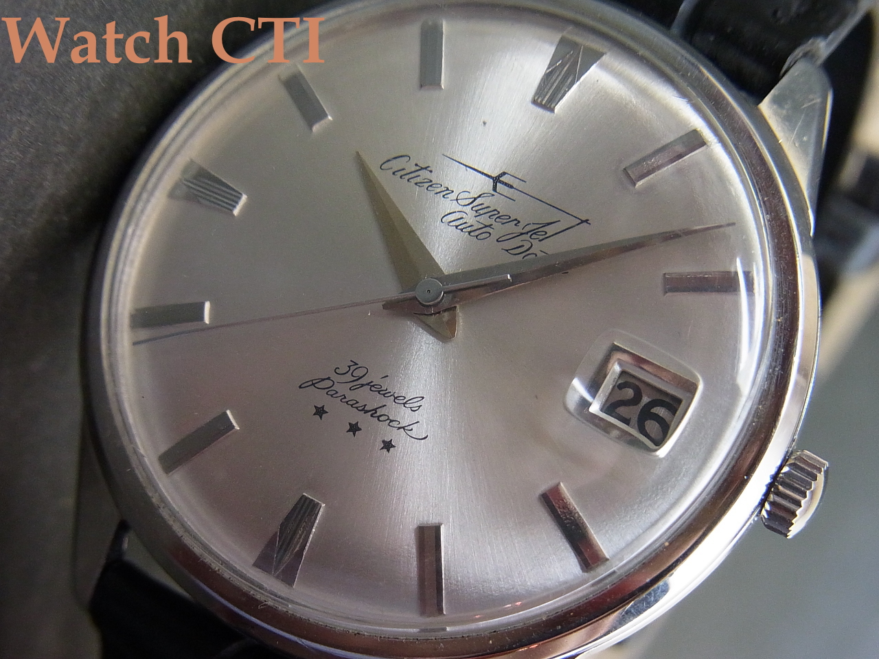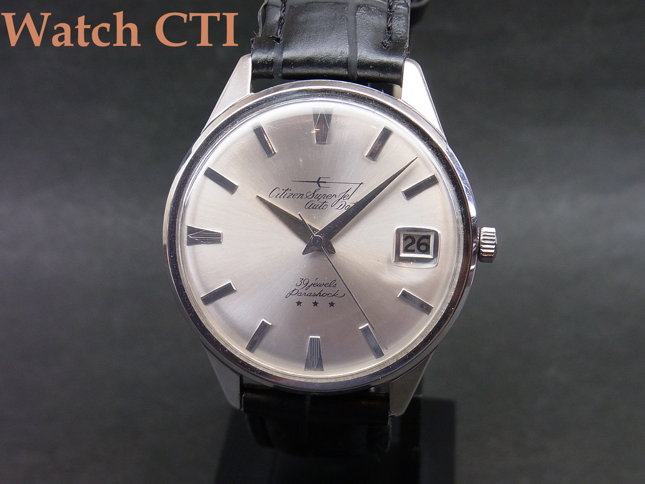 ☆シチズンの力作、「ジェットローター」式回転錘で巻き上げる自動巻はゴーゴー(ガラガラ)と音がして当時のあこがれジェット機のエンジン音を連想させるためにネーミングされたらしいです(笑)まずまずの巻き上げ効率で恐らくロンジン当たりの機械を参考にしたものでしょう….そんなジェットの最高峰はこの「39石」ヴァージョン!当個体は、ケース自体が古典的なスナップバック非防水で、後年なって出てくるPW(パラウオーター)ケースやクリスタルガラス搭載のモデルよりも相当に”クラシカル”で味わい深いものがあります!
