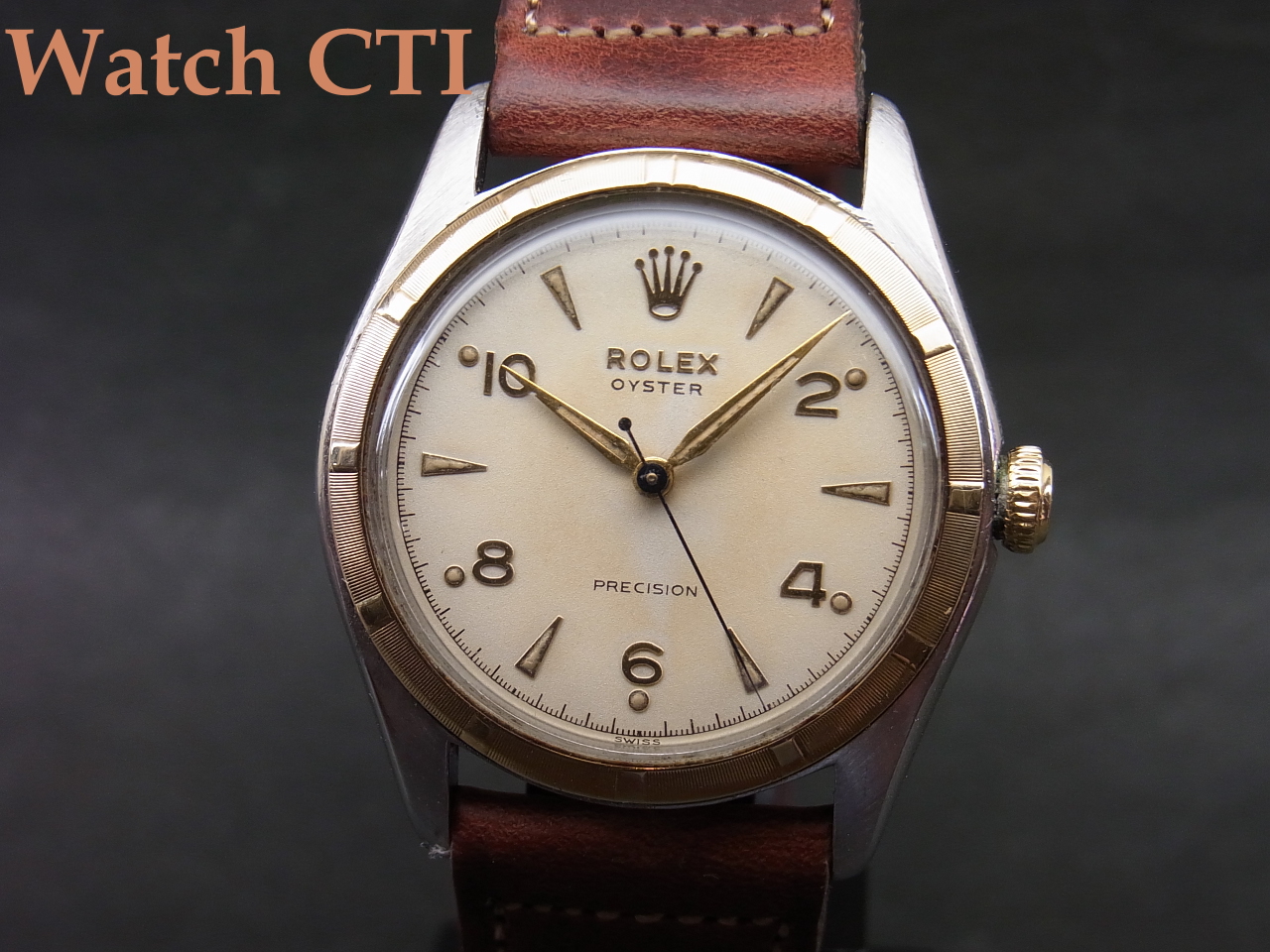 なにより、この19ミリサイズのラグ間幅や、アプライドのアラビックとクサビインデックスのミックスなどその後50年代の中~後期までロレックスの多くの機種で見られる意匠となります。そして、現品、パウダーホワイトダイアルの微妙なヤケ具合といい、ベゼルのシャープに残った感と言い….全体に素晴らしいヴィンテージロレックスを体現しておりますね!!