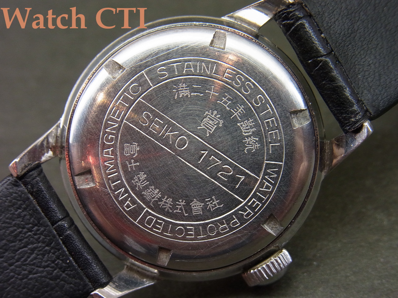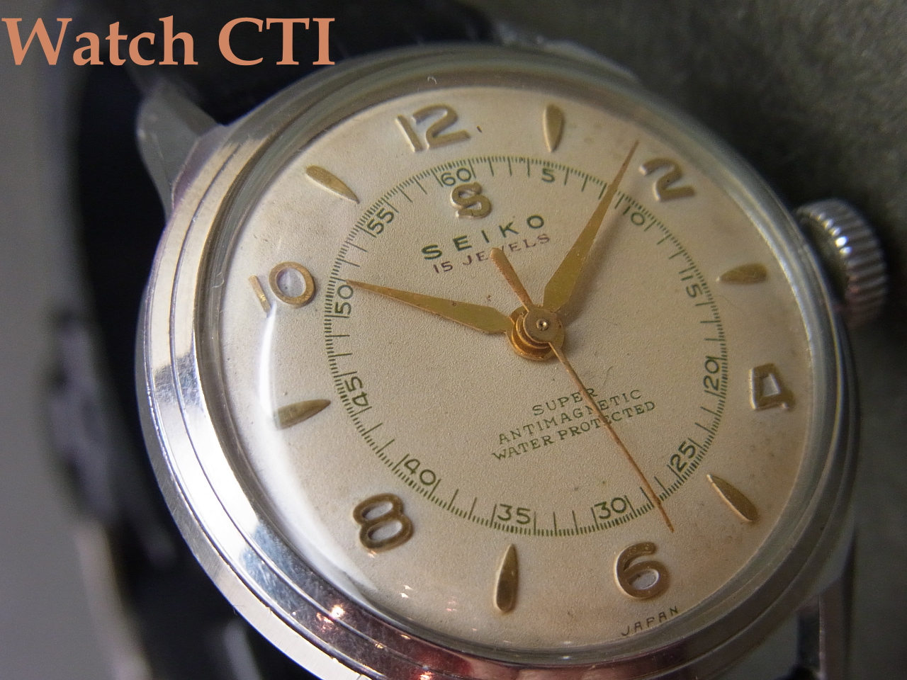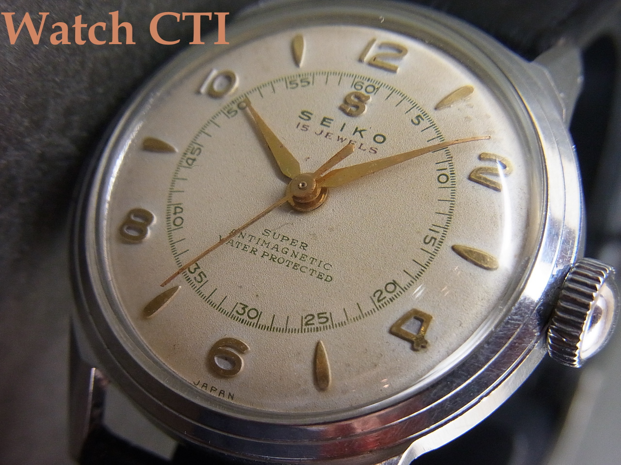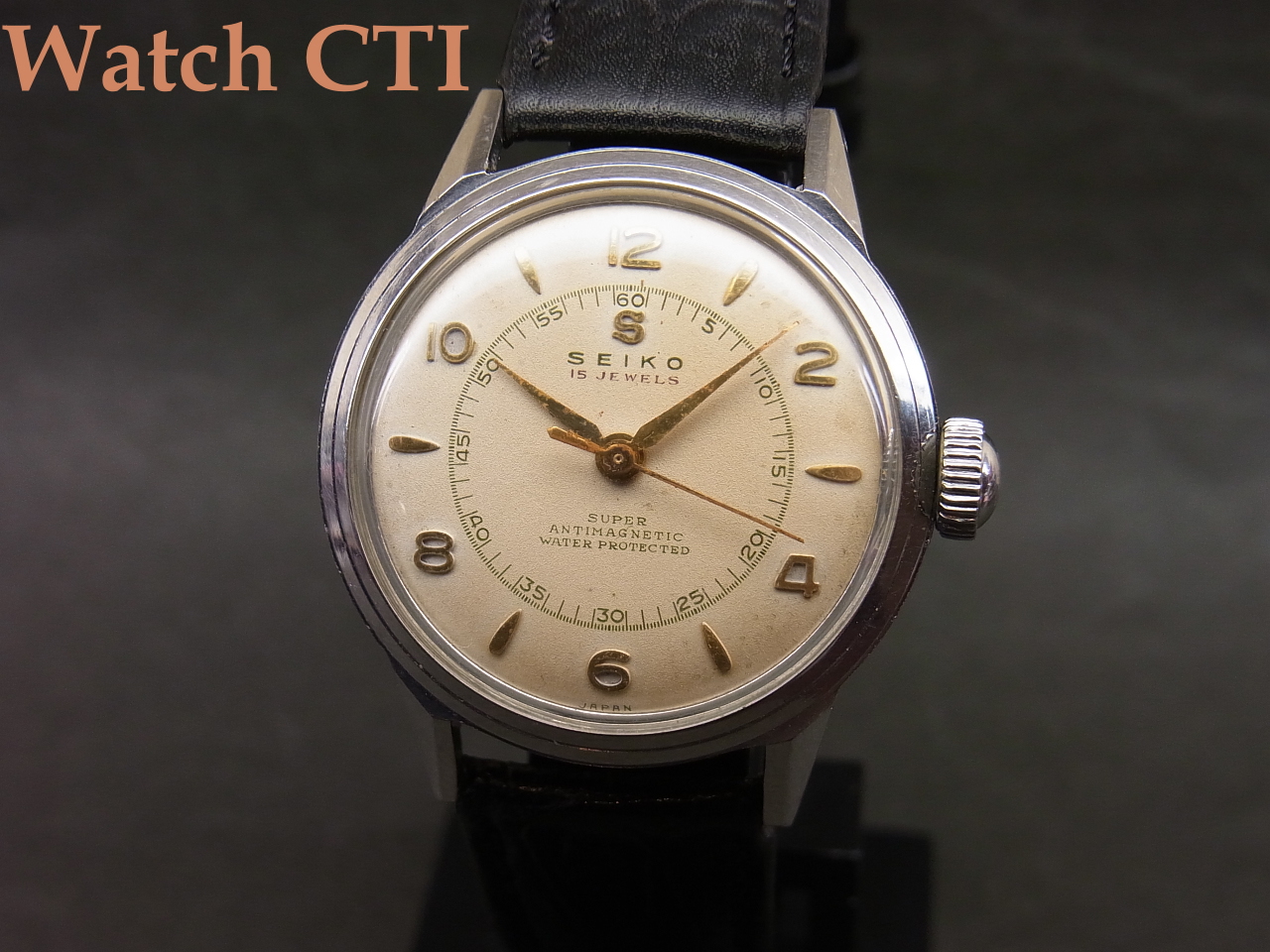 なお、当個体はクロームメッキのトップにステンレスのケースバックが大多数であった当時に、オールステンレススチール製スクリューバックケースとなり当時としての「防水」仕様となります!文字板に誇らしげにANITIMAGNETIC(防磁)とともにWATERPROTECTED(防水)がプリントされております!(現在レベルの防水時計では決してございませんのでご注意下さい)