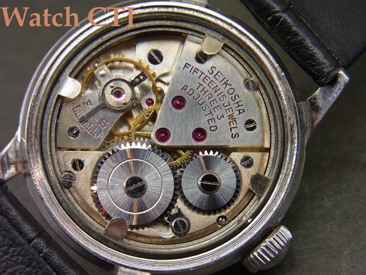 デビューの昭和25年(1950年)には8石・10石・15石とランナップしており、当個体の15石モデルが最高グレードでした。味わい深いパウダーホワイトの文字板をよく見て頂けますと15JEWELSの文字は色飛びしてしまっておりますが実は「赤色」でプリントされております(なお昭和29年頃に最高グレードに17石が追加されます)。、