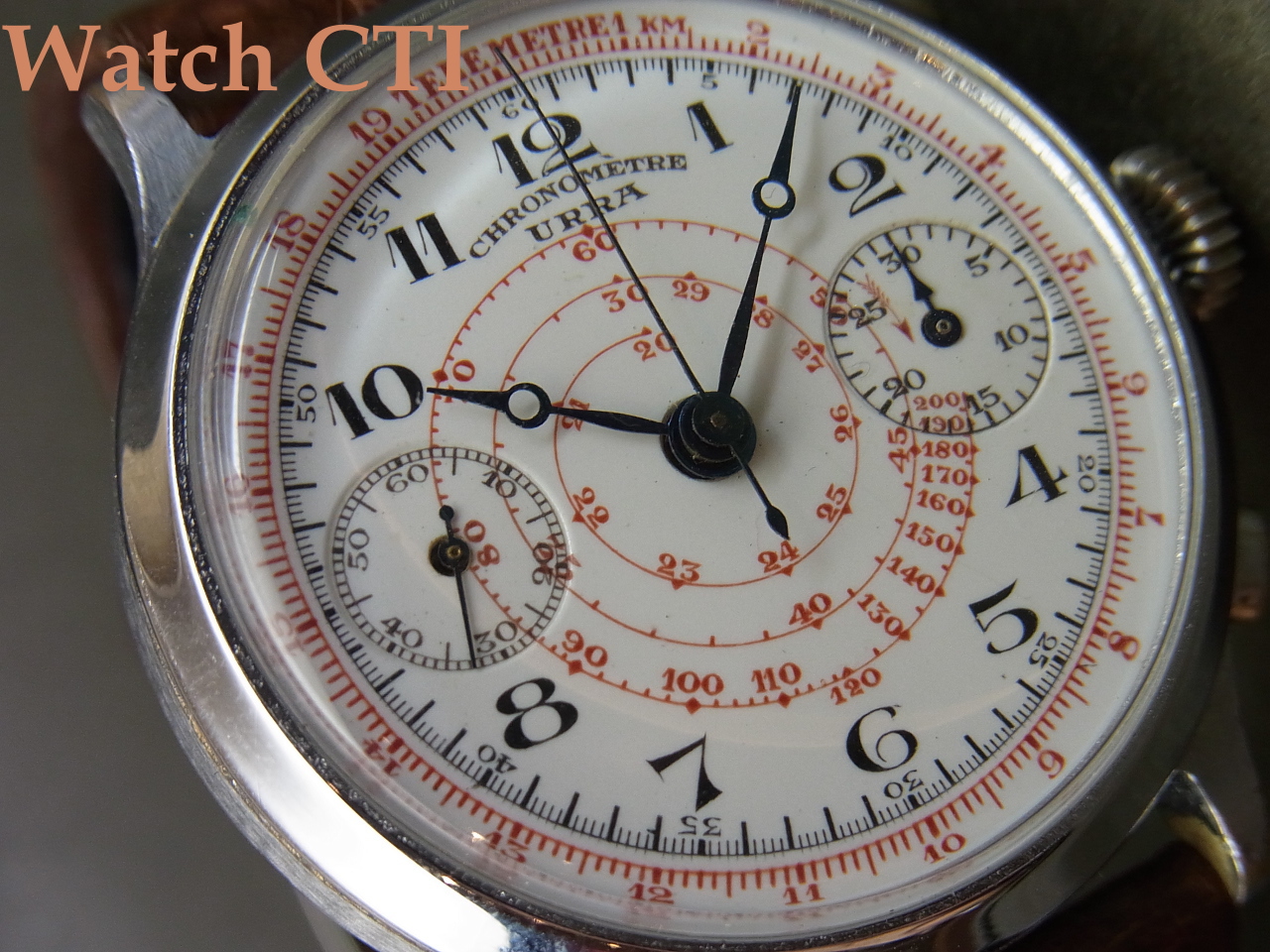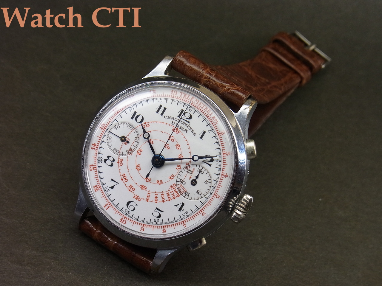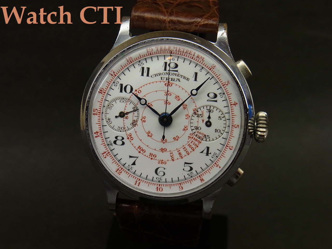 ☆ダイヤルに表示された「URRA」銘は資料不足で不明ですが、その成り立ちはランデロン(ハーン)製の15.5型(と判断しました)のラージクロノグラフムーブメントを搭載した40ミリ外径の一本です!