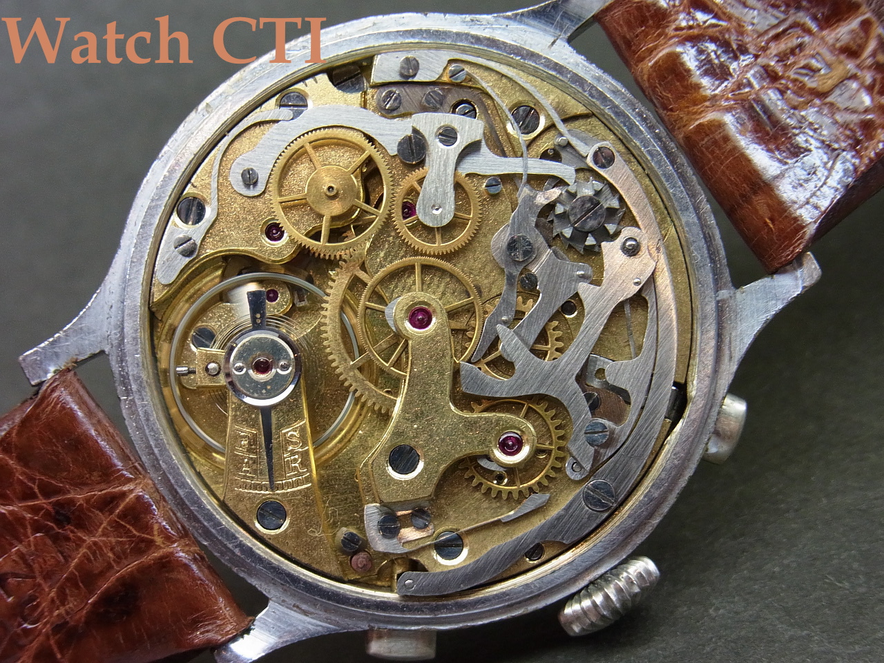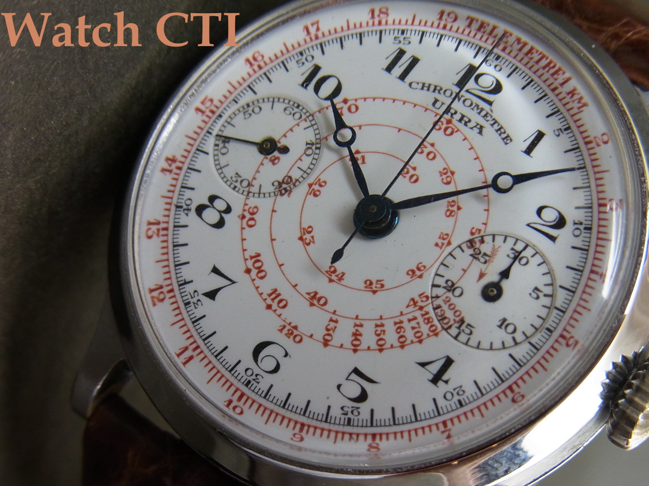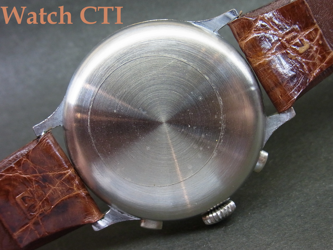 ☆ダイヤルに表示された「URRA」銘は資料不足で不明ですが、その成り立ちはランデロン(ハーン)製の15.5型(と判断しました)のラージクロノグラフムーブメントを搭載した40ミリ外径の一本です!