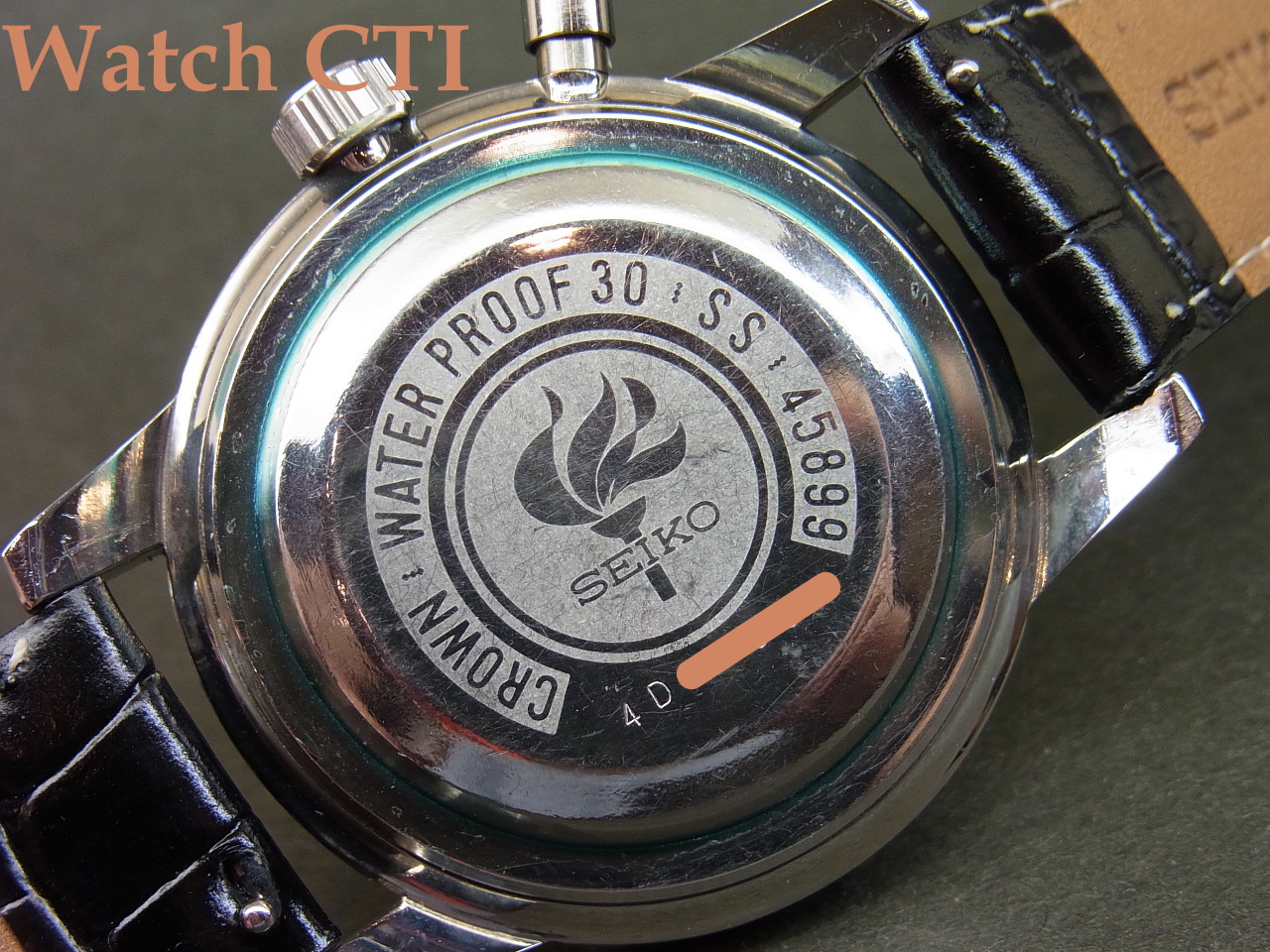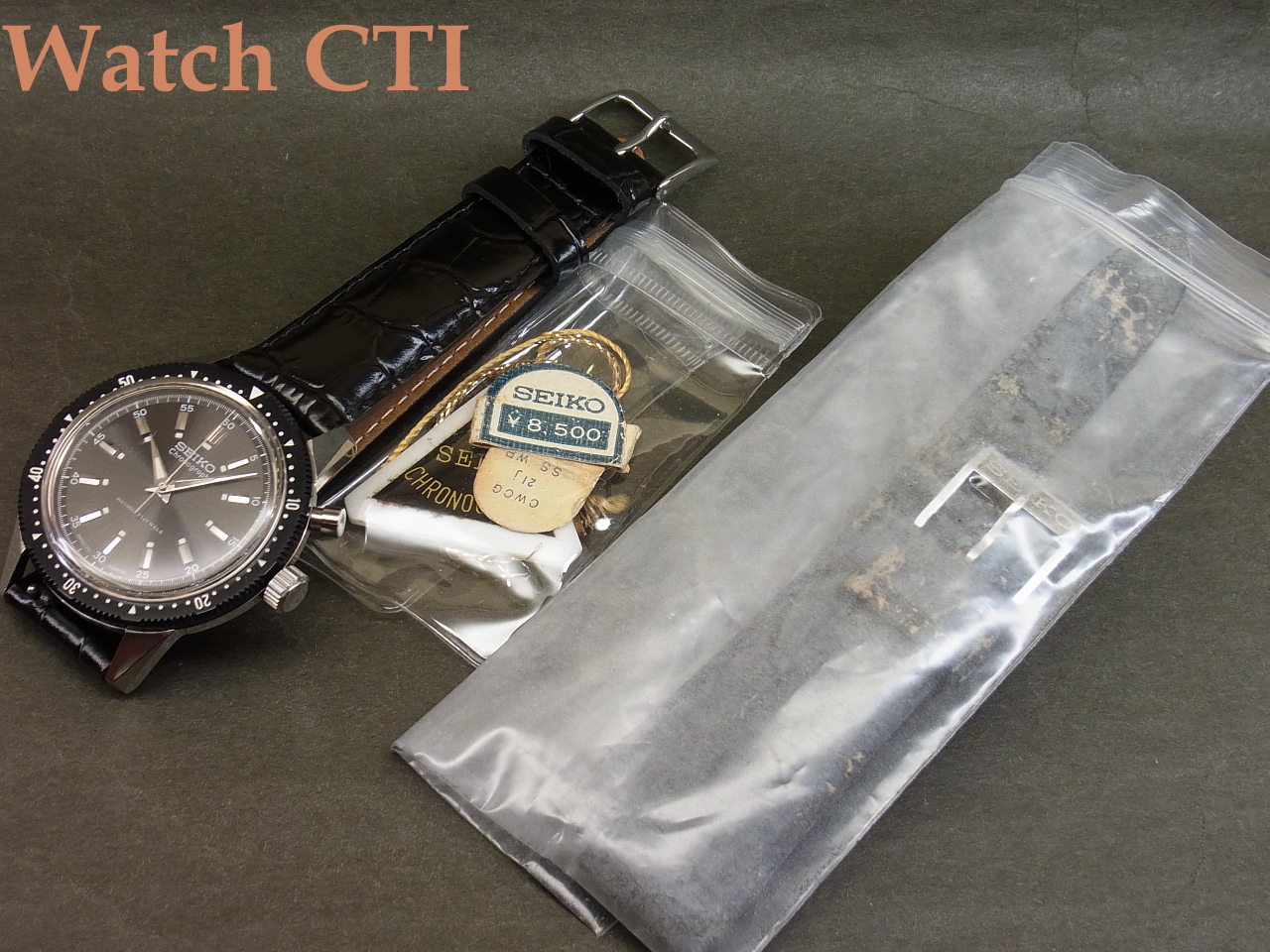 *当時のセイコー純正皮ベルトは裏側素材の材質により経年に耐えずボロボロになってしまい、当個体もその例に洩れません(実用にはなりません)。が、純正アルミ尾錠はついております!