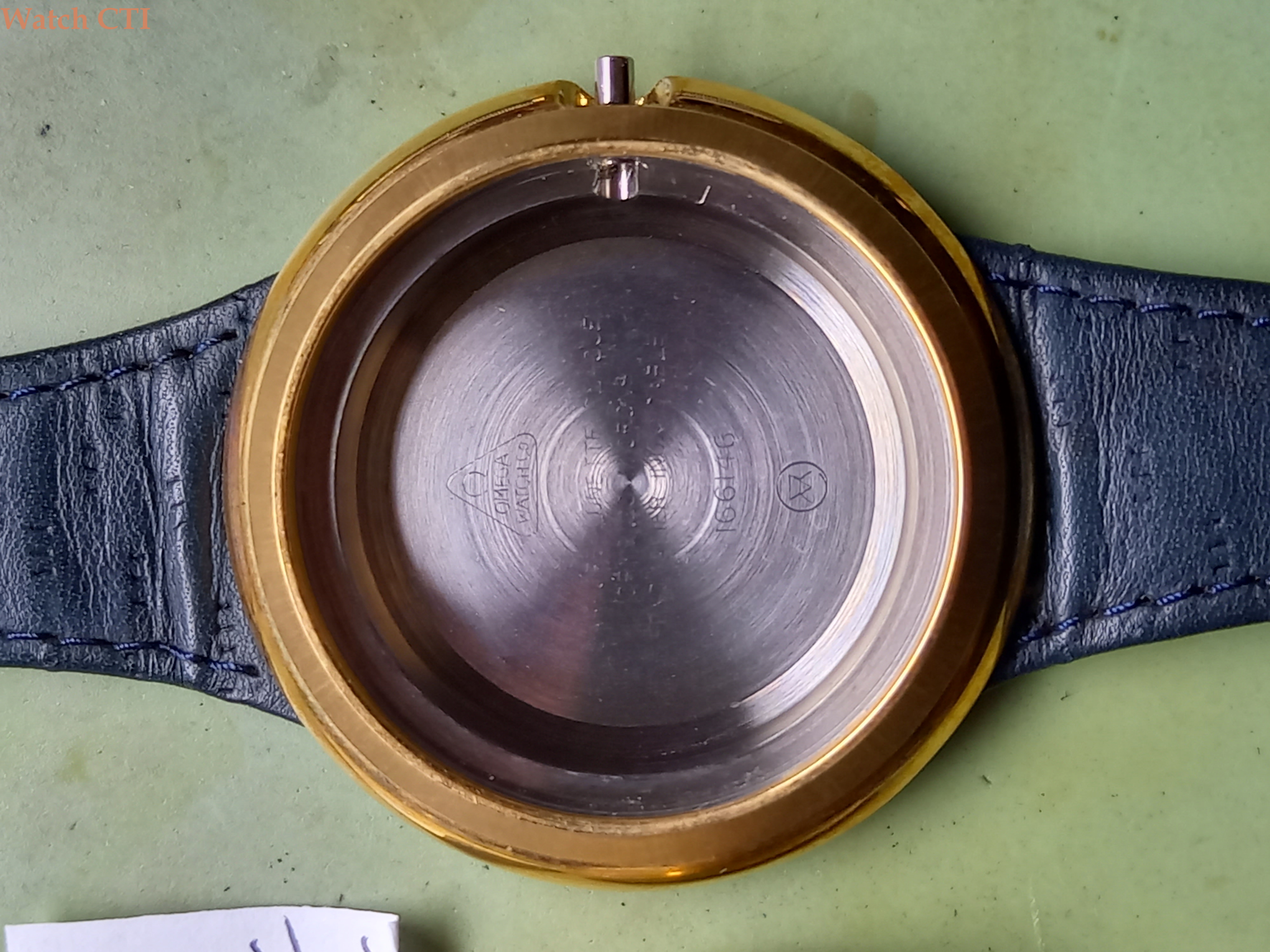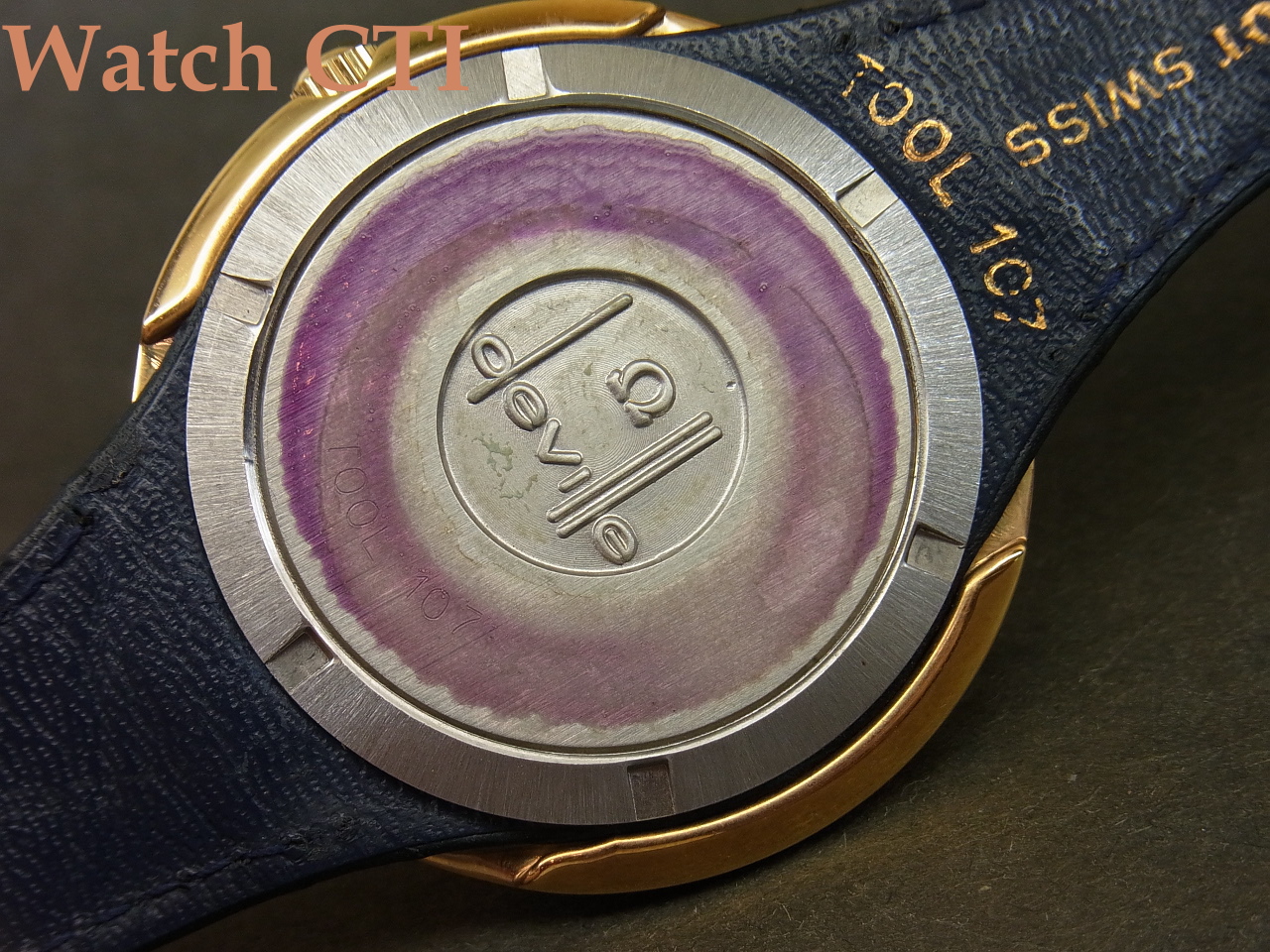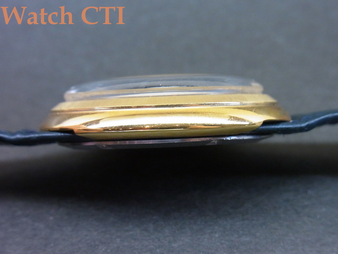 ダイナミックで金メッキケースは意外に少ないと思います。ベルトにもしっかり純正の紺色ベルトが残っていますが、今までの経年保管に伴い、外観的には新品同様ってわけには行かず少々やれが感じられますが使用痕跡はございませんし、特徴的なシーソーバックルも専用の金メッキものが装着されていますね!!