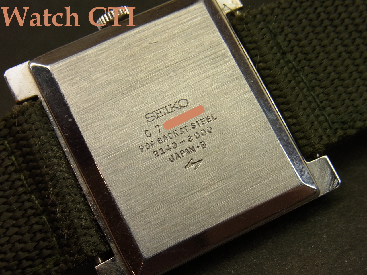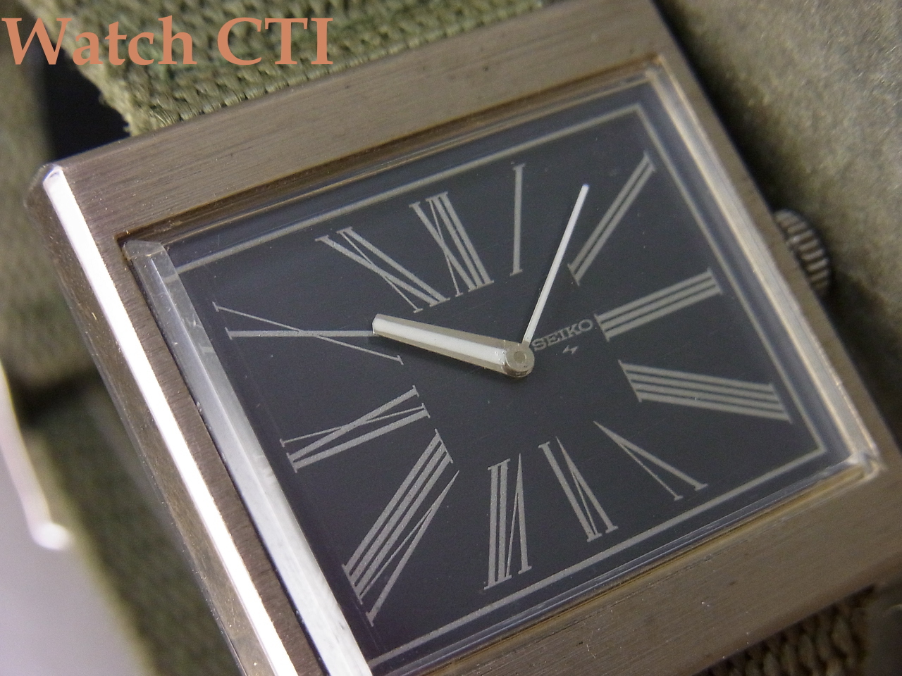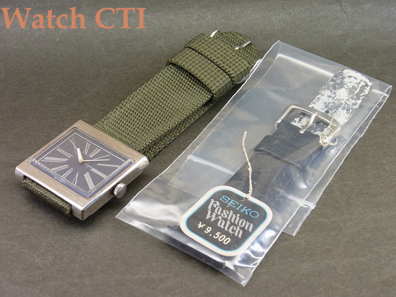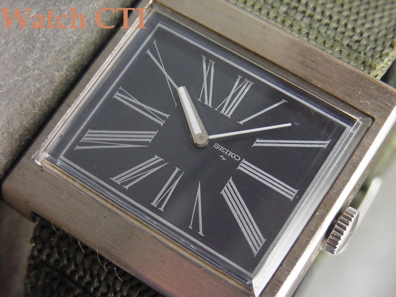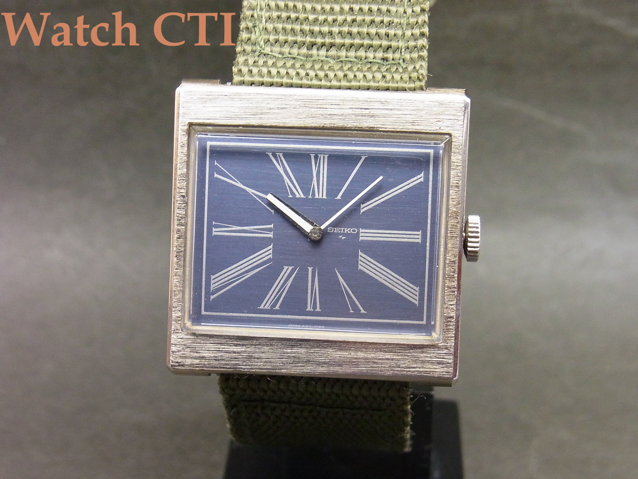 ☆真四角なスクエアケースにいぶしたようなブルーカラーの文字板!そこに大胆なローマンプリントインデックスを配して、デザイン優先を大いに物語ります!今見ても斬新です!しかも長らく時計店で眠っていた未使用デッドストック品、、、、当時のセイコー純正ベルトの御多分にモレズで裏側の素材が経年劣化でボロボロなため、ナイロンベルトを装着しておきましたが、元ベルト(純正バックル付)も付属します!