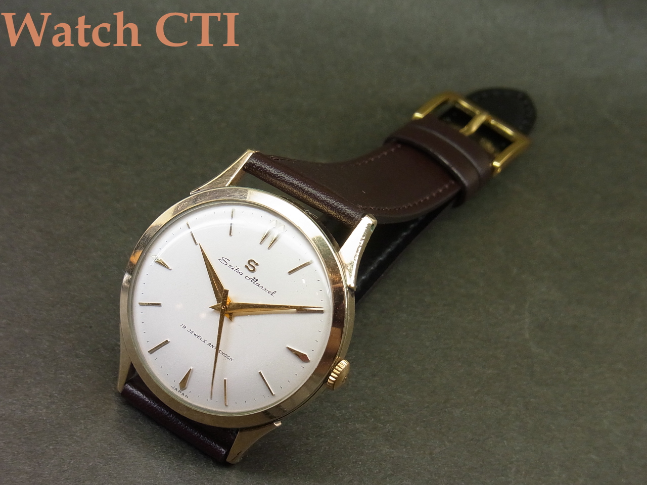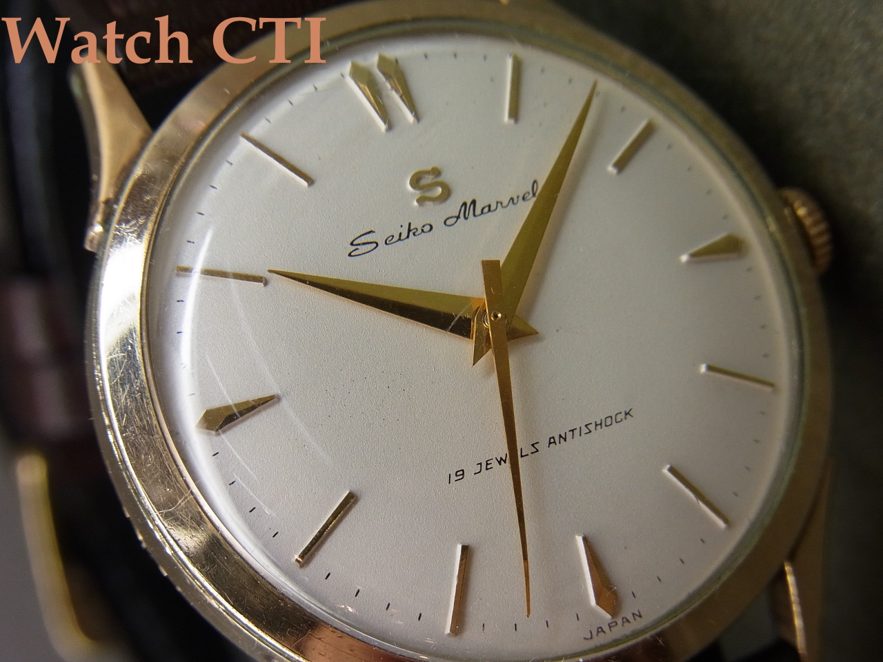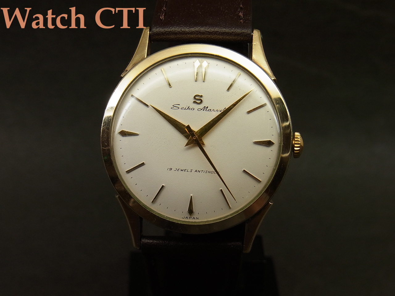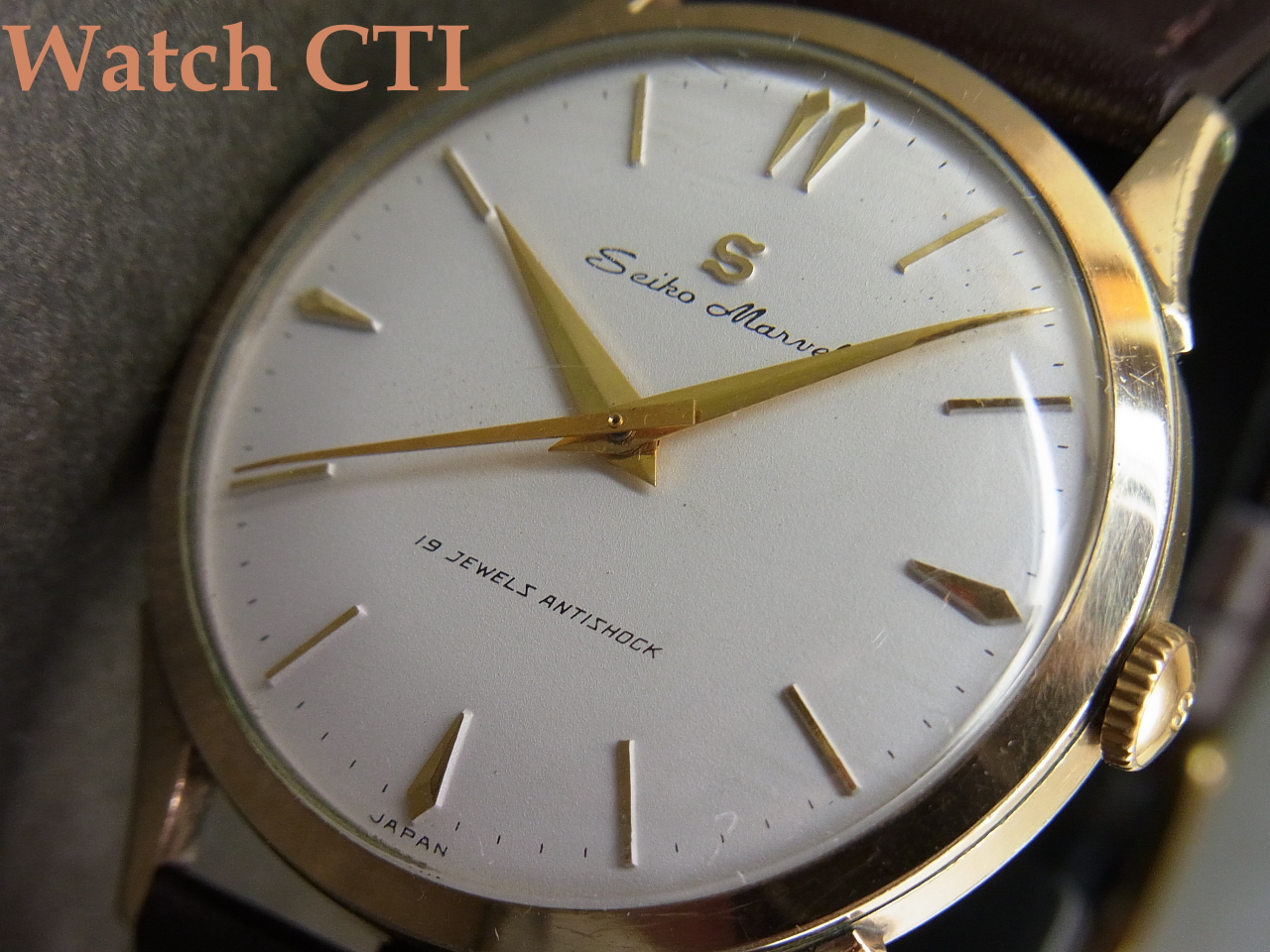 *同年にはマーベルベースの最高級モデル「ロードマーベル」も投入されますが、こちら19石モデルも負けずに端正に作りこまれており、今見ましても作りこみの良さとデザインに感心します!特に製品の「顔」たる文字板のデザインは素晴らしいまとまりを見せており、ドルフィン針と三角秒針も雰囲気抜群です!なによりオールドセイコー諸モデルにつく「Sマーク」とのマッチングが最高ですね!