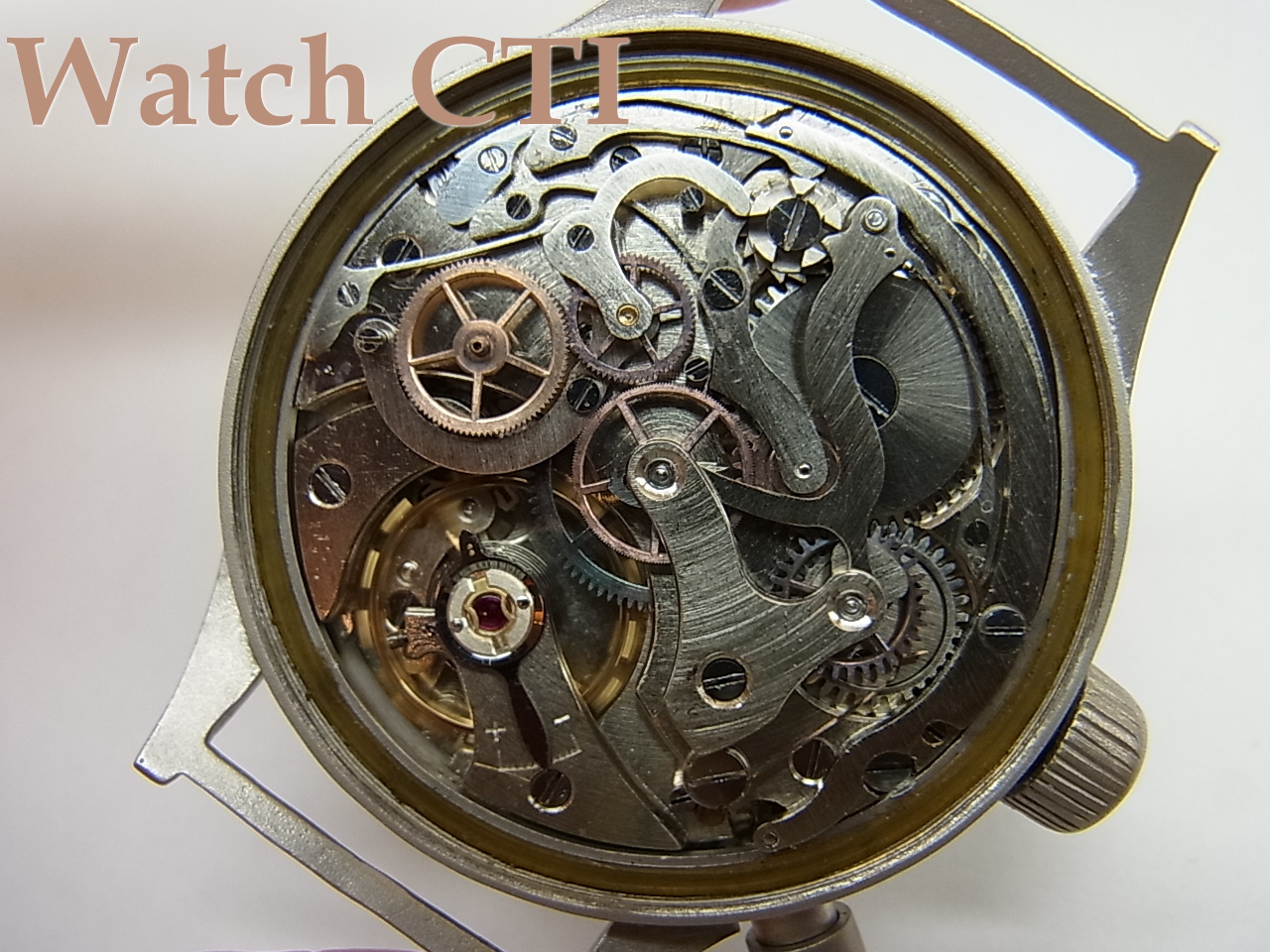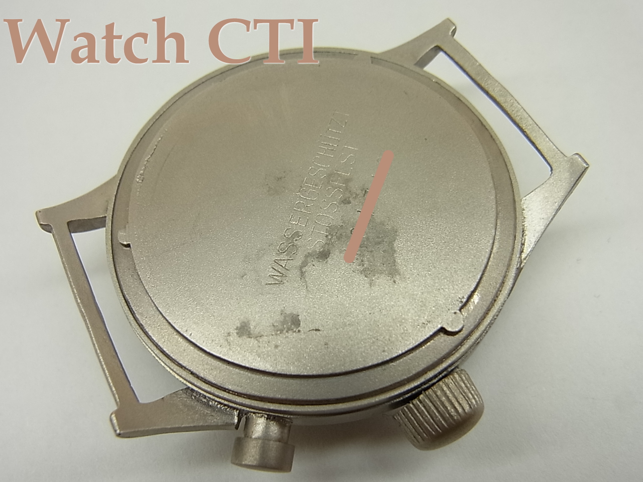 リューズに関して表面のギザが手仕上げ的な感じで浅めな彫りですので、ギザの減ってしまったリューズを仕上げしメッキしたものかもしれません。形状的にはケース側から外側に向けてほんの少しだけテイパーしている純正形状であり、多くの海外ウエッブ等の写真と比較検討しましたが社外品とは考えにくいです。というわけでリューズに関しては仕上げ品の可能性ありとしておきます。