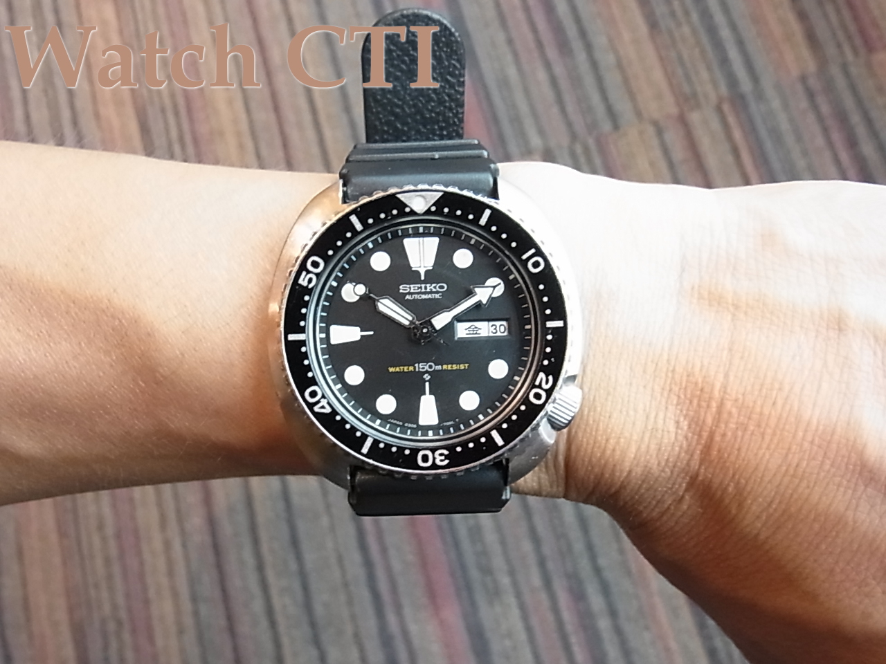 ベゼルディスク・風防ガラス・リューズ・ケース・文字板。長短針・秒針とどれもが発売当時のパーツのままです。