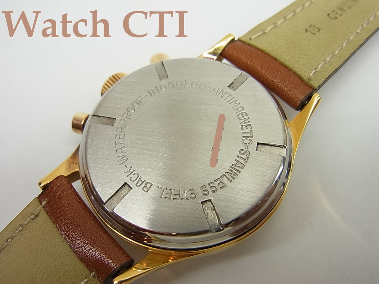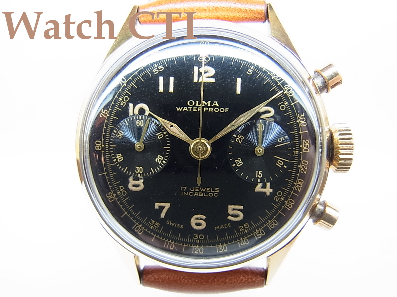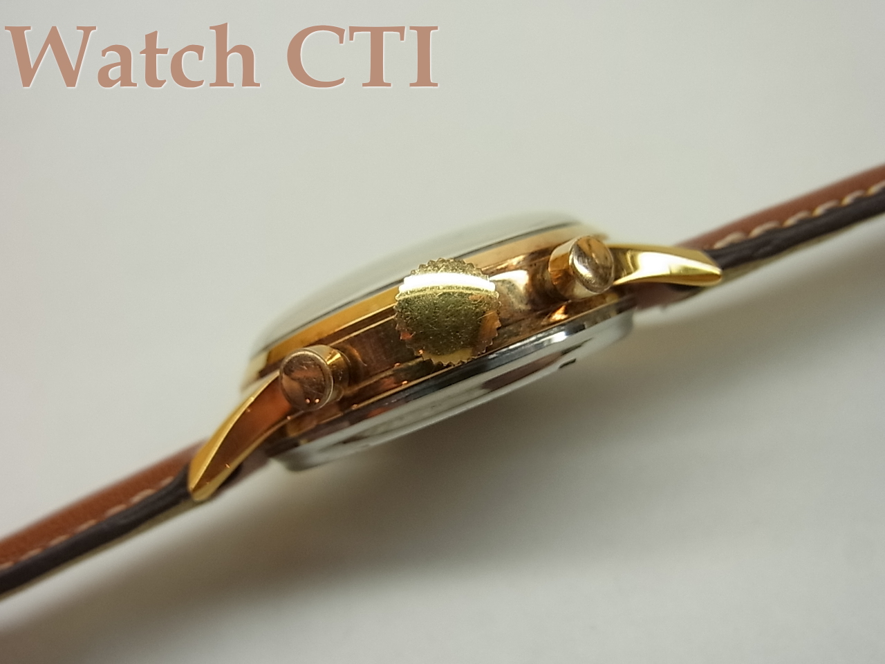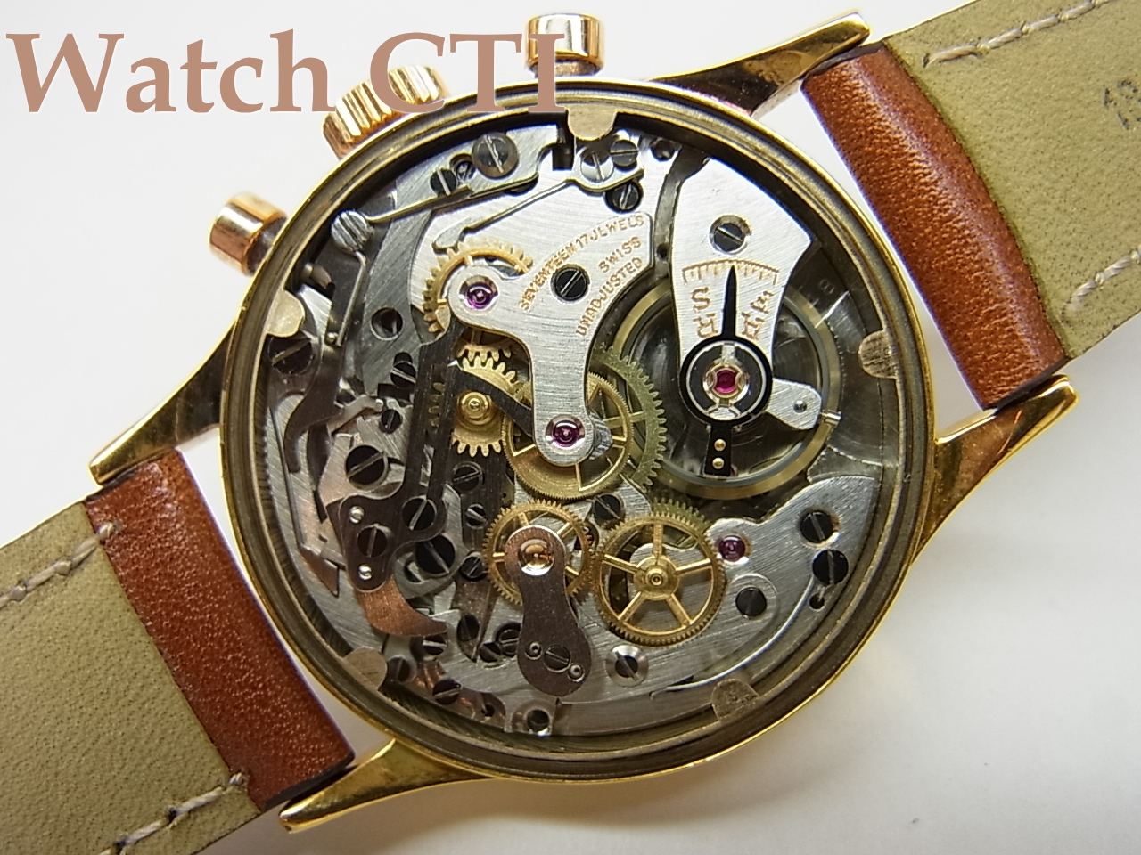 経年保管に伴うケースメッキ面の表面的な薄いこすれ等は見えますが、機械の艶なども含めて間違いなく最終ユーザーにより実用使用された品ではありません!なんといってもミラーブラックのダイヤルはギルト仕上げでこの美しさはこの仕上げ方でないと味わえないものですね!!