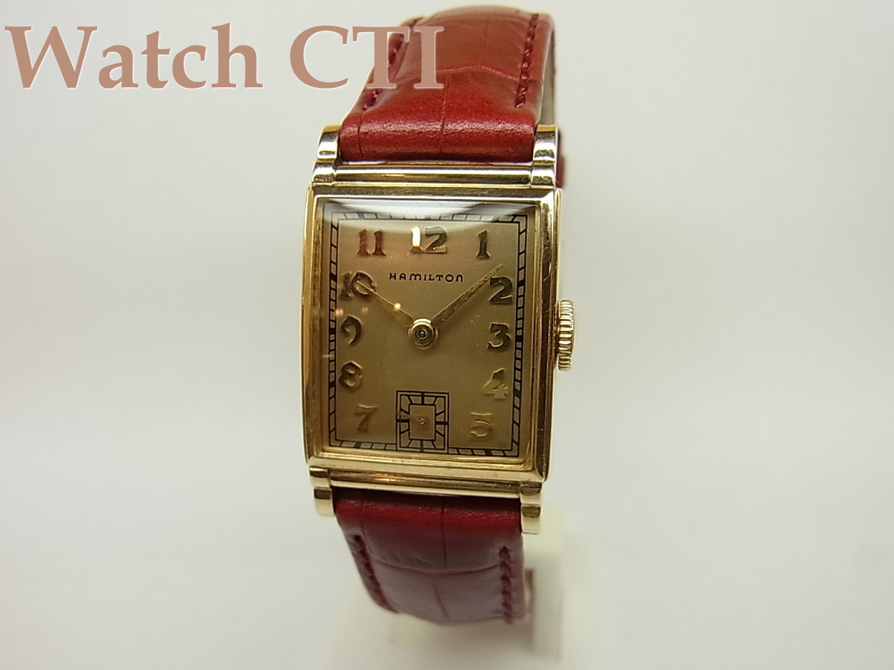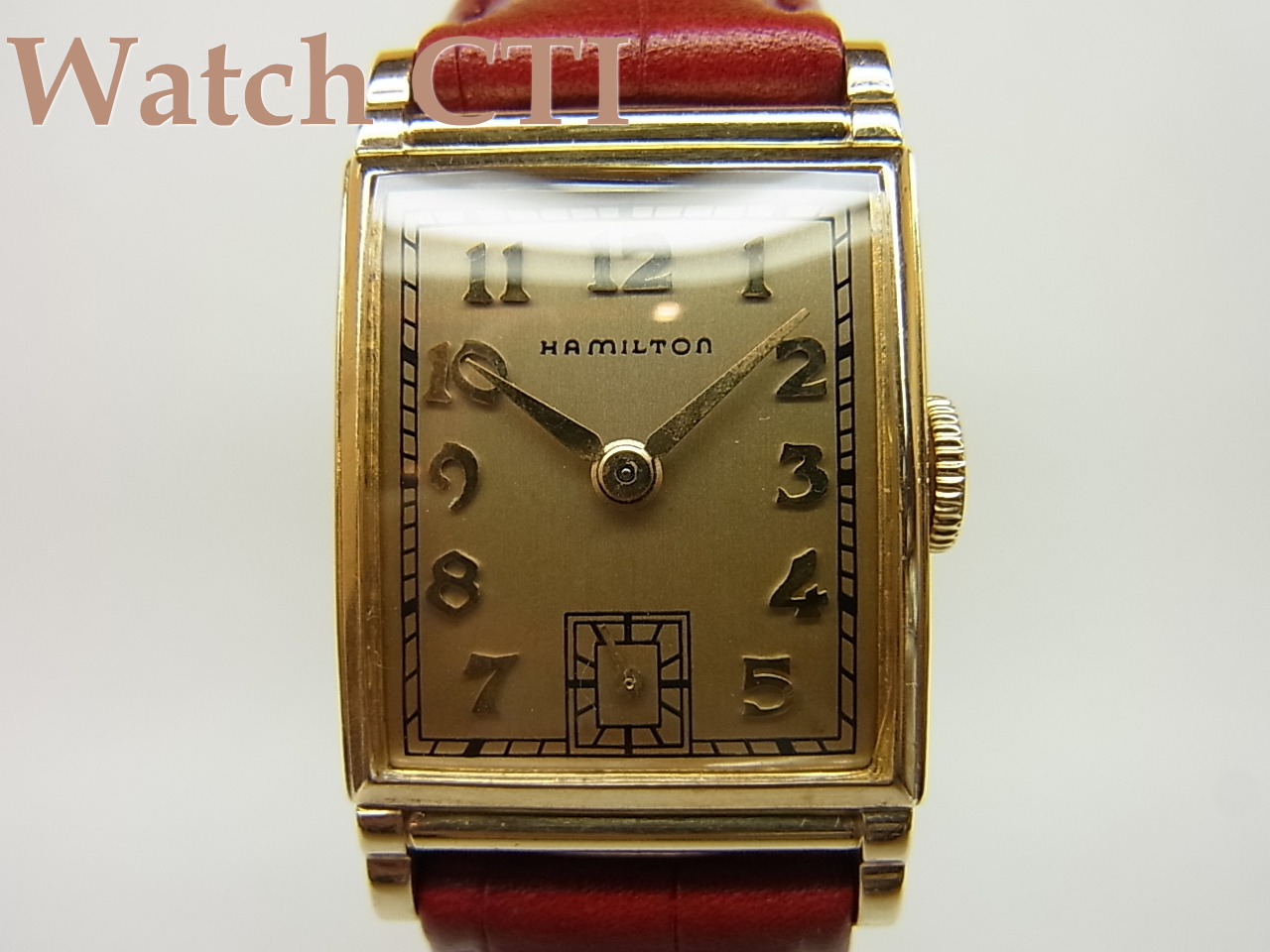 ☆機械・ケース・文字板すべてがとても良質なコンディションです。唯一文字板のHAMILTON銘が少しぼけ気味ですが、経年劣化としてはいたしかたないでしょうか…..ハミルトン製品はペットネームを持つものが多いのですが、現品は銘無しモデルです。典型的な「金張りケース」にあの時代に多く使われた時字も面白く、カジュアルにもフォーマルにもフィットする一本でしょう!