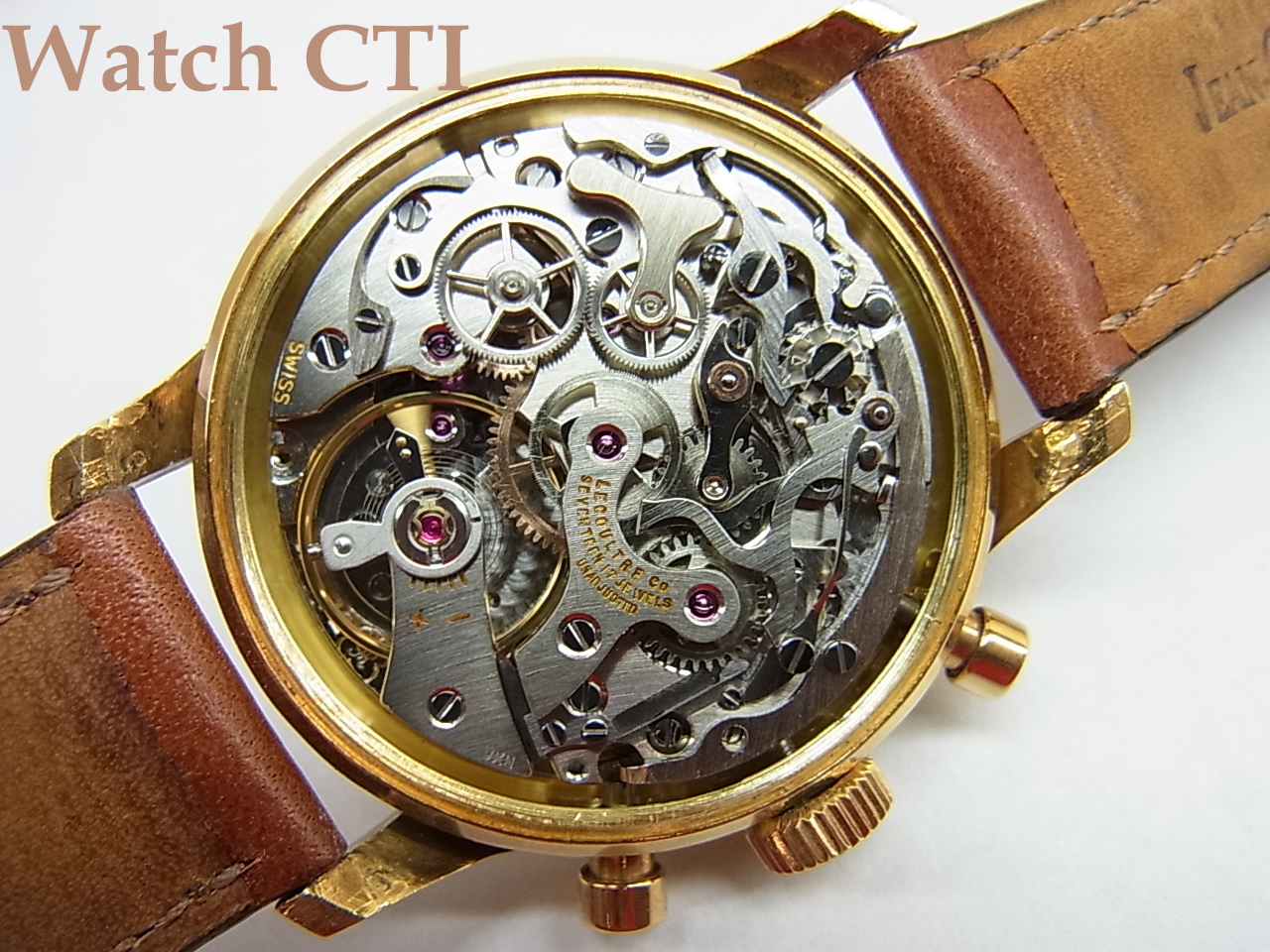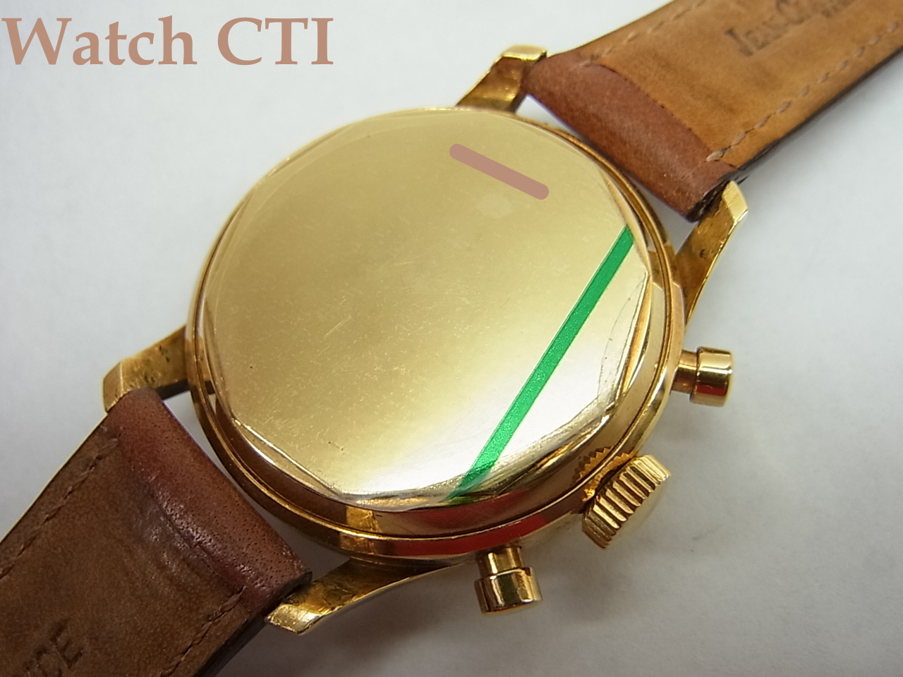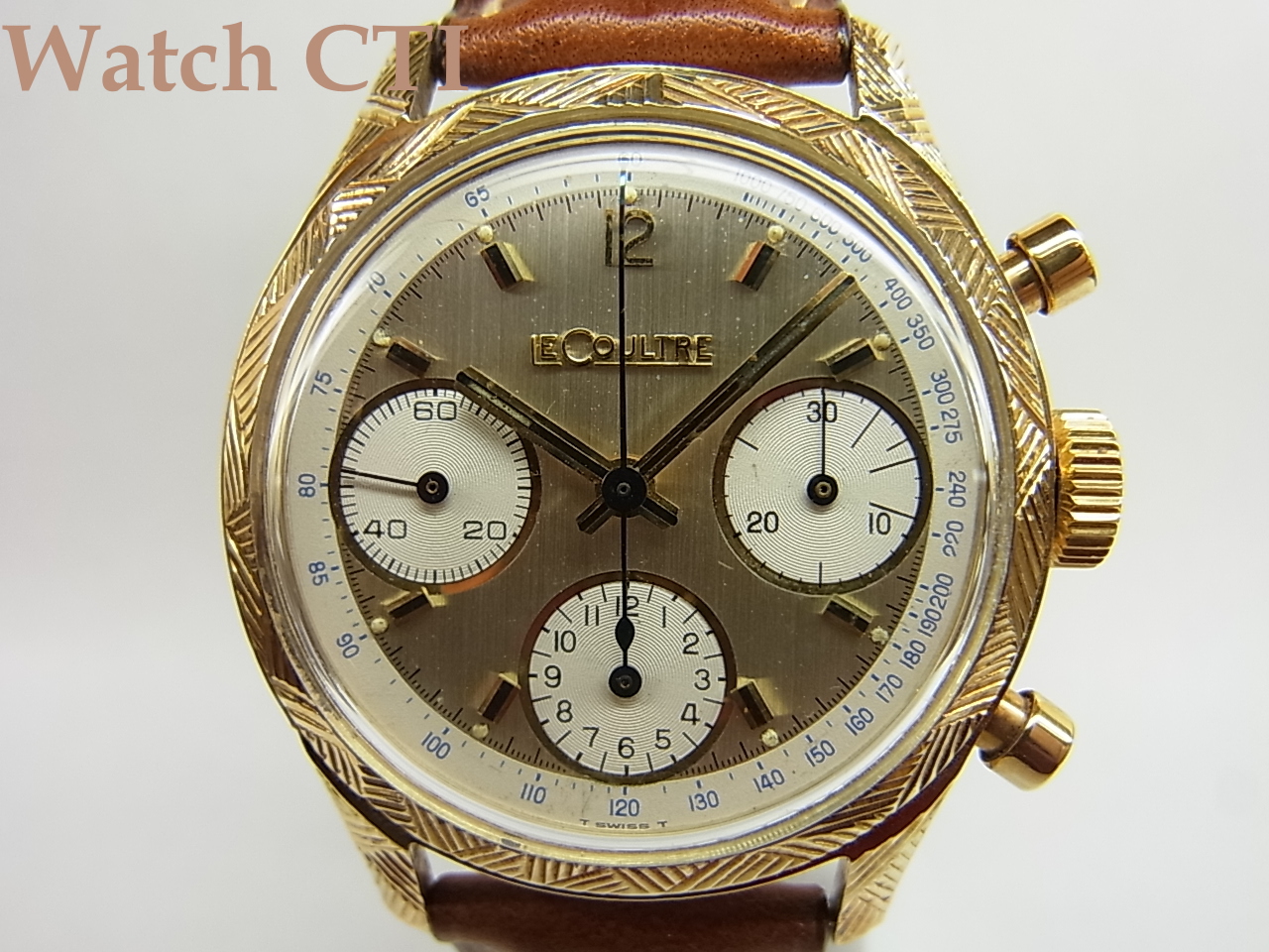 かなりワイルドなイメージで、ちょっとJLらしからぬ一本ですがUSしよう仕様の「ルクルト」ならではでしょうか…..資料が全く見つからないため、販売時点でのオリジナルでこの彫金が入っていたのか否かは残念ながら特定できておりません。ケース自体は重厚感あふれる18金のイエローゴールドでスクリューバック!ポリッシュは入っていないと思います。そこにJLがチューンした名機ヴァルジュー72を搭載ですからいうことありませんね!ダイアルも凝った2トーン仕上げで綺麗な状態をたもっています。かなりレアなルクルトクロノグラフであることは間違いございません。この手がお好きな方!ぜひ!