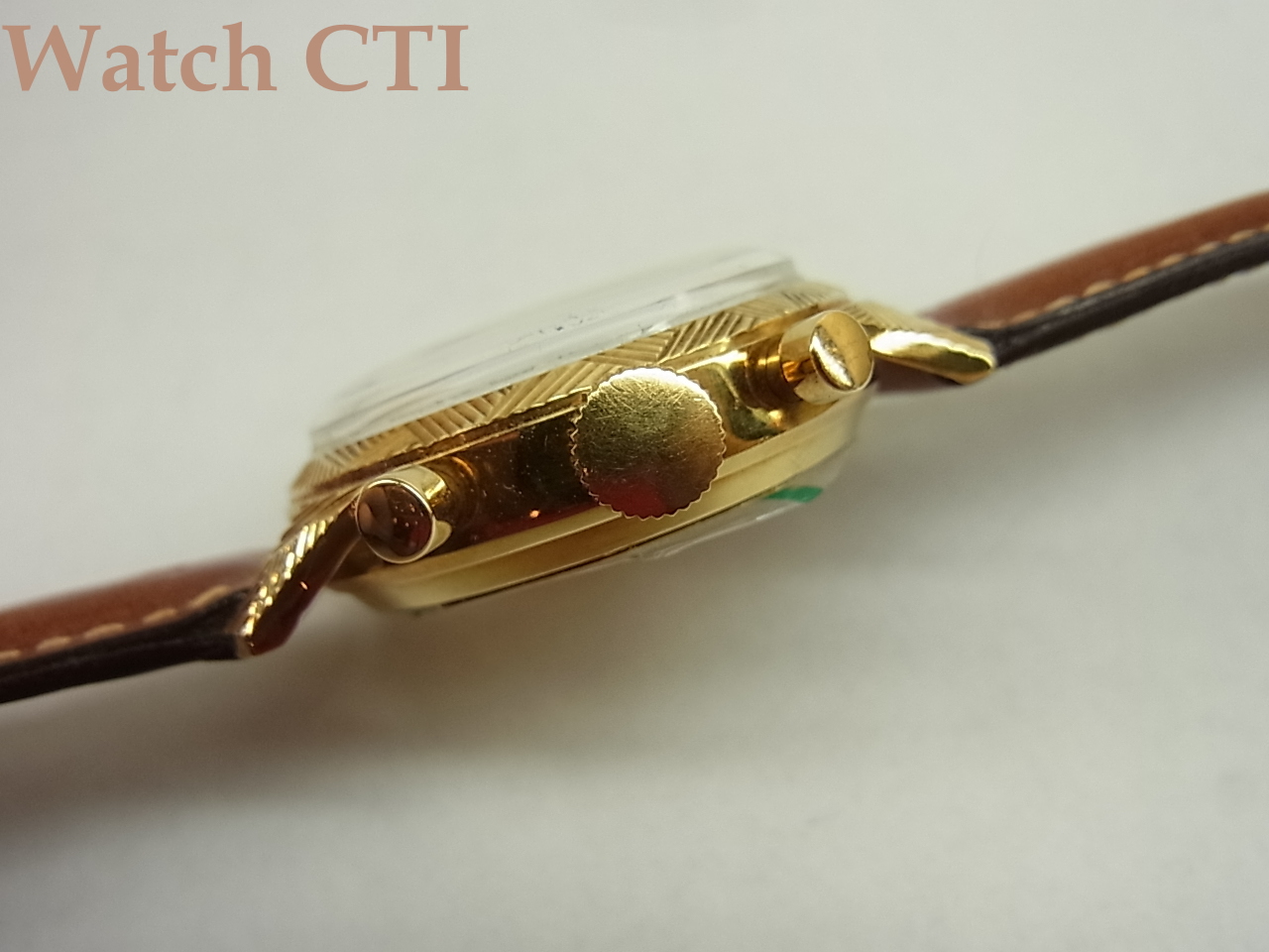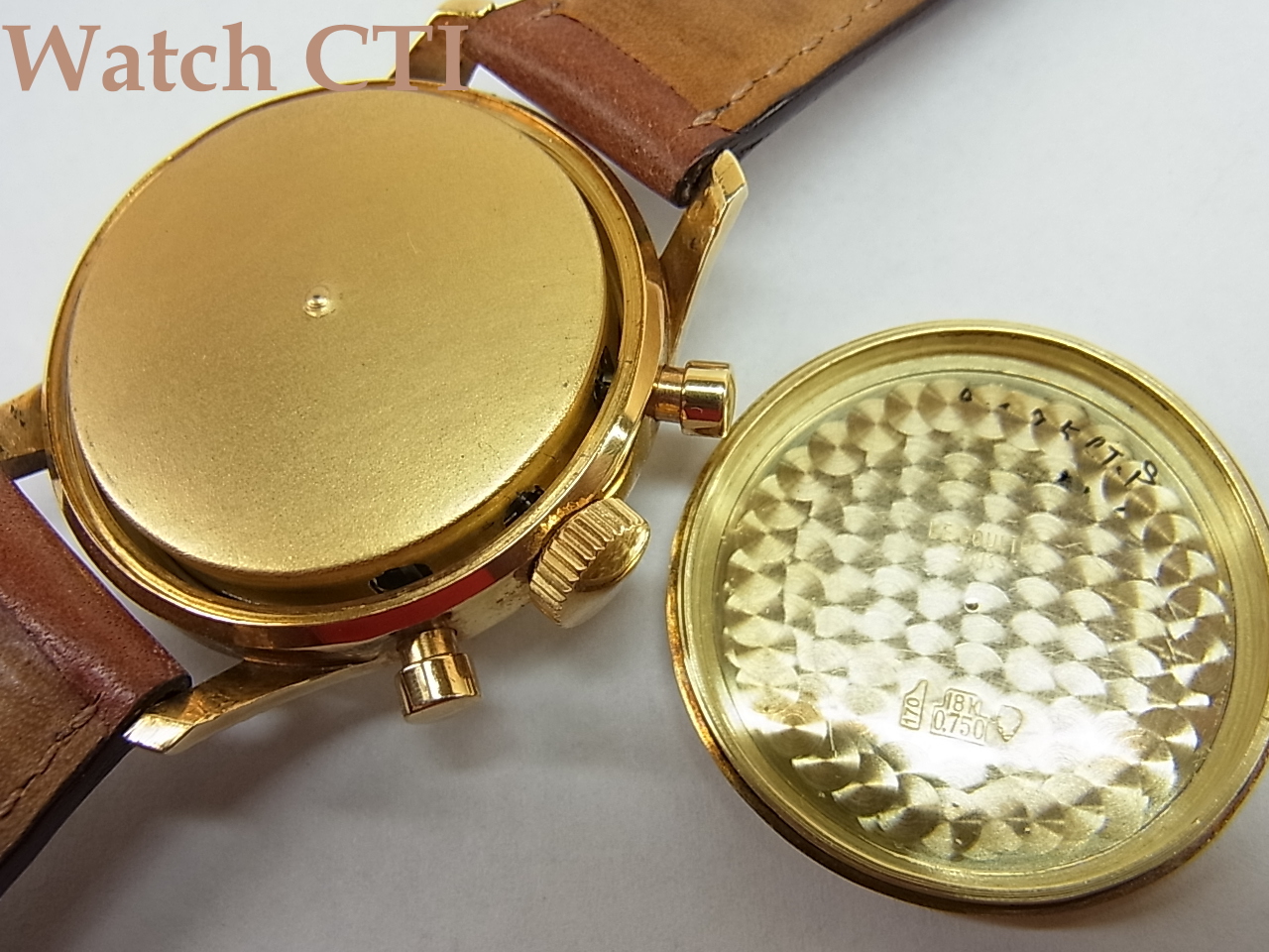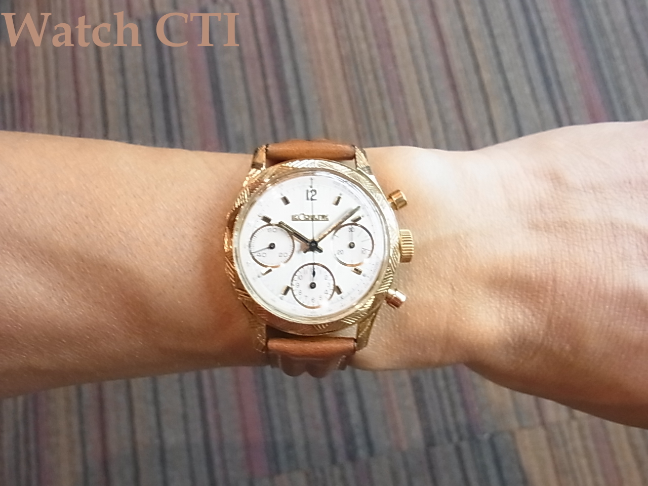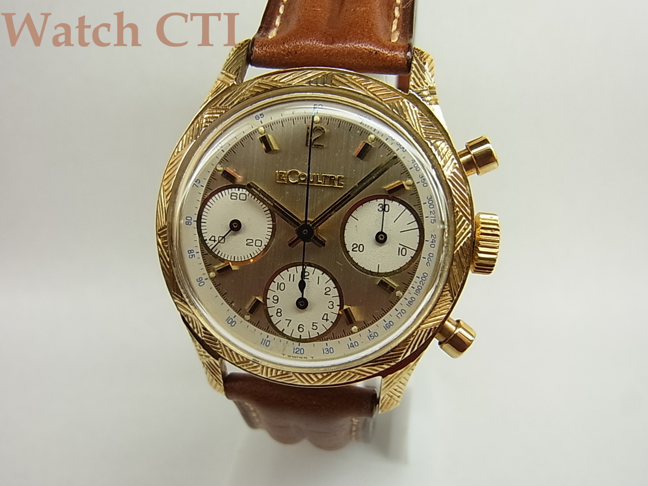 かなりワイルドなイメージで、ちょっとJLらしからぬ一本ですがUSしよう仕様の「ルクルト」ならではでしょうか…..資料が全く見つからないため、販売時点でのオリジナルでこの彫金が入っていたのか否かは残念ながら特定できておりません。ケース自体は重厚感あふれる18金のイエローゴールドでスクリューバック!ポリッシュは入っていないと思います。そこにJLがチューンした名機ヴァルジュー72を搭載ですからいうことありませんね!ダイアルも凝った2トーン仕上げで綺麗な状態をたもっています。かなりレアなルクルトクロノグラフであることは間違いございません。この手がお好きな方!ぜひ!