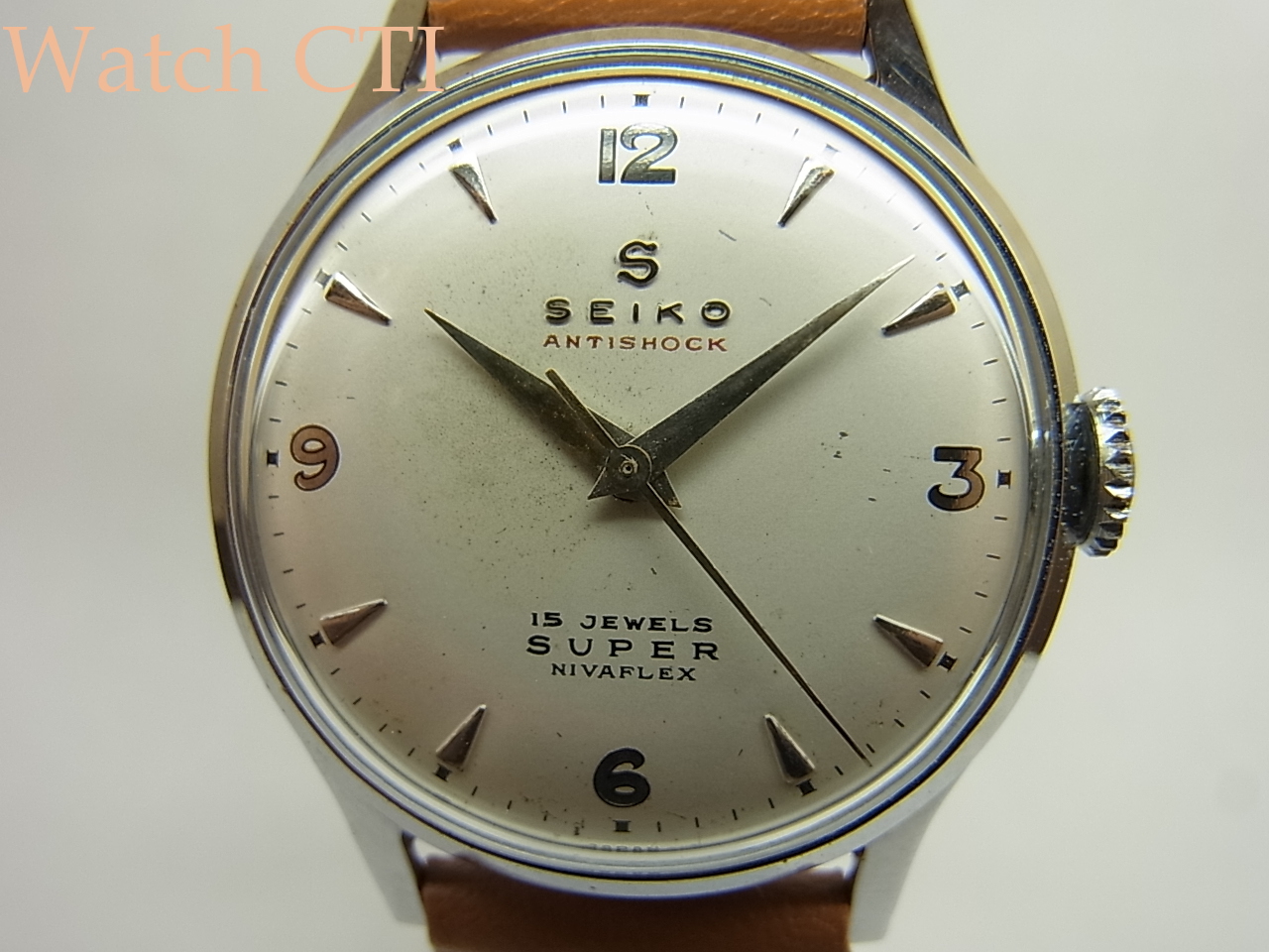 セイコー社初の耐震装置「E-1」が搭載されておりますが、この装置自体はスイス製で1954年(昭和29年)製以降の15石と最後年の17石ヴァージョンに採用され販売されたものです。総生産数は結構あったようですが、現在ではスーパー自体が実用で淘汰されてしまったようでバランスよくまとまったコンディションの品は少なくなりました…..。