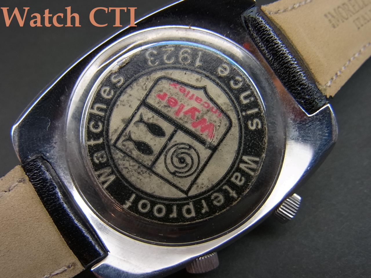 *というわけで、ワイラー・アラーム。今回入荷の品はベゼル形状と文字板インデックス・針が金色っていう点が違います。また、純正のケースバックシールと純正のベルト・バックルがついております。もぼ未使用品と考えてもよいかと思いますね。