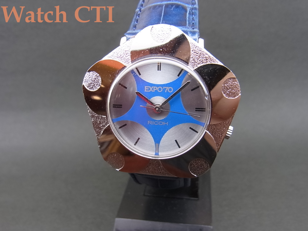☆大阪万博のロゴマークをモチーフとしたケース/ダイアルの一体デザインが施された腕時計。