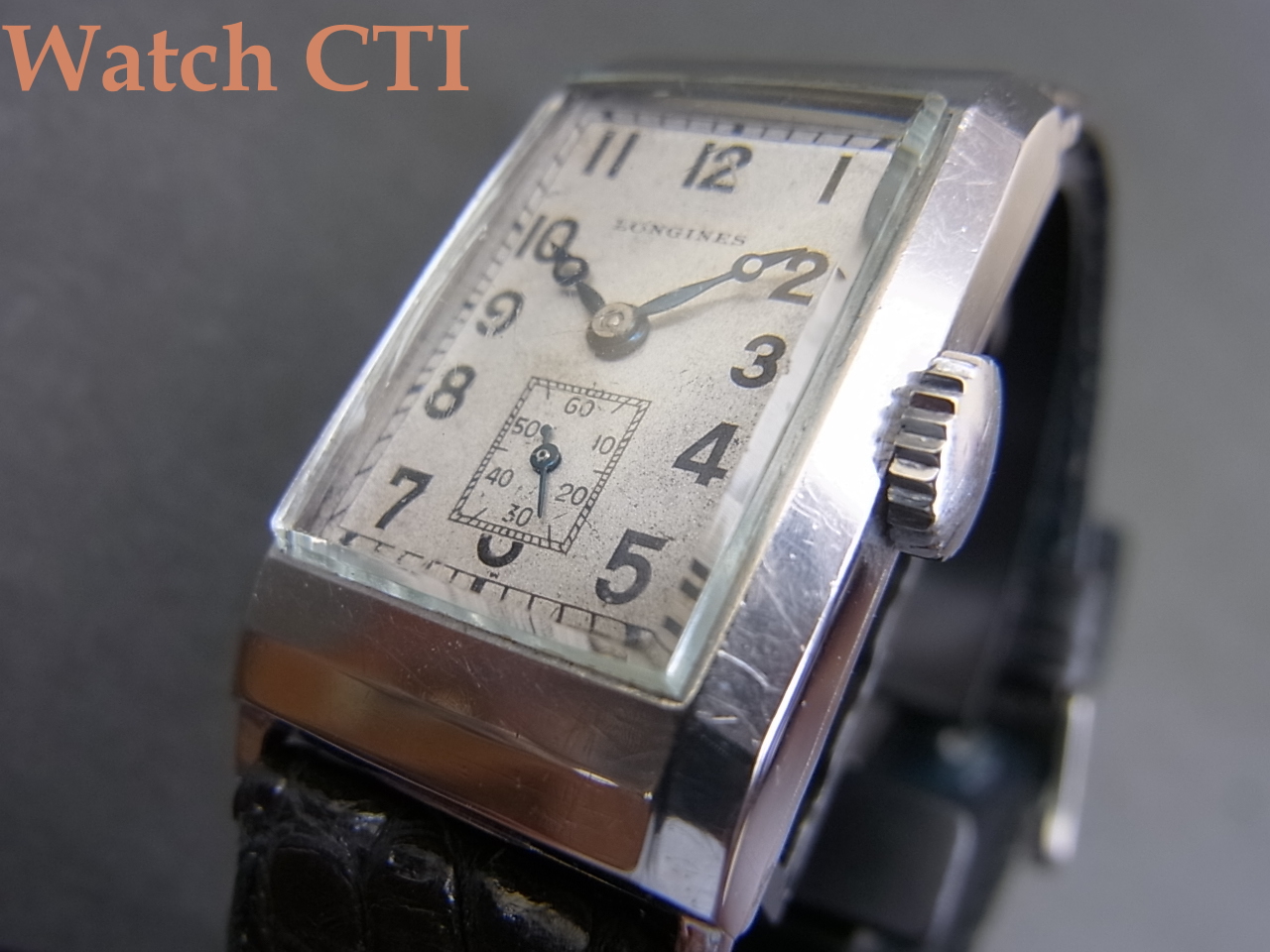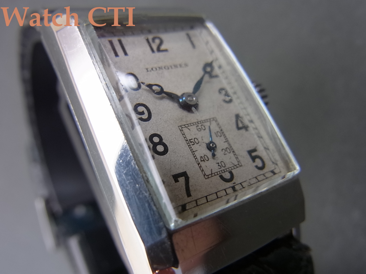 ケースはばね棒式ではなく固定バーが溶接されているものとなります。現在、仕入れた段階で取り付けられていたクロコストラップがついておりますが、それなりの経年ものの様で使用はされて居ませんがちょっとくたびれた感はございます。全体のイメージとマッチしている為そのままといたしました。….気になる方はお気に入りの巻込みタイプのストラップを新調してください。ムーブはロンジン角型の名機9Lの先祖C25.17で良い機械ですね!OHしたてです!