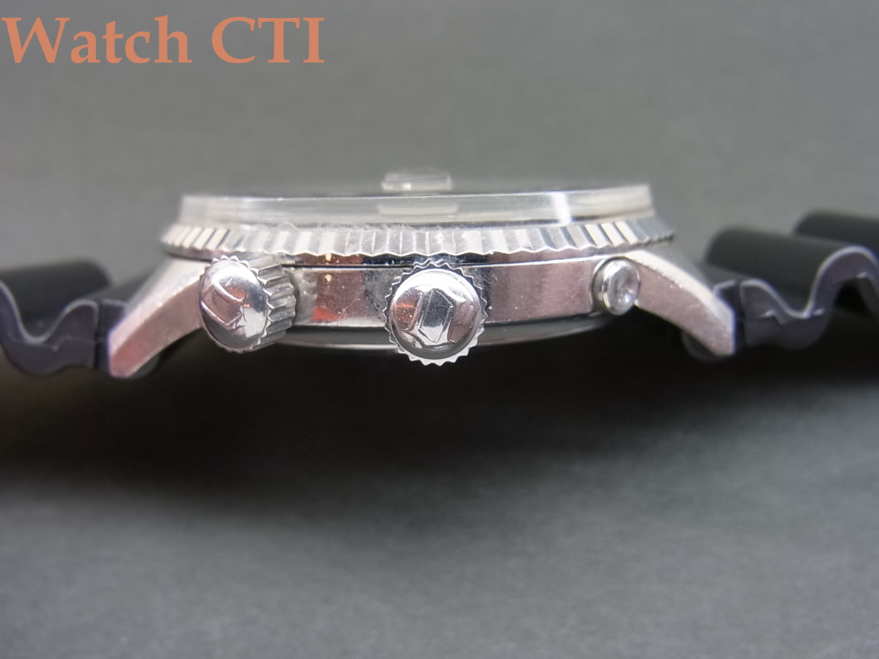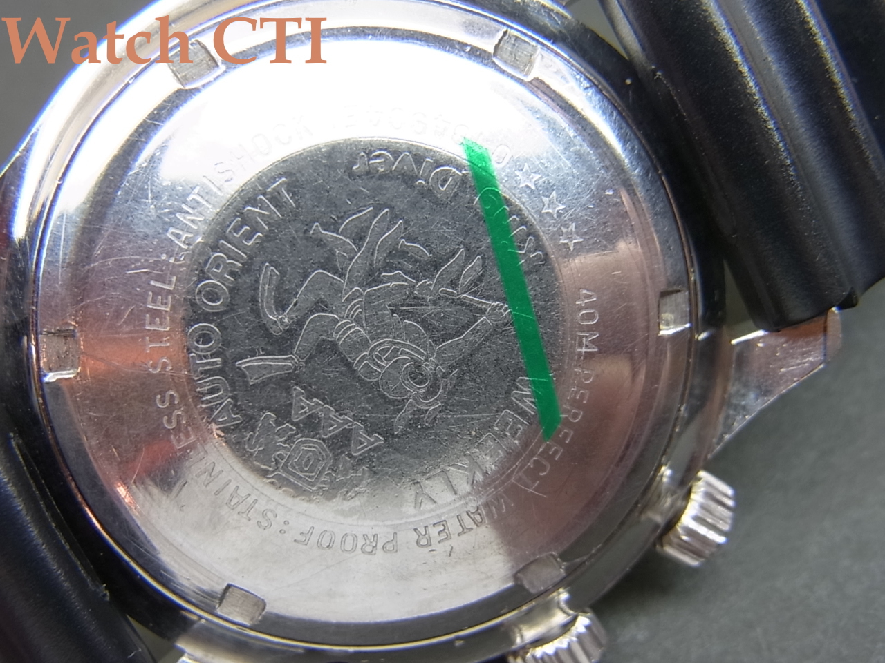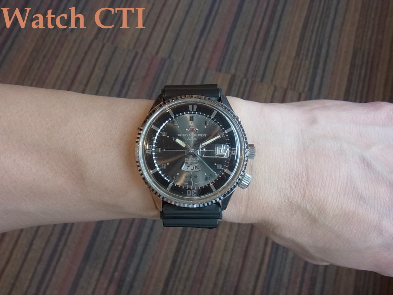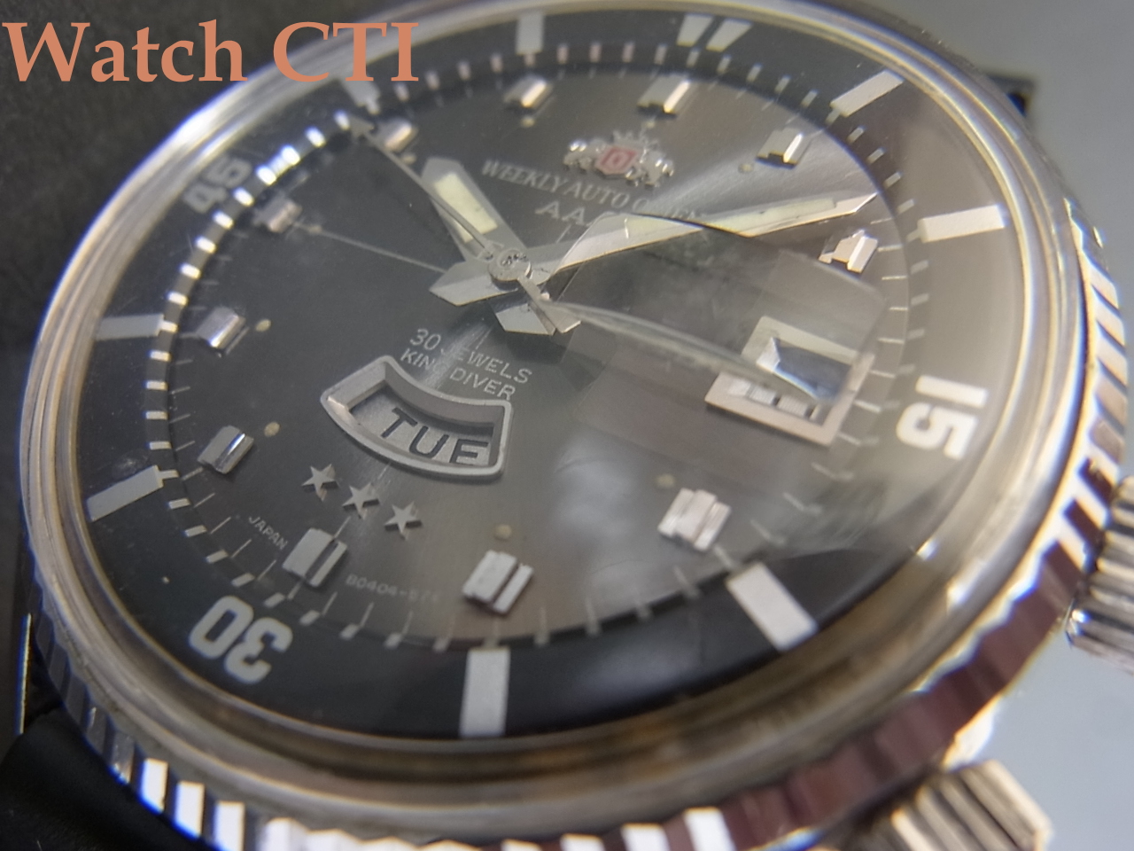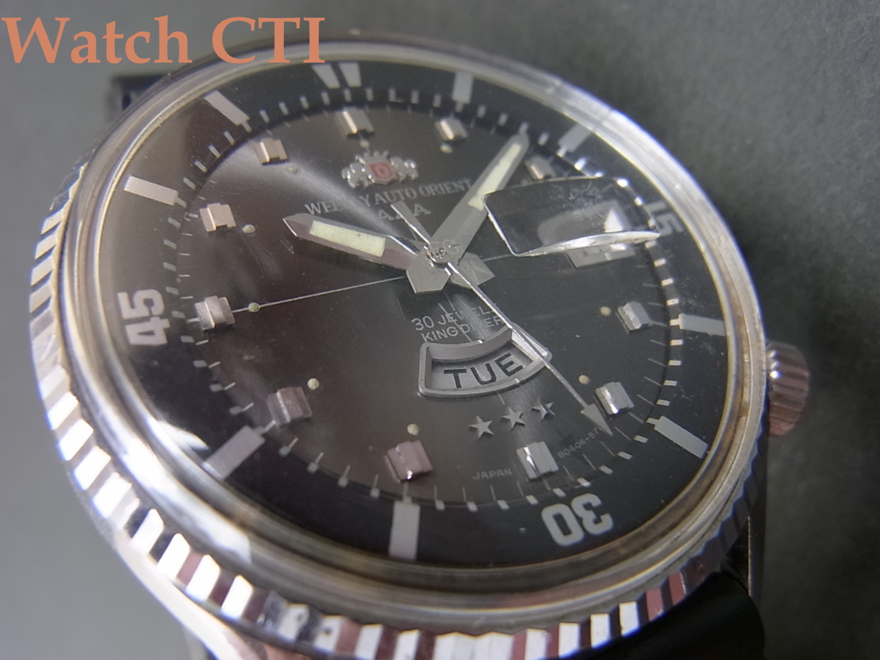 ☆非常に多くのヴァリエーションを発売してきたキングダイバーですが、この型が標準でしょう。ただし現品は30石ムーブ搭載で、一番多いのは23石かと思いますので上級ヴァージョンでしょう。全体に綺麗です。このサイズを60年代からリリースしていたあたり、オリエントは先見の明がありましたね!