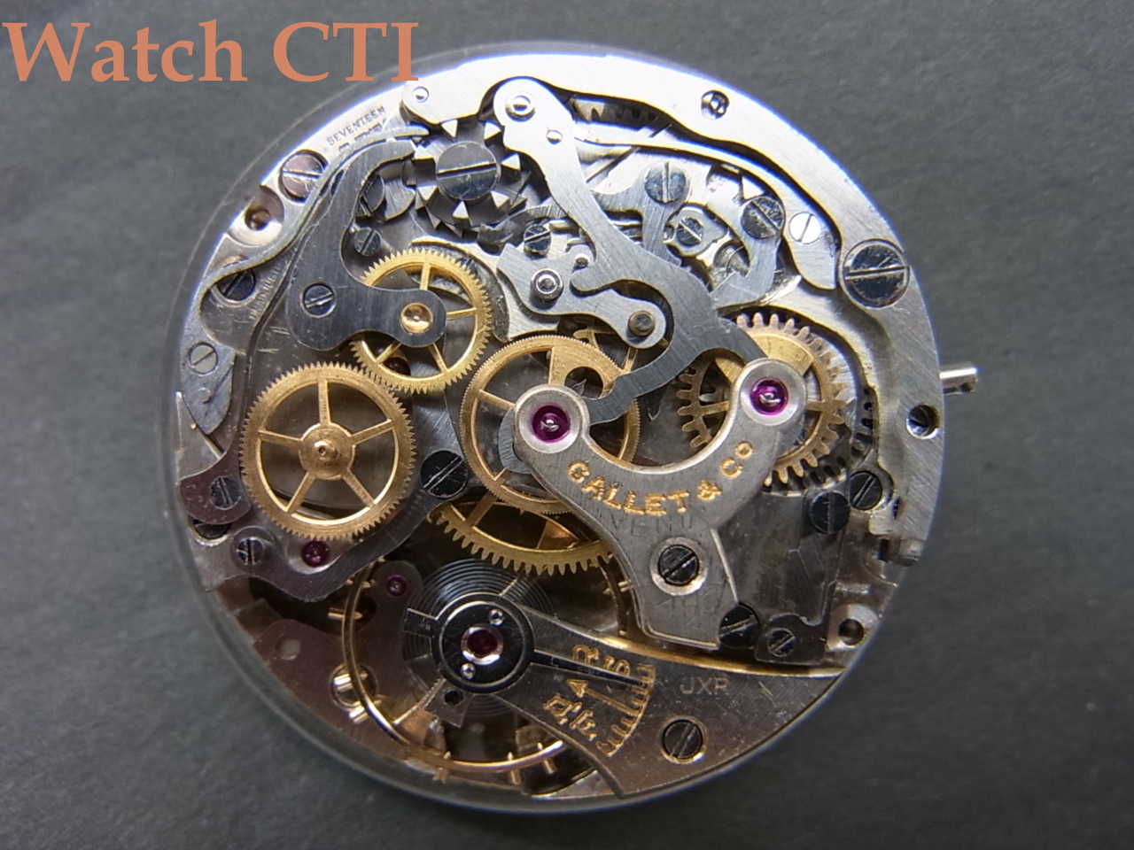 *搭載されるクロノグラフムーブメントはギャレットではおなじみのヴィーナス社製で13型のCal.150となります。古典的構造でこれぞクロノグラフという外観が何とも頼もしい限りですね!もちろん「ピラーホイール」式です。