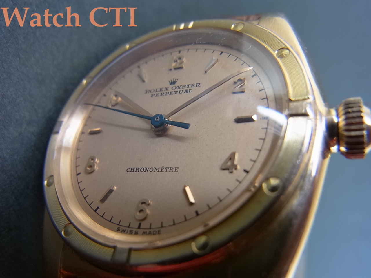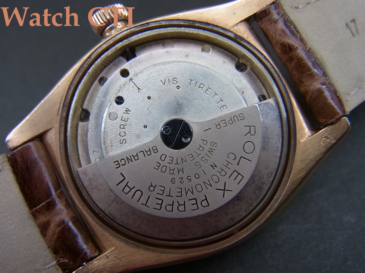 *機械はこれ以降のロレックスを一躍「大ブランド」と躍進させた「パーペチュアル」です。ま、「自動巻」です。しかしこの全回転式のローターを搭載して実用に問題のない製品を1934年に投入できたという先進性には驚かされます。スイスの他有名マニュファクチャーを「出し抜いた」といっても良いのでしょう!素晴らしすぎます。この全回転ローター式自動巻成功があっての今日のロレックスの名声であることは疑いようのない事実なのです。そしてその歴史の証人がこのバブルバックのパーペチュアルであり、もう一つの名声の源「オイスターケース」であるわけです。
