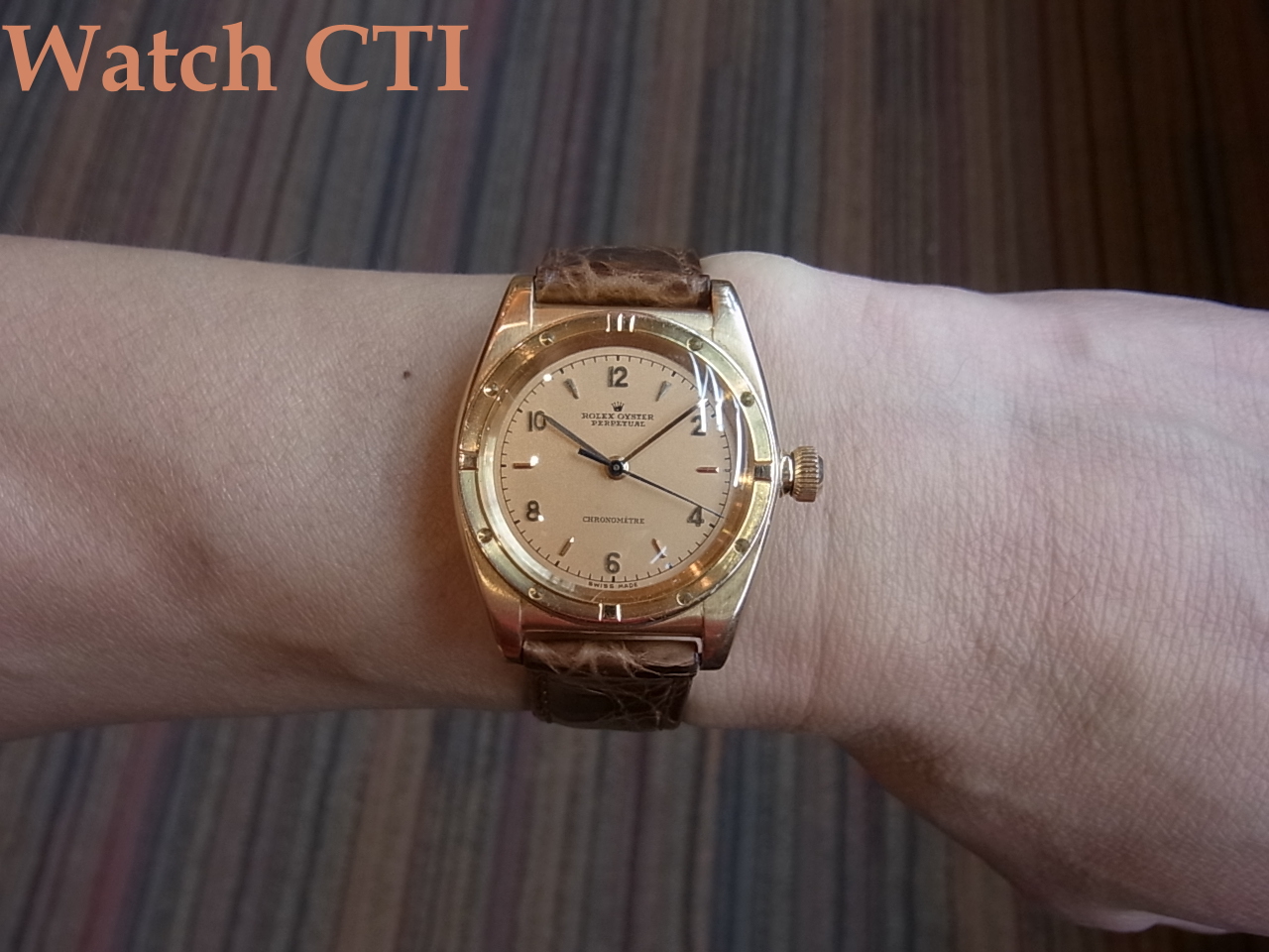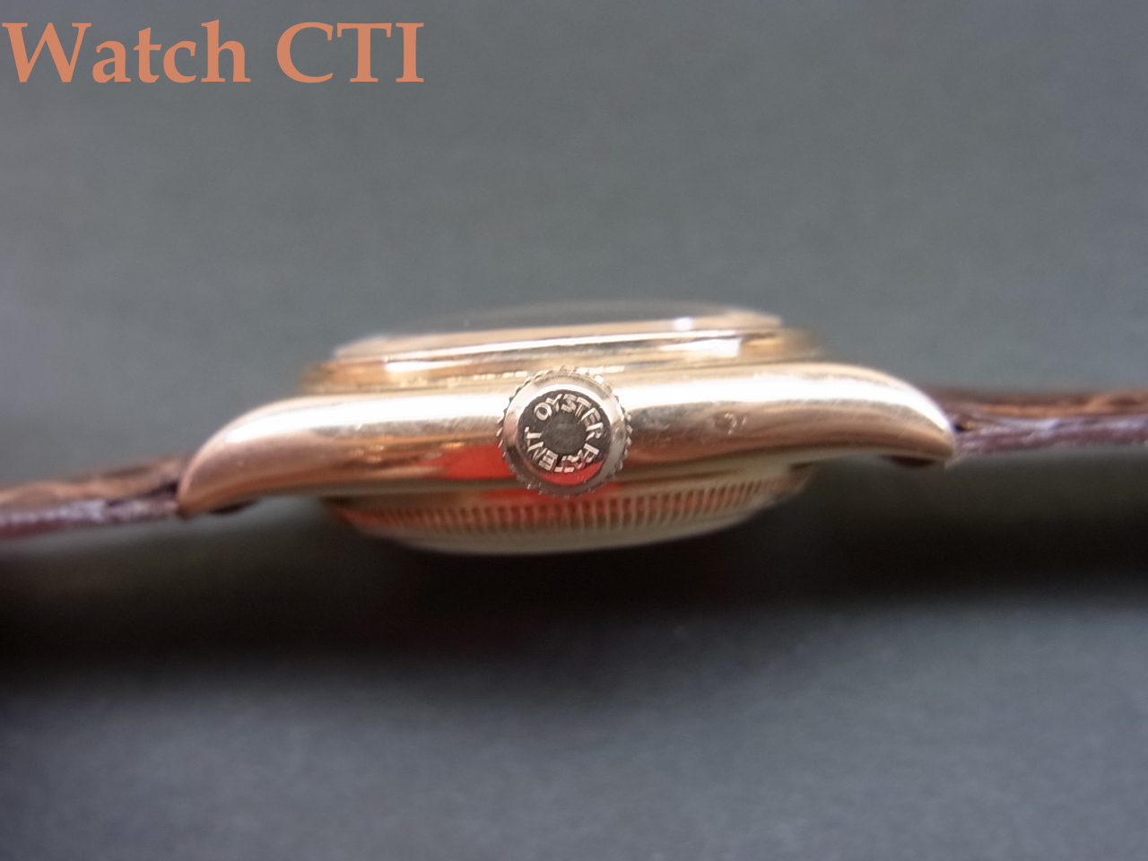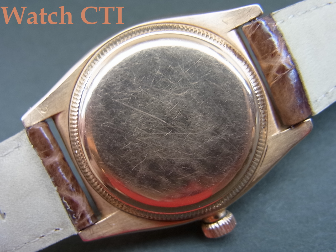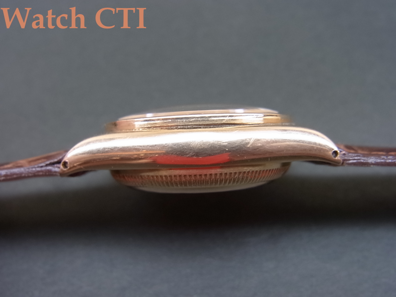 一般的には「ピンクゴールド」または「ローズゴールド」と称されておりますが….わたくし的にはシャンパン系の色合いを感じる、非常に上品な色合いで、ロレックスのこのころの製品に特に顕著な色合いだと思います。40年代中期から50年代後期にかけての少数のモデルに見られる色合いです。ほんと良い色なんです。