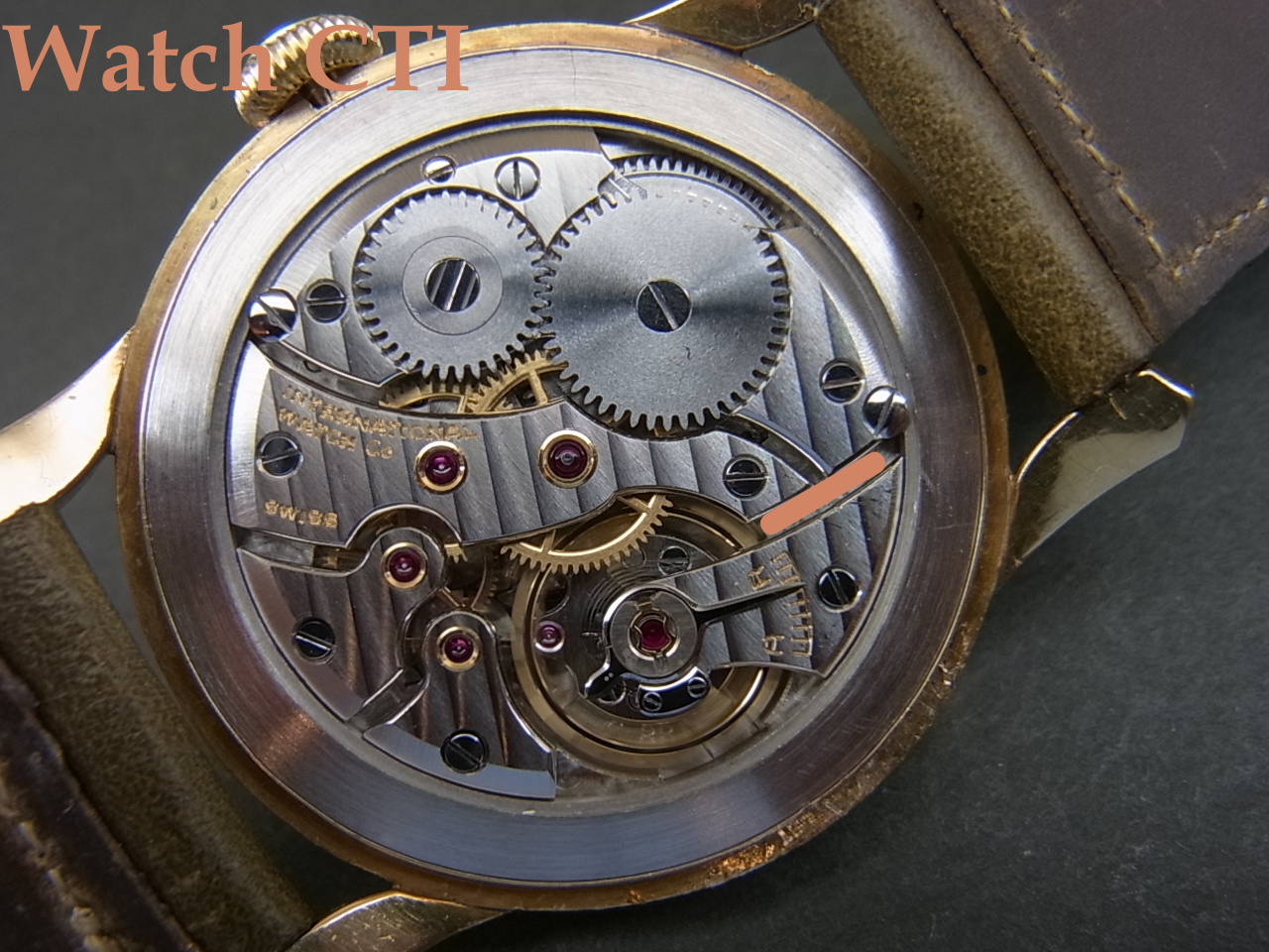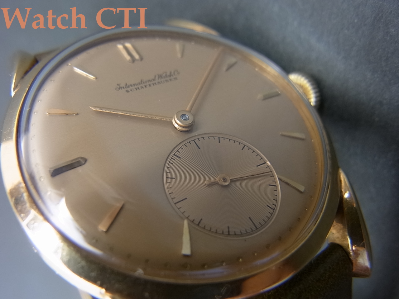 ダイアルは非常にプレーンなもので、おそらく経年した色合いは、ちょっとサーモン掛かったようにも見えるクリーム系の中間色。インデックスの楔型も押し出し感よりはそのダイアルカラーとの整合感のほうが勝り、控えめな中にも強い信念を感じさせるようなダイアルですね。パテックの35mm位のモデルでもこのような佇まいのものがありますが、このIWCもおとなしい顔つきの中にも凄味を感じます……..。