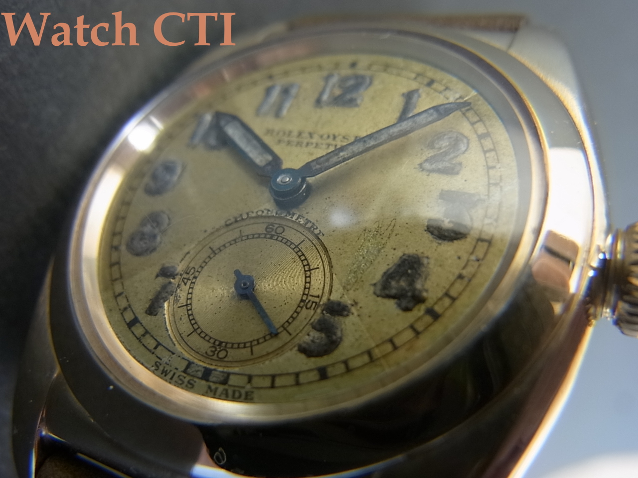 2.ダイアルは全体に荒れています。しかしこれが30年代からのオリジナルコンディションといえるでしょう。夜光は相当以前に盛り直しされていますが既にオ リジナル年式に見合うような経年具合となっており、肉厚に盛られた雰囲気がなんとも言えません。4時位置内側に表面がこすられた荒れがあります。