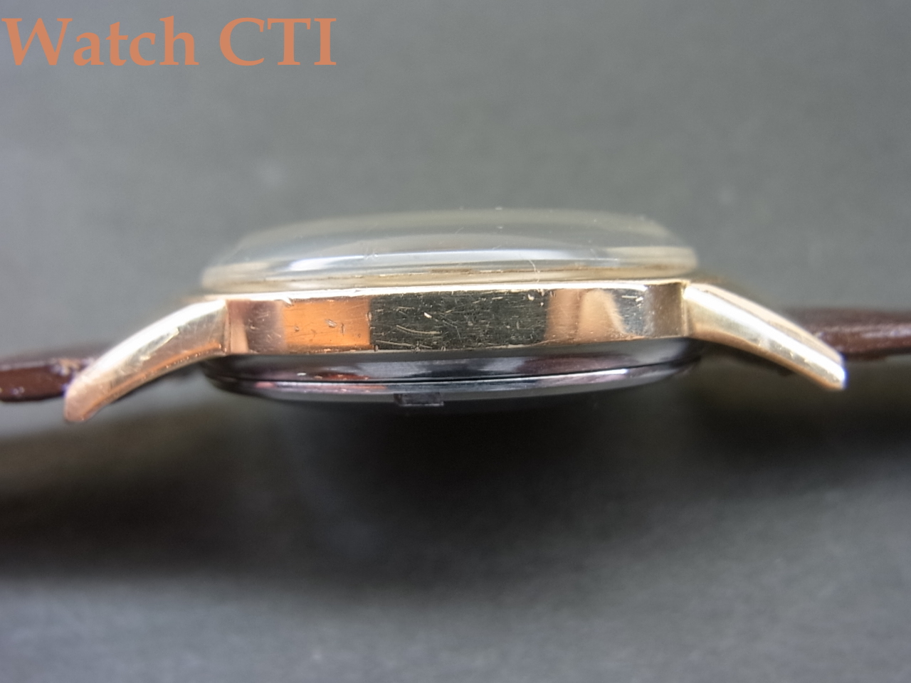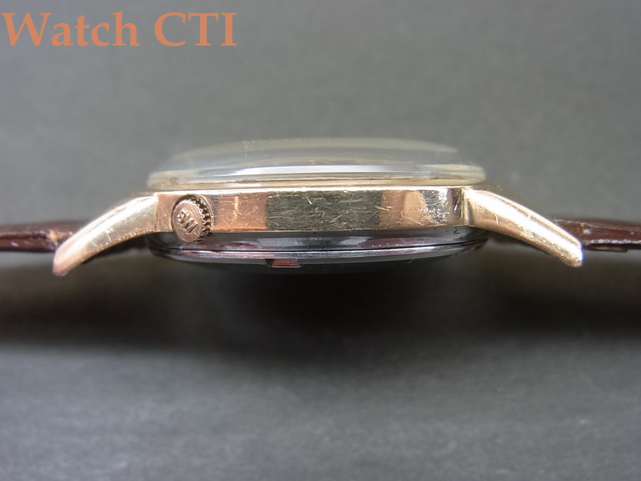 しかし、このトップゴールド製ケース…..ベースの金属がステンで固く、その上にとっても柔らかいゴールドを被せているために、きつくあててしまったりすると表面のゴールドの方が「変形」しやすく、現存する同製品も特にラグの表面金張が歪んでしまっていて見た目に可愛そうな品が大変多いのが実情ですが、、、今回の品は「よし!」です。