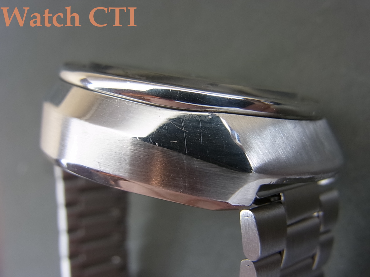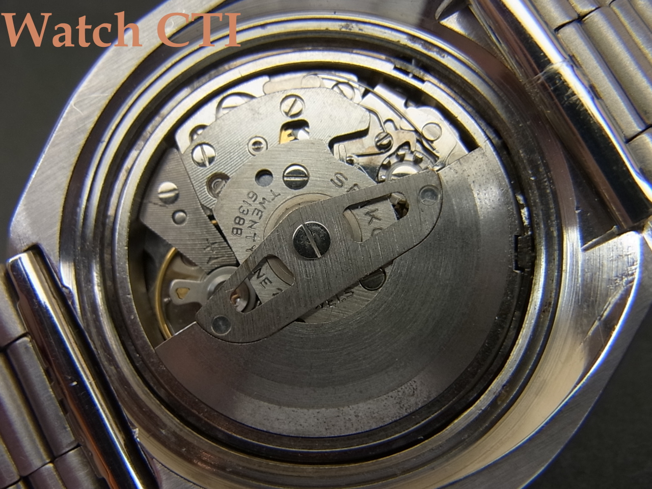 今回入荷の品は外装ポリッシュが入っておりますが、それほどヘビーな磨き込みではないかと思います….そして壊れてしまって残存していない場合が多い純正の華奢なブレスレット…..、やはり、この品も純正品は失われており、代ってSEIKO銘のオールド汎用品が付いております。シンプルな3連の薄めタイプですので当時のオリジナルの雰囲気はでていると思います。