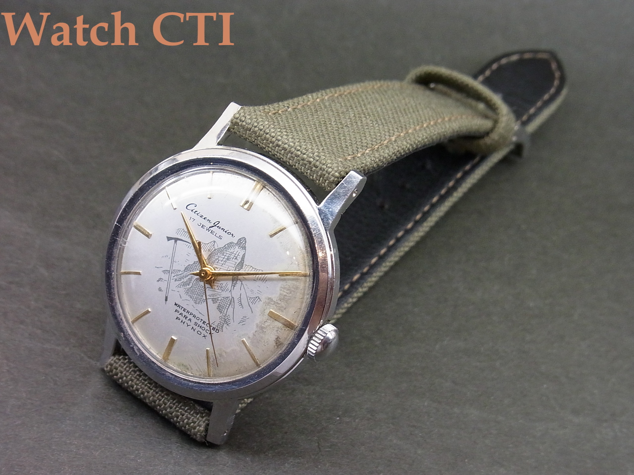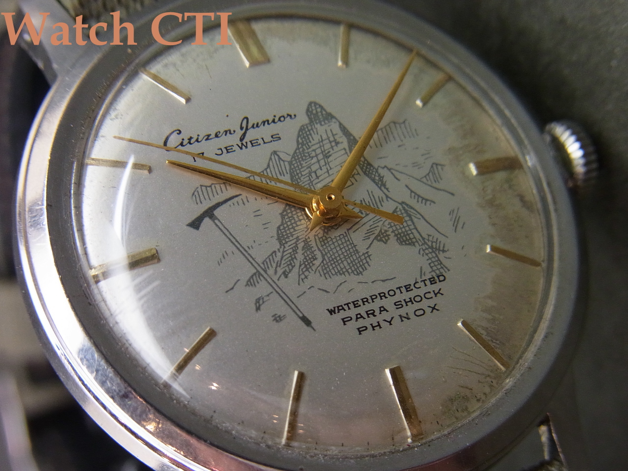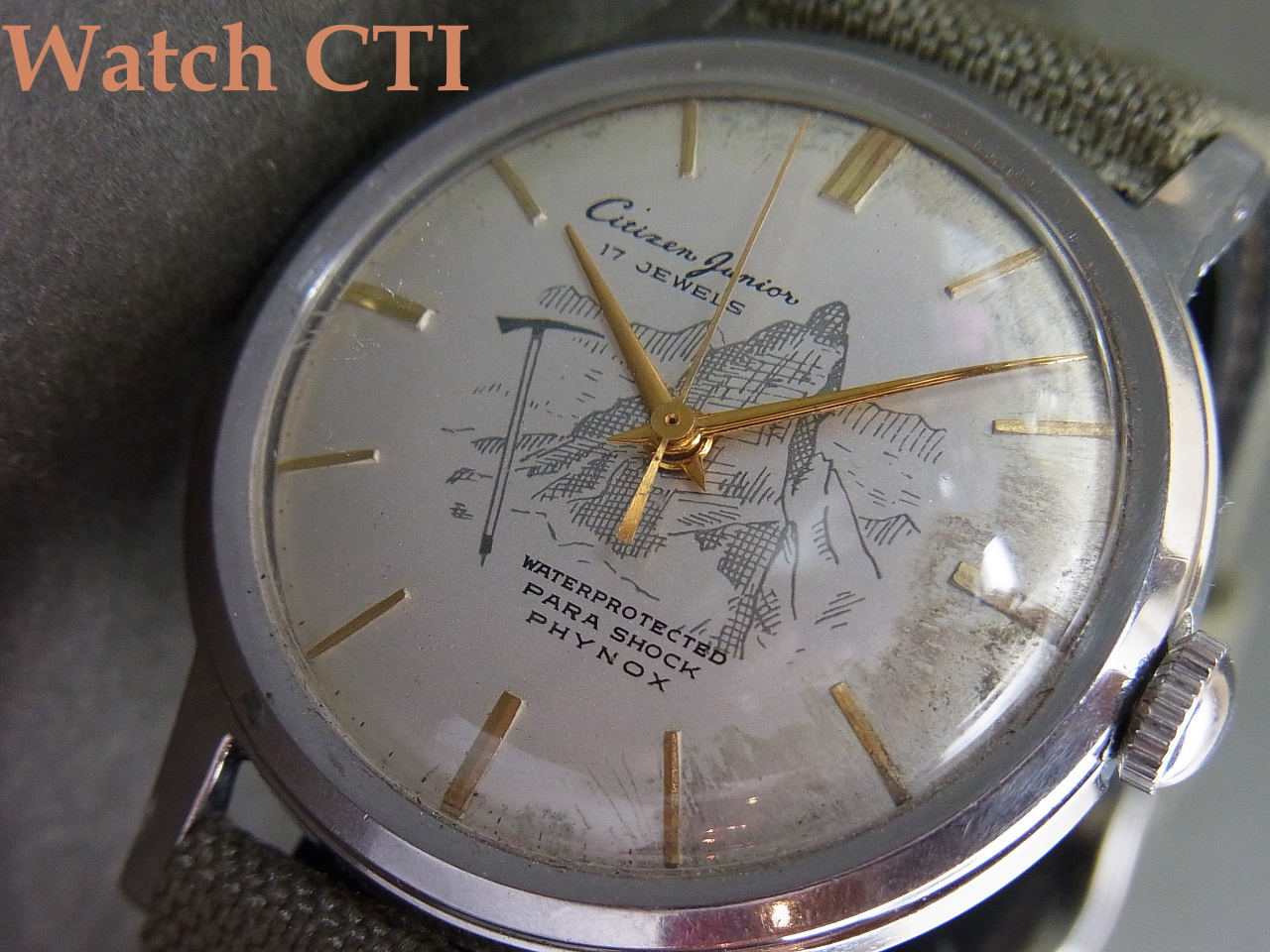 *という訳で、パラウオーターが発売される以前のウオータープロテクティドケースの力作は…..その防水性のアピールの為でしょう、文字板に愉しい登山図柄を入れてその性能をアピールしたかったようです….文字板にはシミが出ておりますのでご了承を。(実際に登山に使ったのかもしれませんね!)