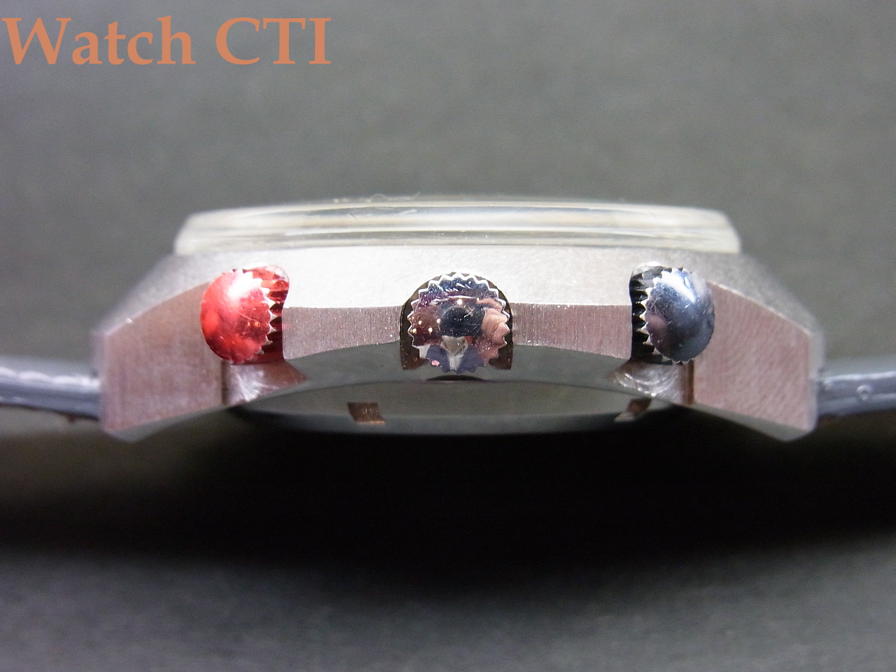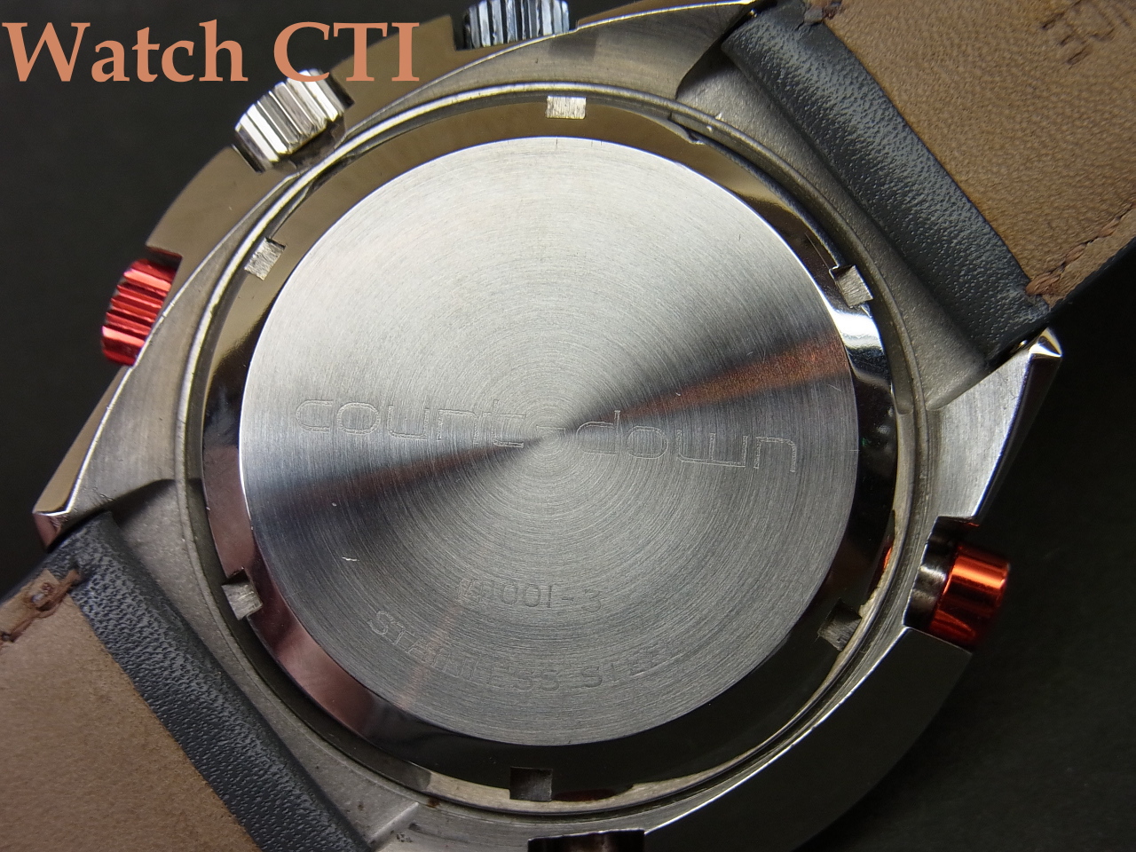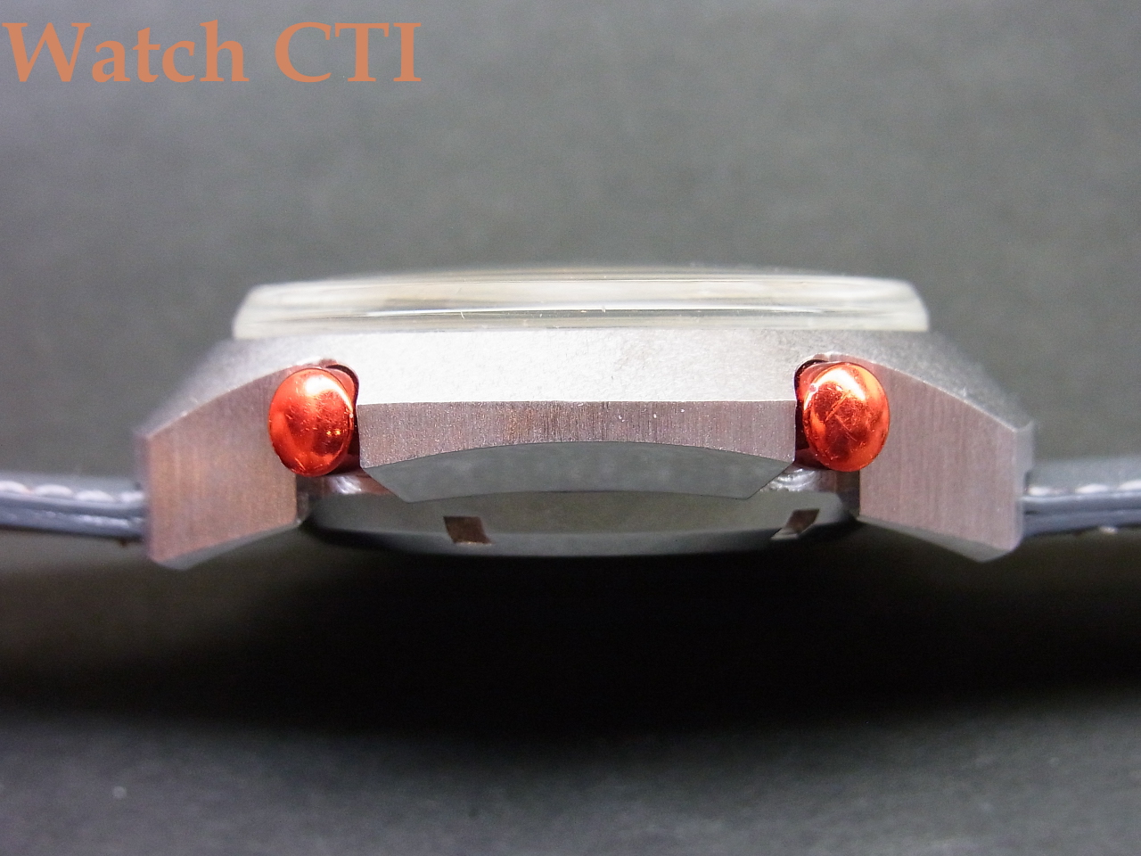 リング操作用のリューズを3時側に、クロノグラフ操作用プッシュボタンは9時側で、各々色付きとなり何とも仰々しいのですが、それが良いのです!!