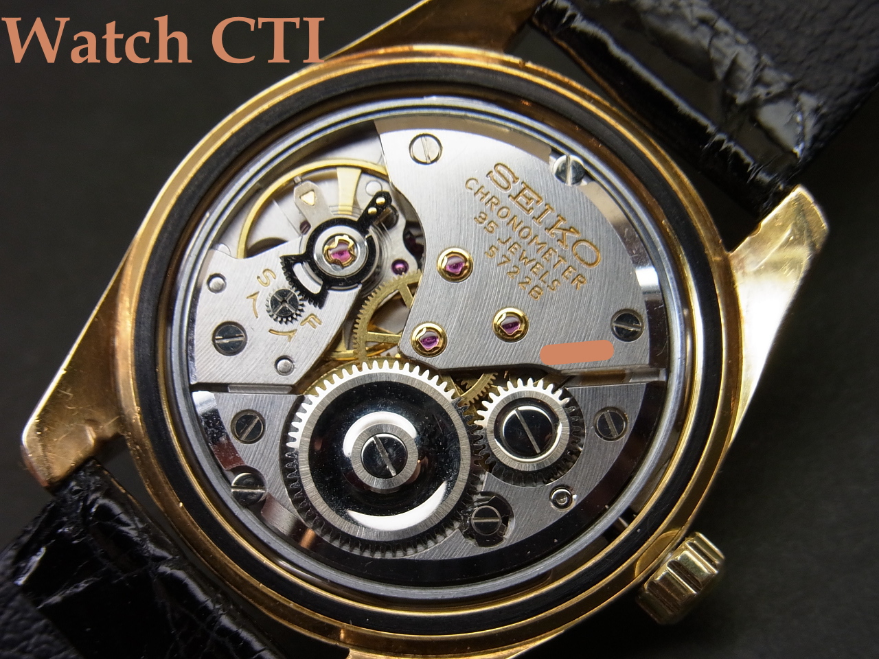 *こちら、グランドセイコーのセカンドモデルとして知られる57GS(ゴーナナジーエス)ですが、非常に僅かな本数が18金無垢で製品化されたました。そして、搭載される機械に注目なのですが、現品は5722BのCHRONOMETER銘刻印の機械となります。5722Bはセイコーとして初めてちょっとだけ「高振動」化を図った機械で…5.5振動というそれまでの基本5震度を10%ほど高振動化したものでした。
