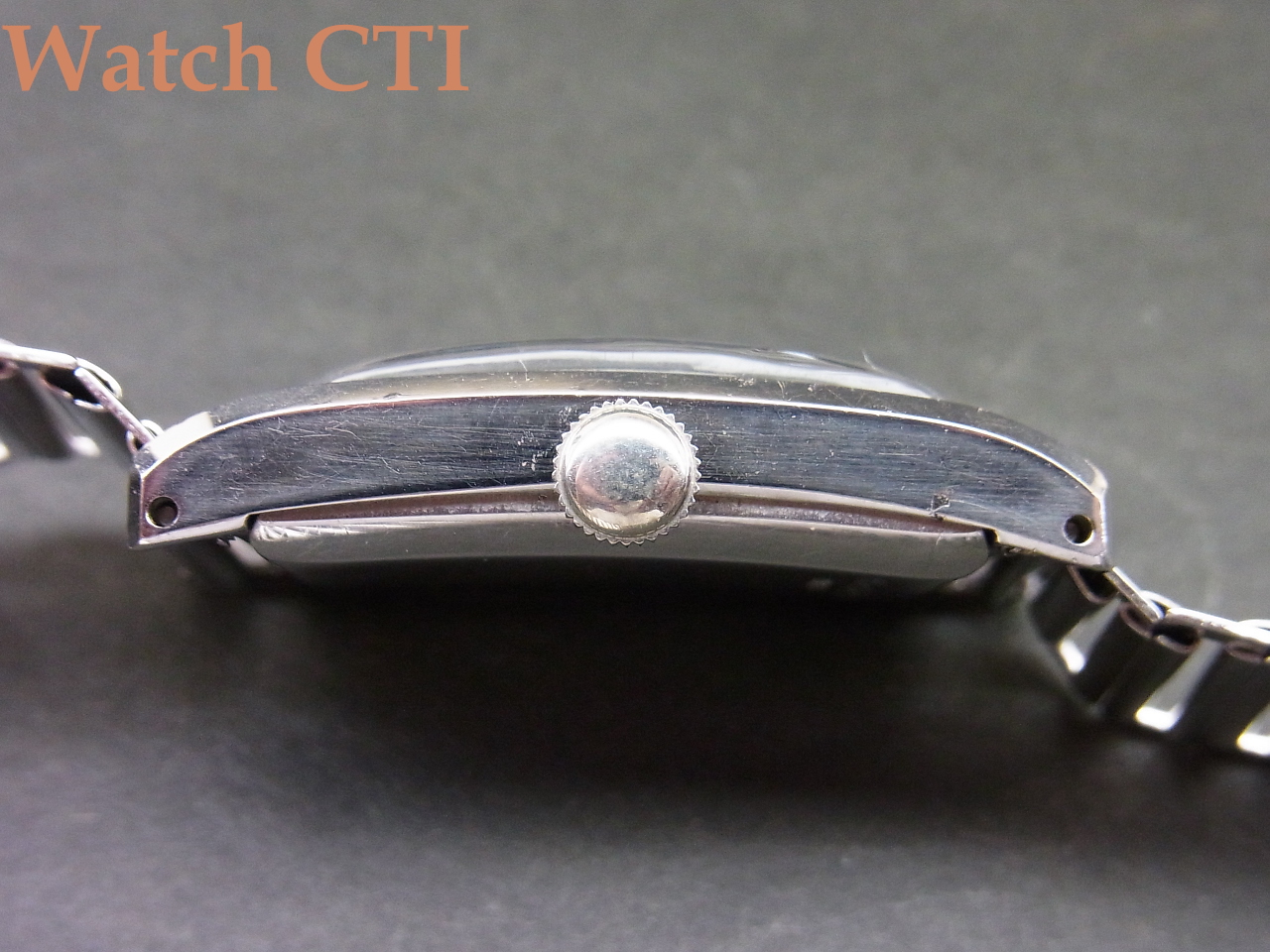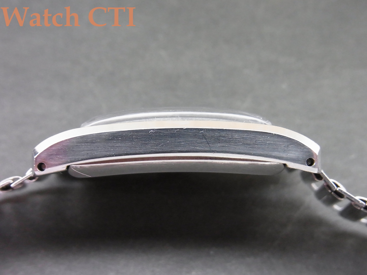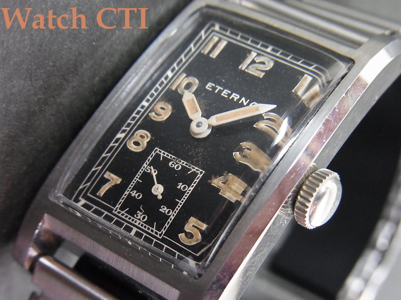 ☆ダイヤルがやられやすい角型ケース、現品は防水を意識した4つビス(イモネジ)式の恩恵もあったのでしょうが、ギルト仕上げのミラーブラックダイヤルもそこに乗る夜光インデックスとペンシル2針も….してケース自体も、そのシャープさなどから、相当に保存状態の良い逸品と言えますね!
