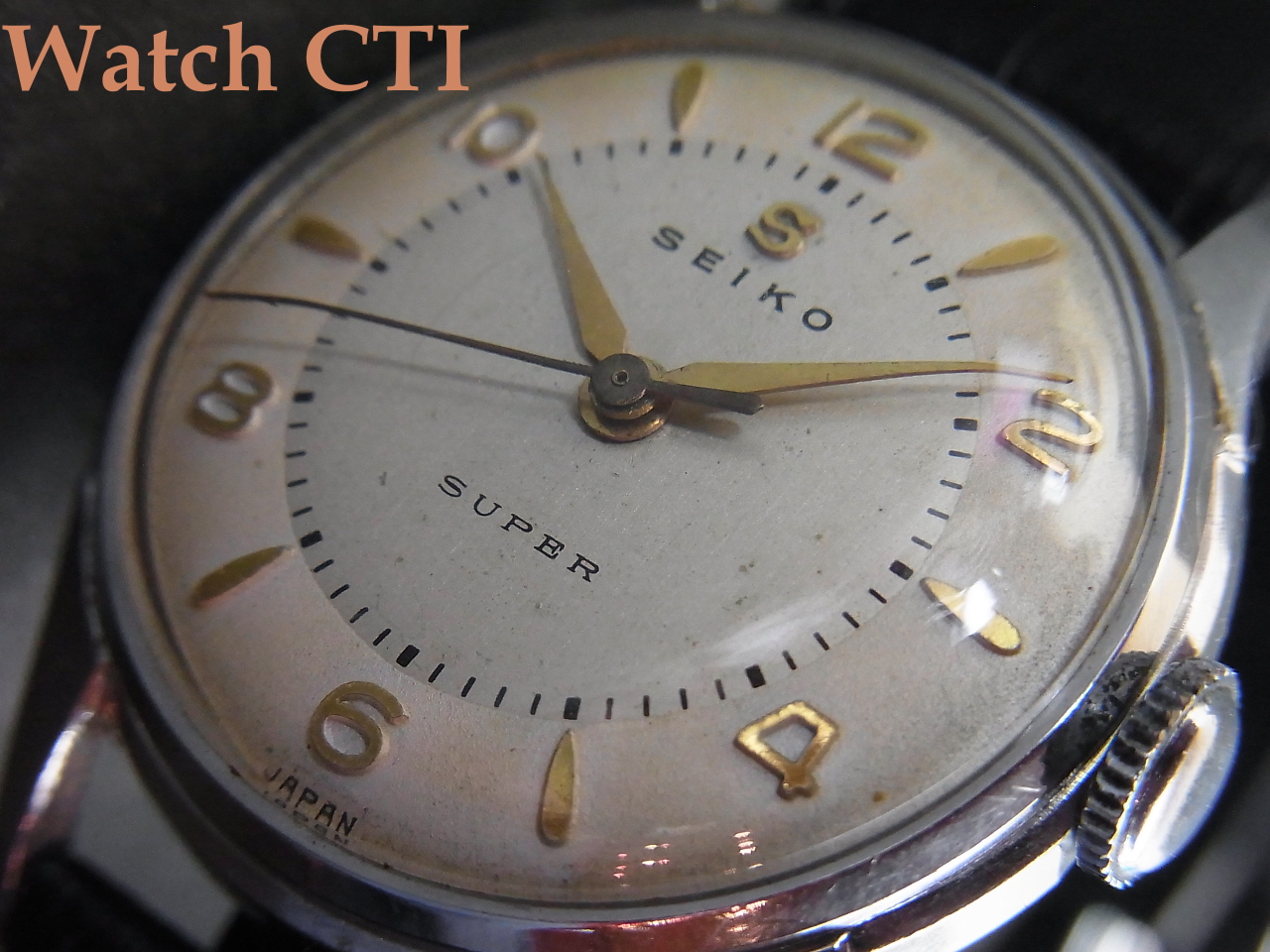 *魅力的なツートーン仕上げの文字板に少々の経年変化がでており、ケースも使用されたままの小傷や表面的擦れ等散見されますが、まさにビンテージテイスト!いえる味わいです。是非!!