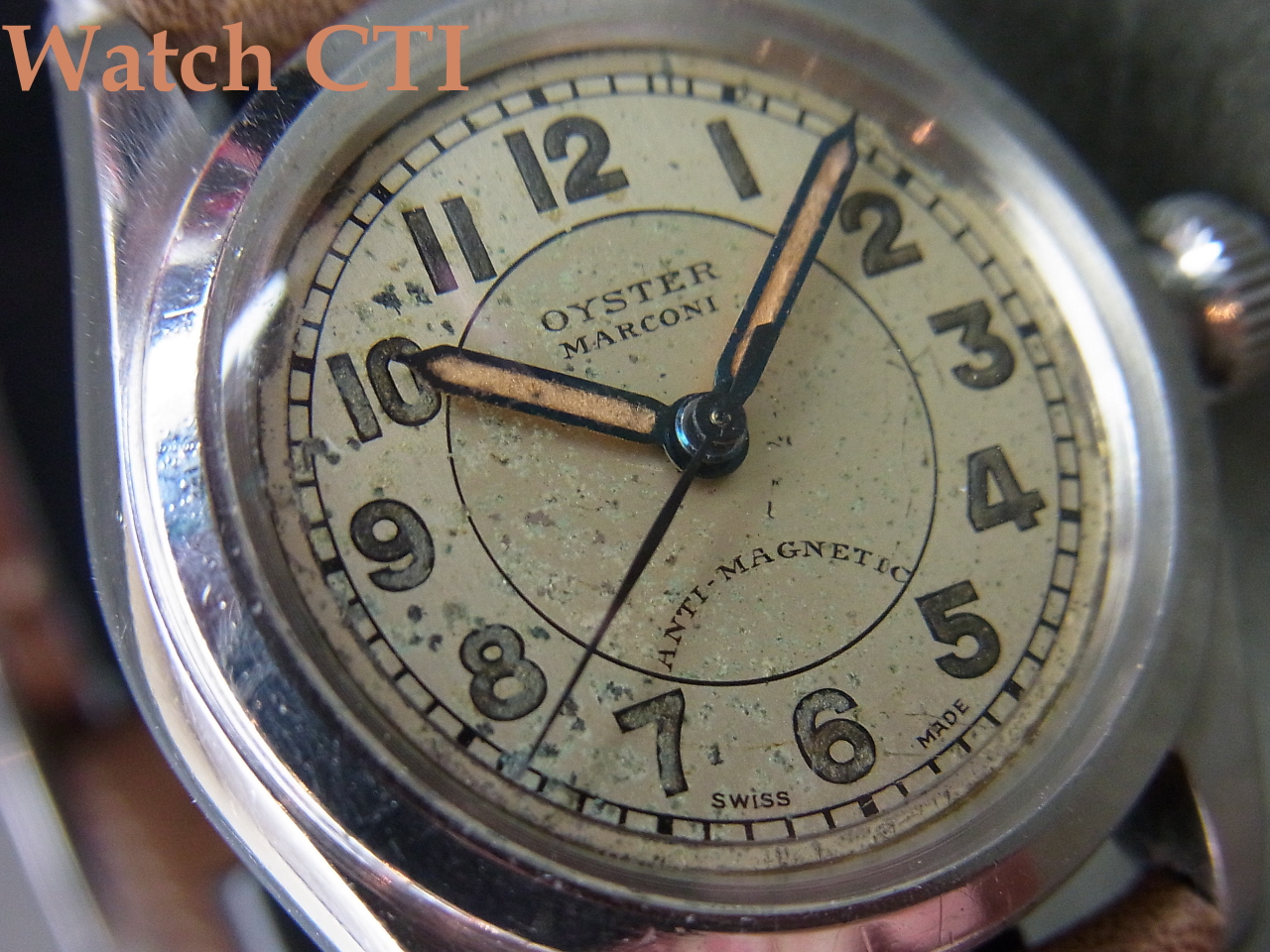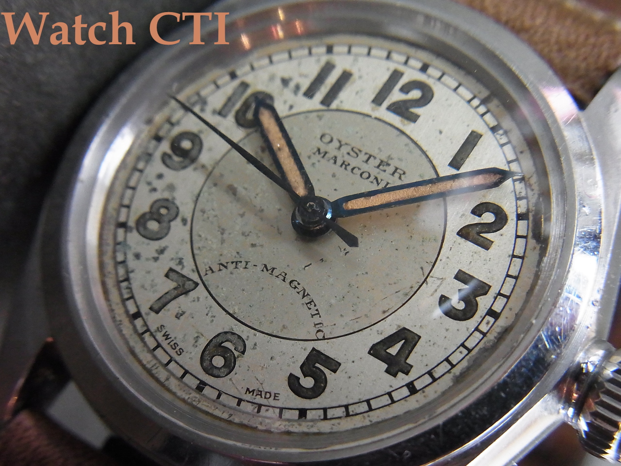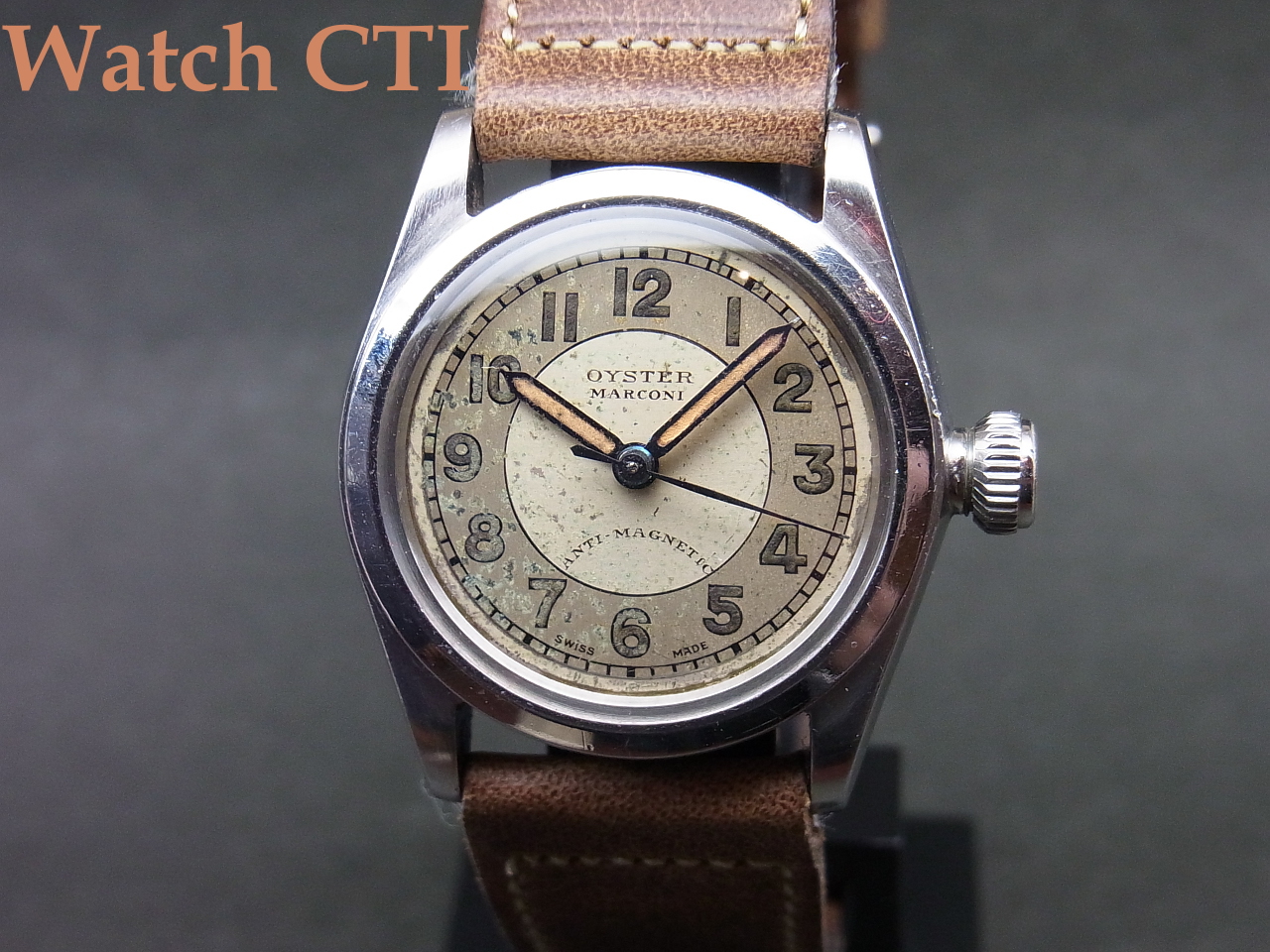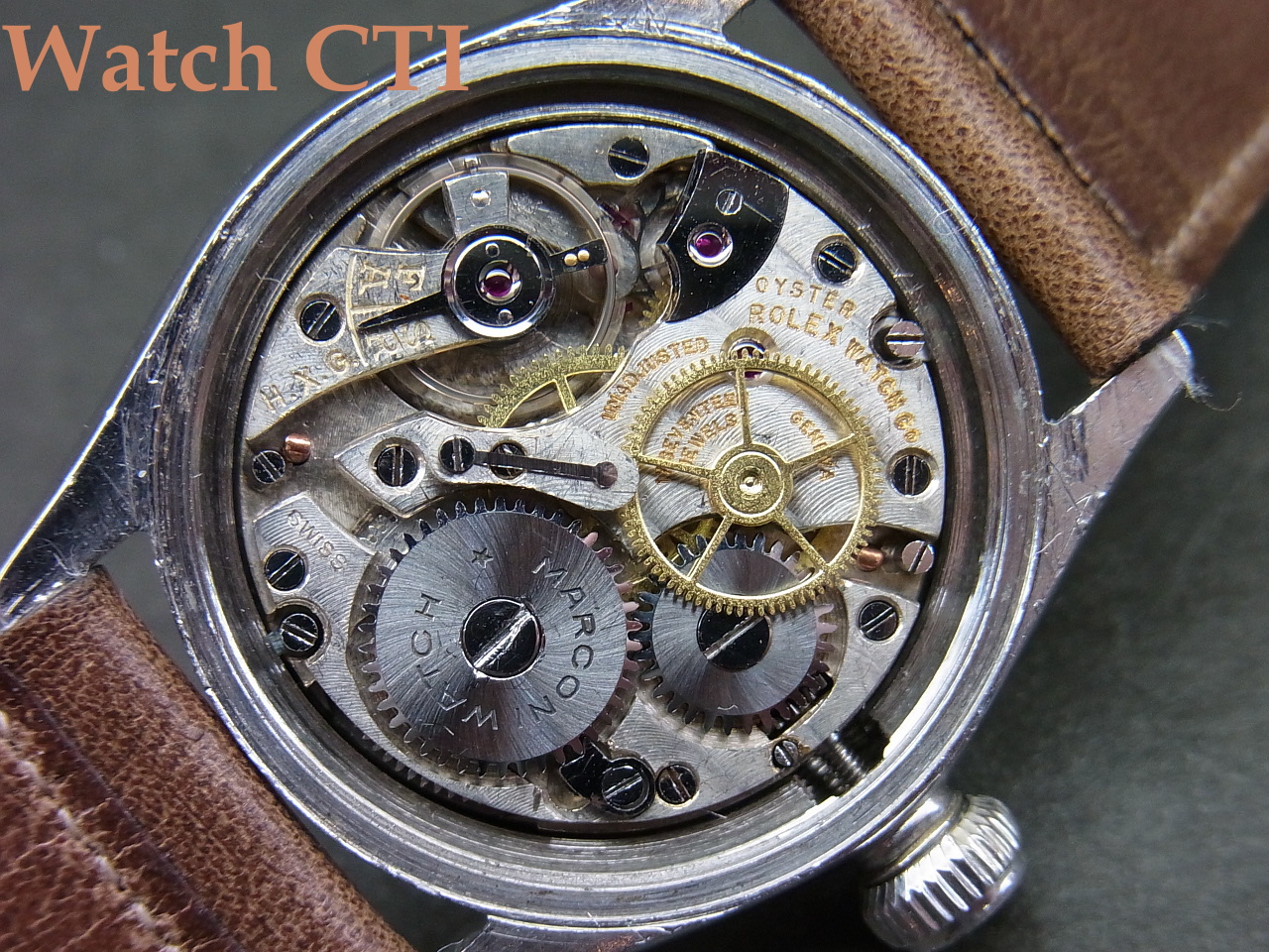 *搭載される機械も通常のOYSTERで使われるAS製ではなく、ロレックス製10型C.700系ですが、ROLEX銘の製品自体より良質な機械を搭載しています。MARCONI WATCHの銘が歯車の上に確認できると思いますが、テンプ受けにH.X.Gという輸出刻印(フランスの輸入時刻印と聞いた覚えもあります)があるのでスイス国内用ではないです。