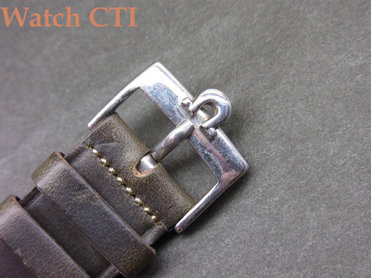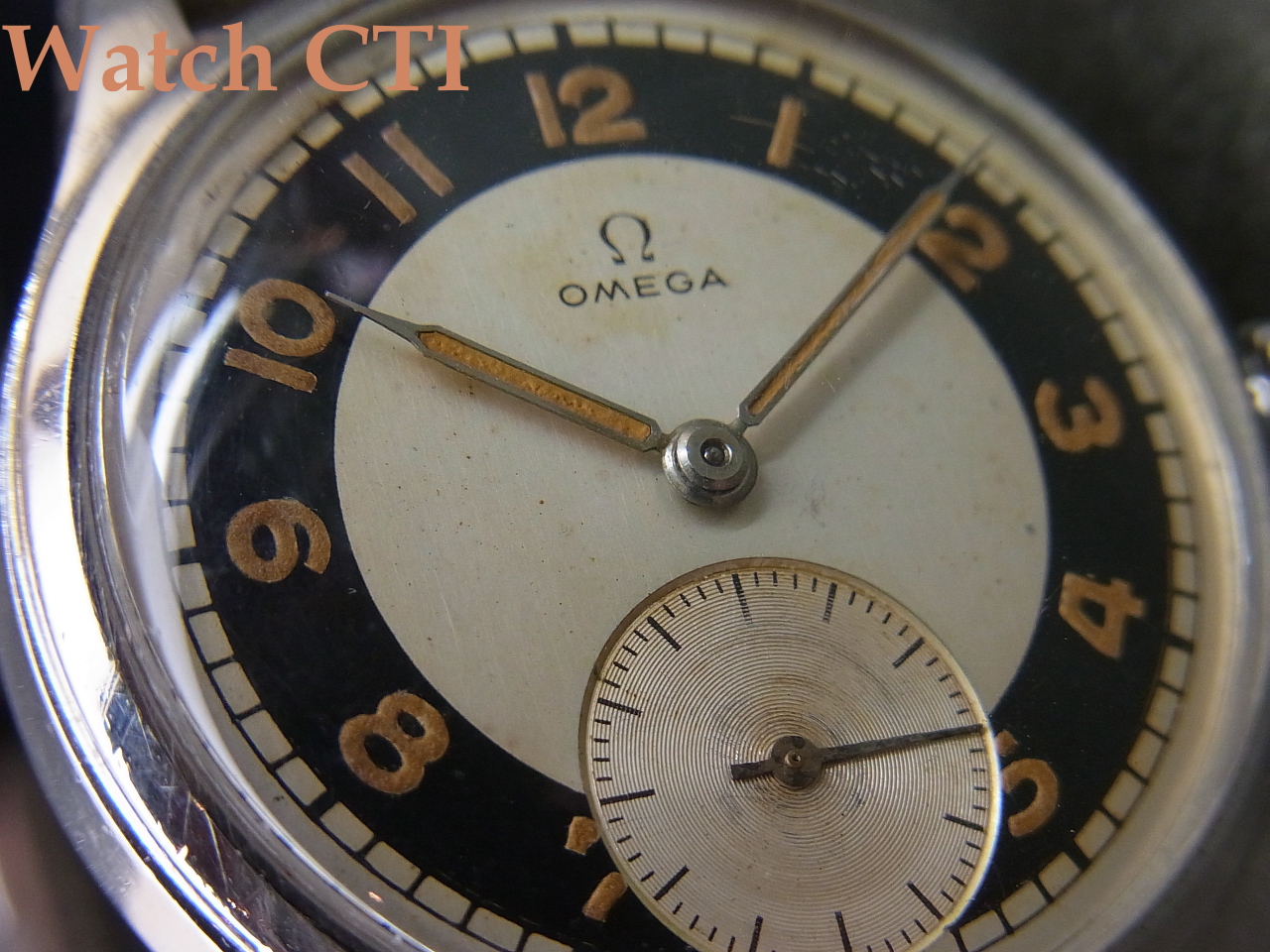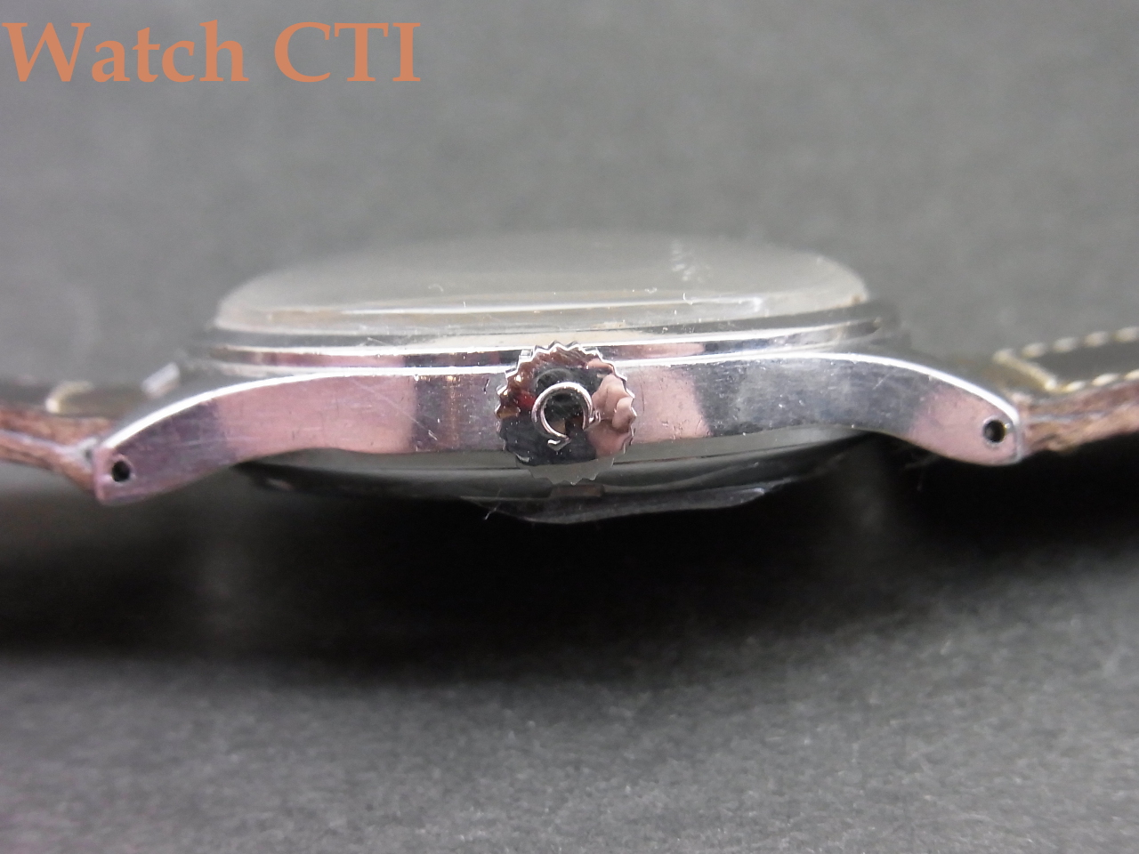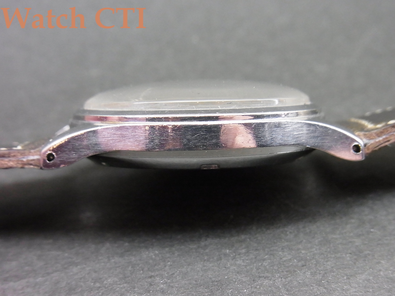 ケースとダイヤル共に、幾種類かの仕様が確認されておりますが、現品のようなツートーンのいわゆるブルズアイダイヤルに夜光アラビックインデックスは割合見かけます….が、大抵は数字の配置が正常の立ったもので、現品のようなルーレット配置は非常に少ないようです!!!カッコ良いですね!!その夜光インデックスは長短針の夜光とともに後年の入れ直しですが色合いなどヴィンテージ感を損なわない枯れた状態です!