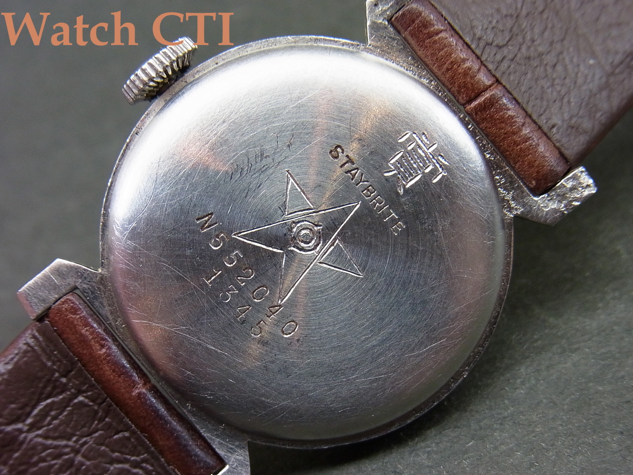 ケースにはSKSなどの刻印はありませんが、、、多くのセイコー戦前/戦後モデルで見慣れた4桁ケース型番入り(ここでは1345)そしてケースバックのNと5で始まるシリアル番号….もしセイコーのその後のシステムと同じならば….終戦から間もない1945年の11月という事に….(1935年11月の線は無いと思います)さらには、献辞入り「賞」に星と「日立」マーク….ちょっと紐解いて観たくなる一本です….!!