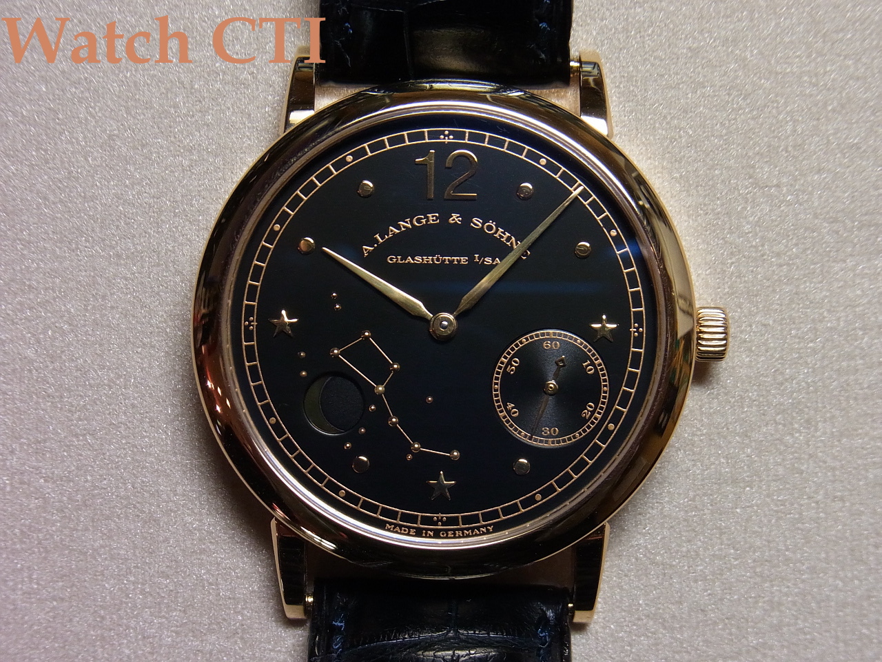 ピンクゴールドとマットブラックのダイヤルコントラストが非常に美しく、ダイヤル上に描写されるアプライドの星空とその間に浮かぶムーンフェイズとのバランスが、正に溜息が出るくらいに「美しい」です。