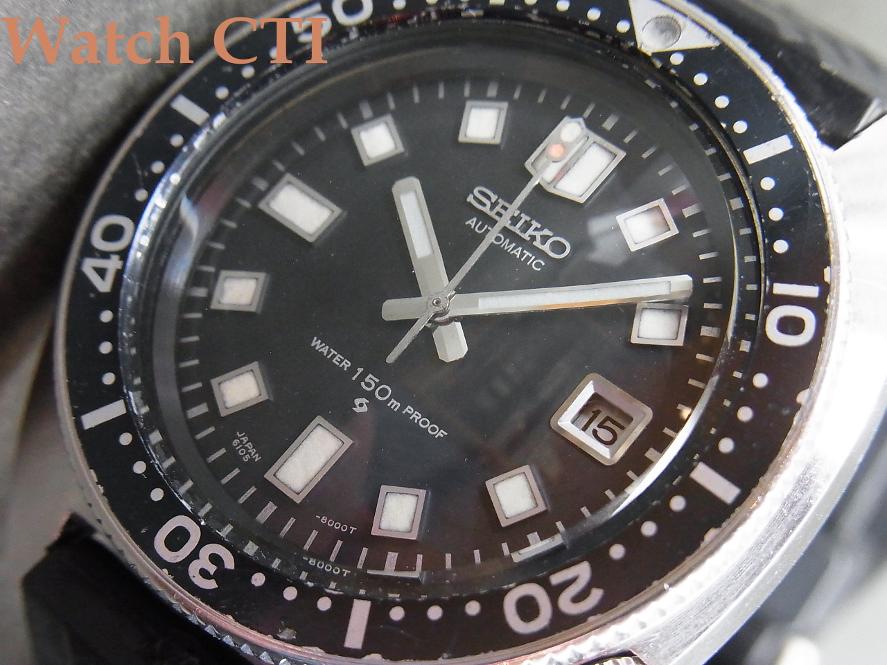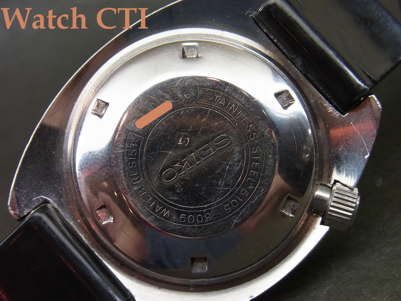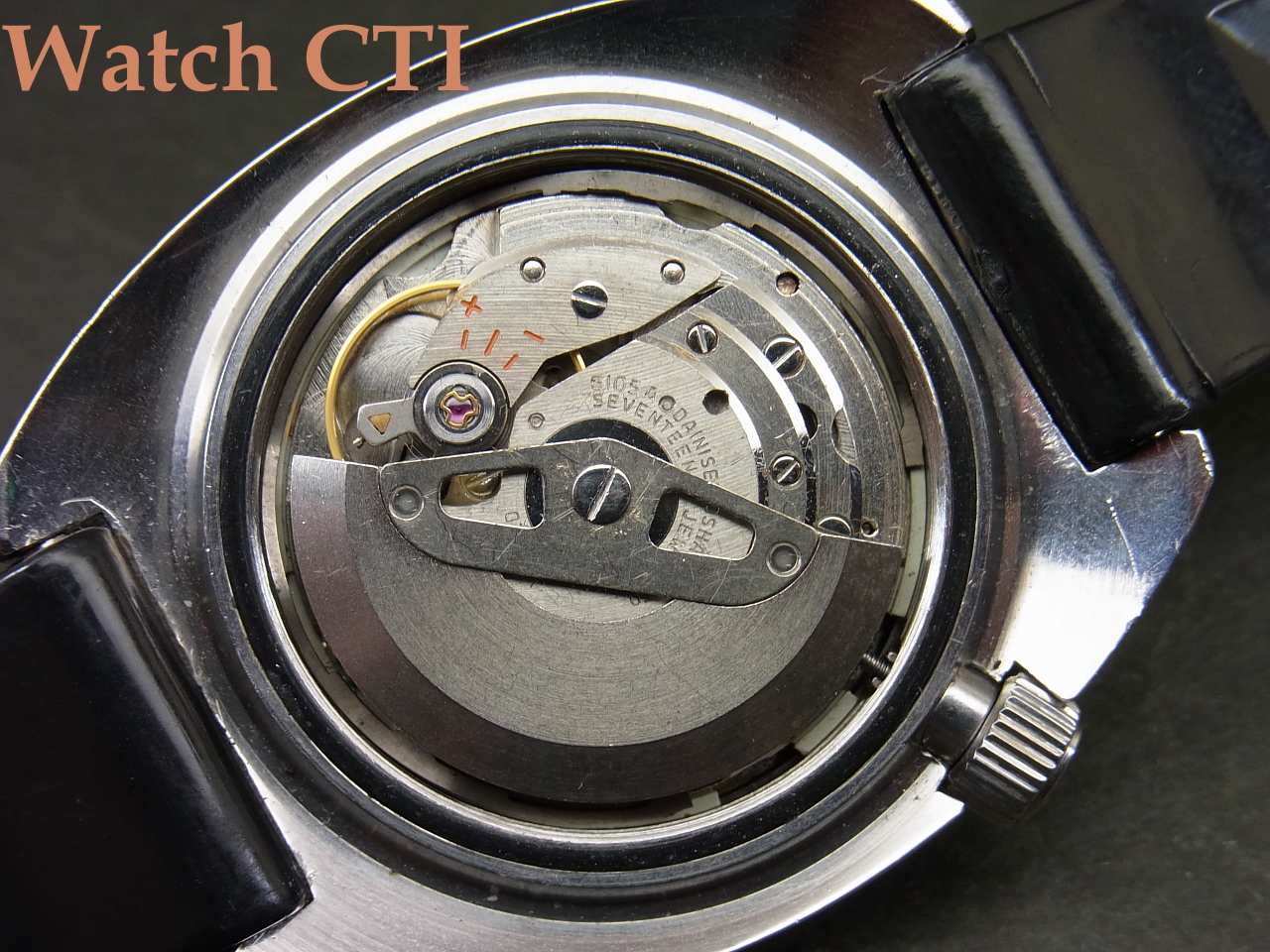そして機械の状態ですが作動自体は問題ございませんが、ローターのがたが出ており、国内仕様のプレートに交換すればベアリング一式でガタの少ない中古と交換可能なのですが、そうすると海外仕様の刻印で無くなってしまう為に、ローター下センターに薄い銅板プレートを入れてガタの調整を図り、現在ローターは非常にスムースに回っております。また、機械を保持しケースに装着するプラスチック製ホルダーが経年で公開し収縮しているために機械にガタが出ます….これはSEIKOの他モデルで使用するリング状板バネをケースバックとの合わせ面に入れてガタを除去しております。