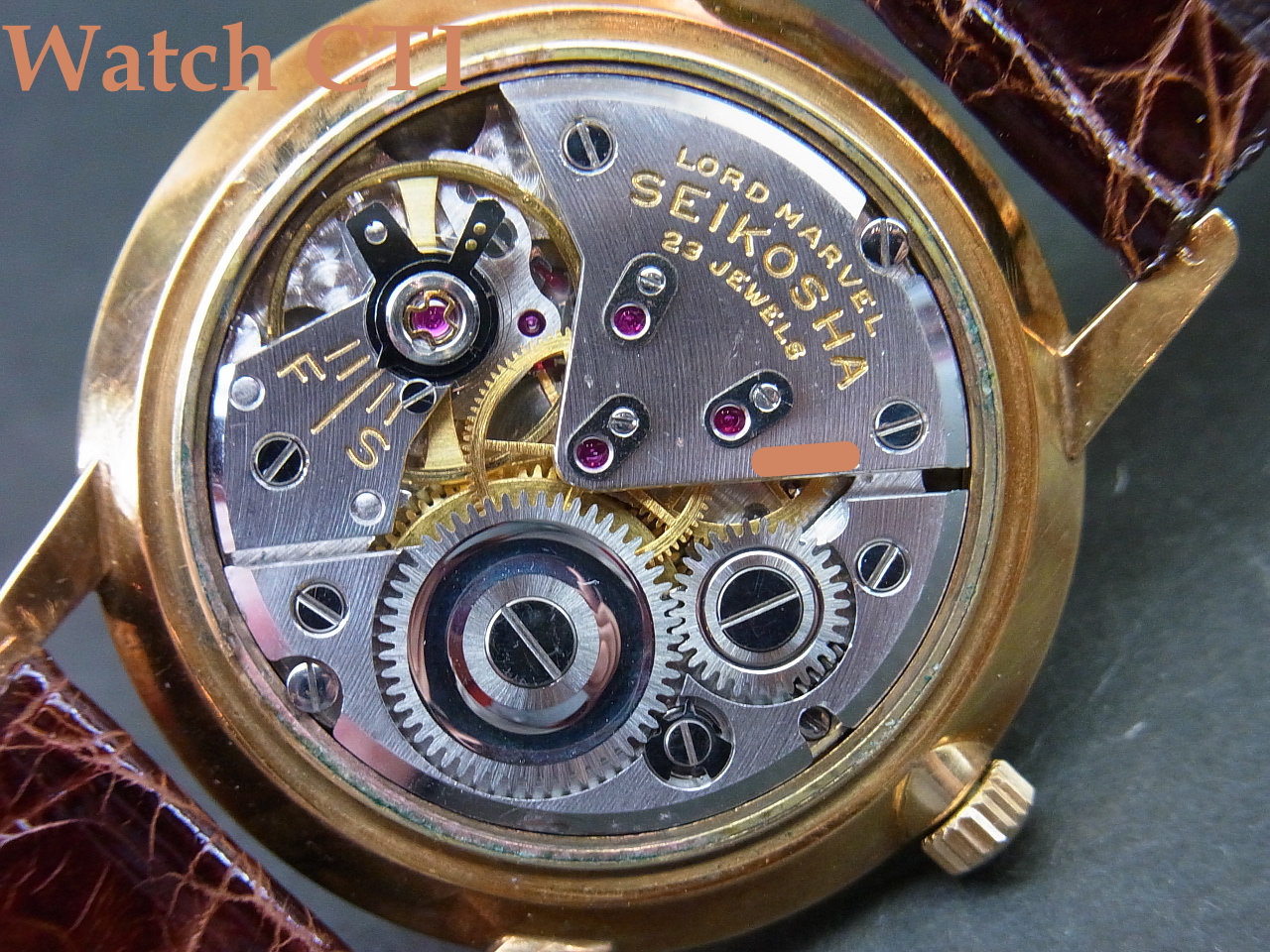 ☆18金無垢ケースとしてはラグ歪みもなく、ケースエッジもしかっり出ており、文字板のクリーンさと合わせて、得難いコンディションと思います。機械も非常に美しく保たれており、セイコーが手掛けた初代「高級機」に対する熱意を感じるものがありますね!