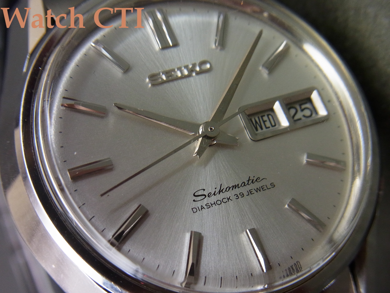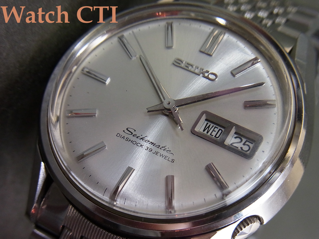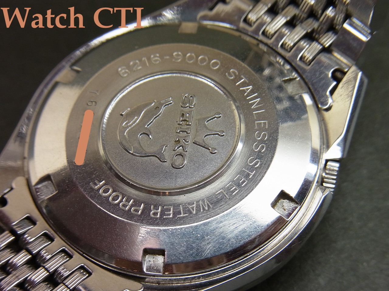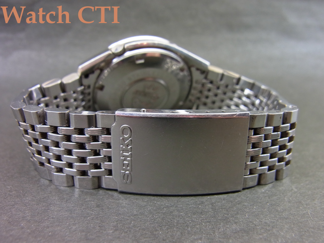 ポリッシュ仕上げのコマにスレート刻みが入っている当たりが異なりますが、当時物のセイコー製ブレスであり、メーカーもブレス違いを出荷していた可能性は十分に考えられます。当時のブレス事情は何とも「それなり」な感じで、国産メーカーのメタルブレスはどのメーカーの個体もイマイチな出来が多かったものです….こちらに装着の個体などは相当出来の良い部類に入ると感じます!