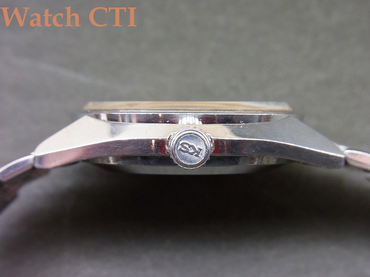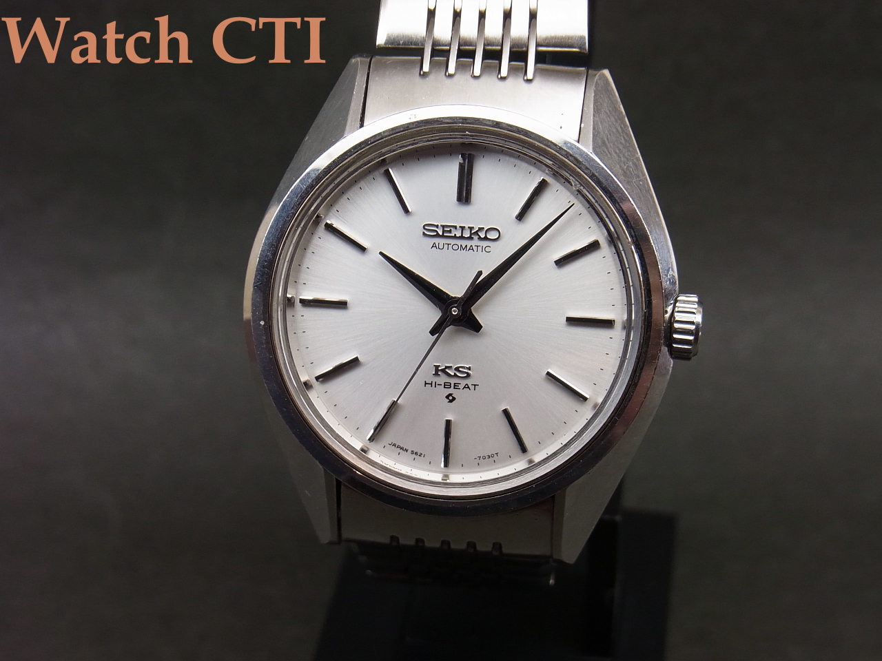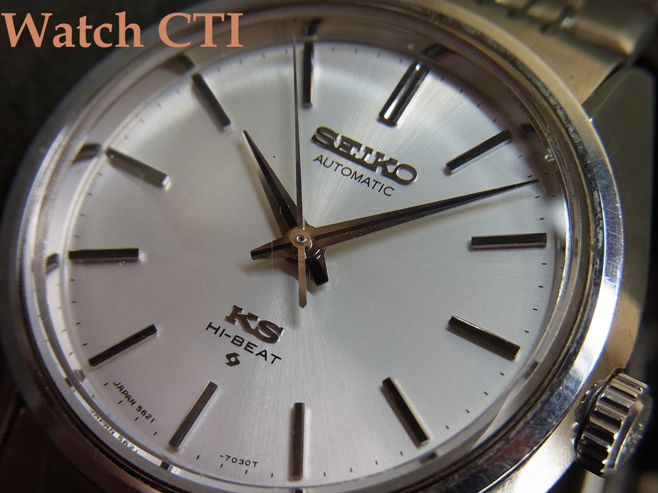 更には、この個体は同じく極上コンディションのKS純正ブレスレットも装着されており、ワンピースケースとのマッチングで実用使いには最高の組み合わせかと思います!もちろんケース外装等一切の磨きは入っておらず、9時側サイドにちょっと纏まったあたり傷が見えますがその他表面的こすれ等のみで、シャープなケースエッジが見て取れます!ガラスも僅かにヘアラインやチップがありますが視認性に係わる問題はございません。