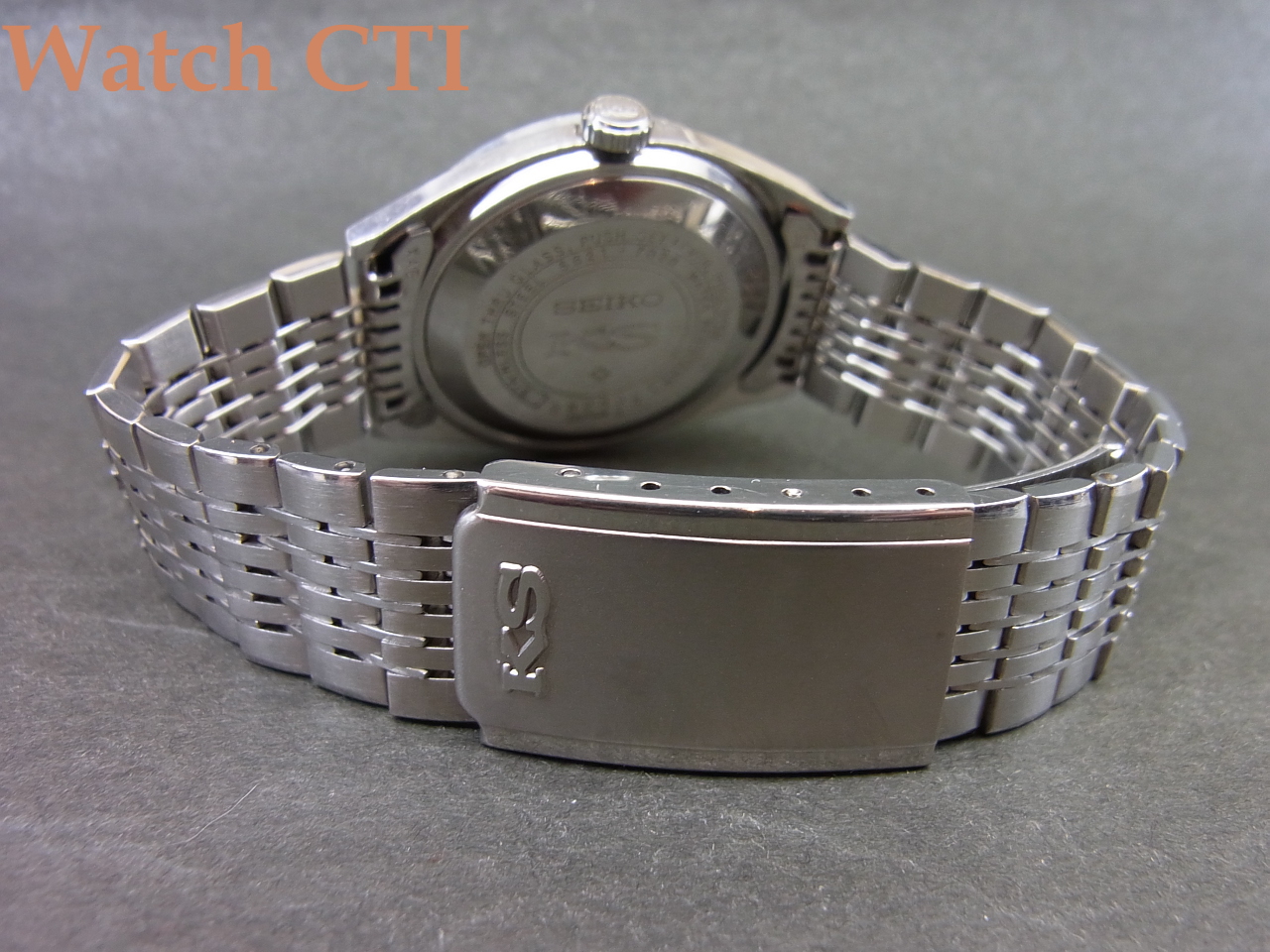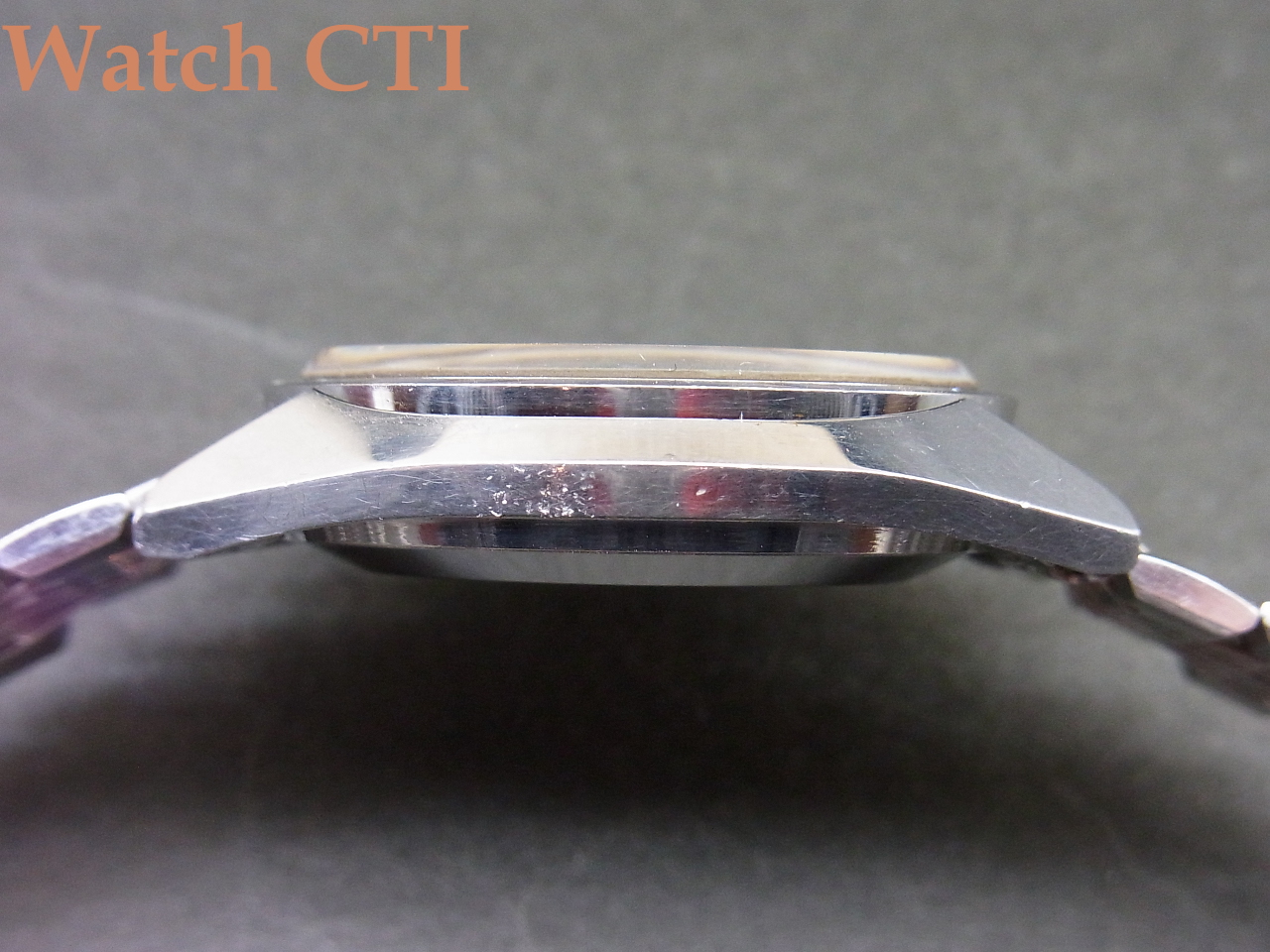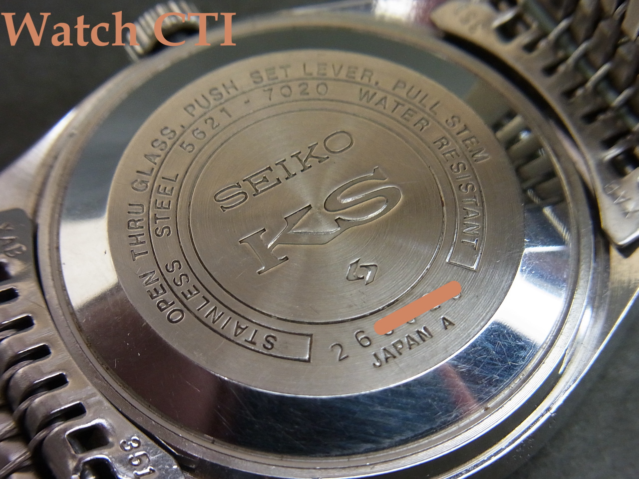 更には、この個体は同じく極上コンディションのKS純正ブレスレットも装着されており、ワンピースケースとのマッチングで実用使いには最高の組み合わせかと思います!もちろんケース外装等一切の磨きは入っておらず、9時側サイドにちょっと纏まったあたり傷が見えますがその他表面的こすれ等のみで、シャープなケースエッジが見て取れます!ガラスも僅かにヘアラインやチップがありますが視認性に係わる問題はございません。